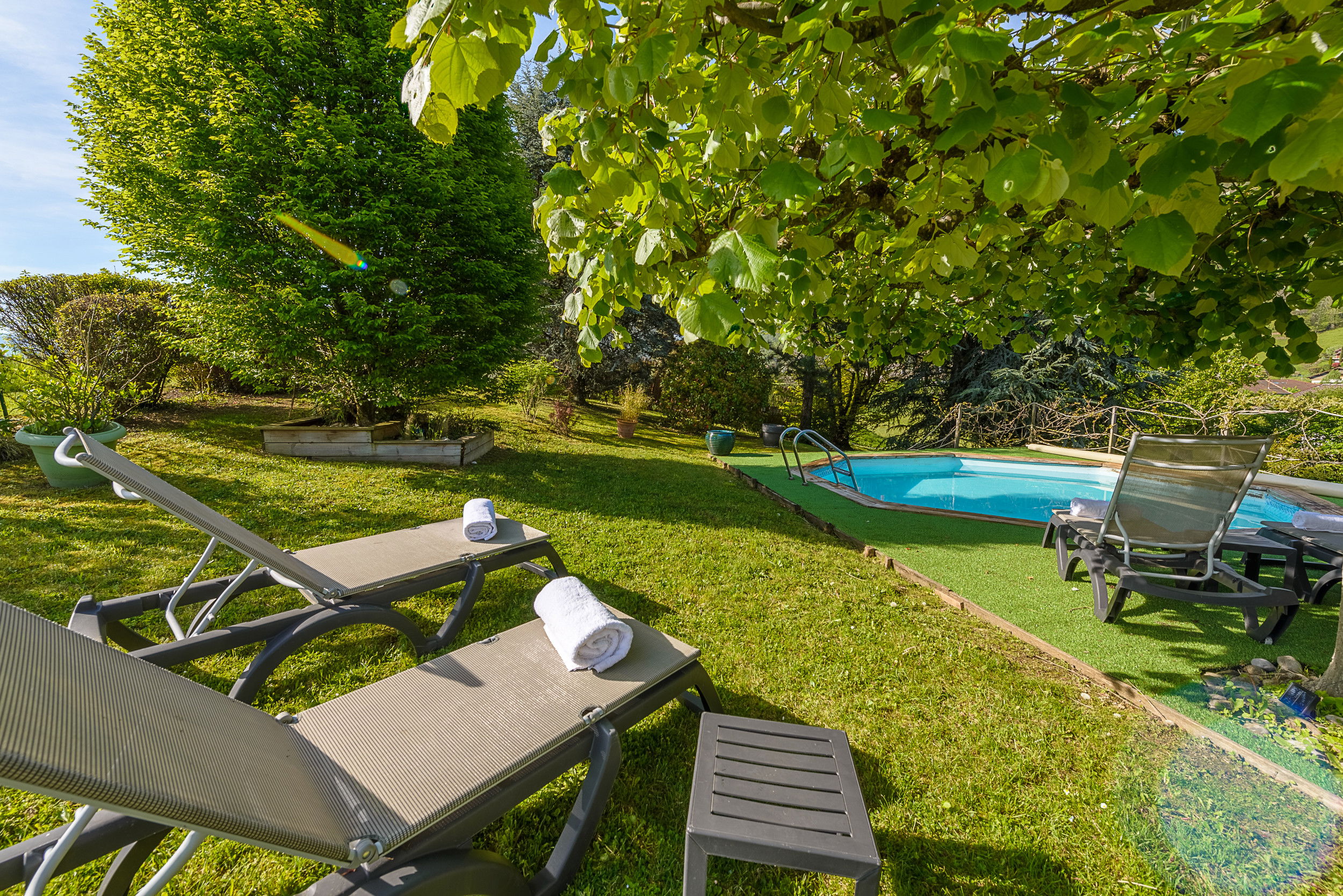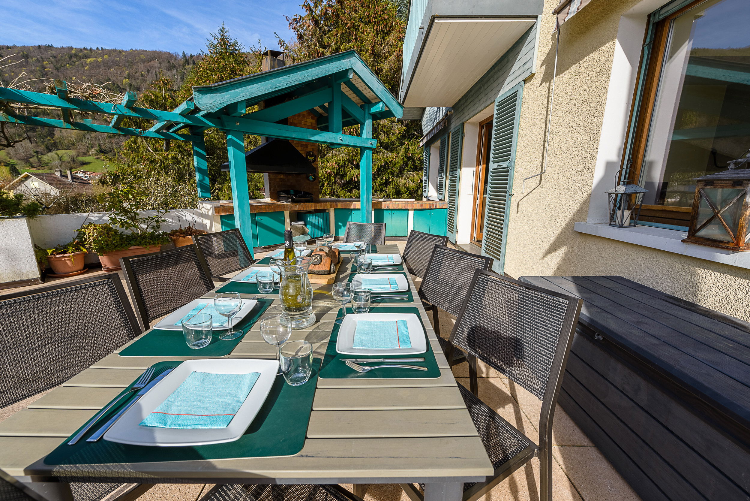 - Terrasse ombragée et aménagée avec grande table, salon de jardin, deux grands parasols et quatre transats