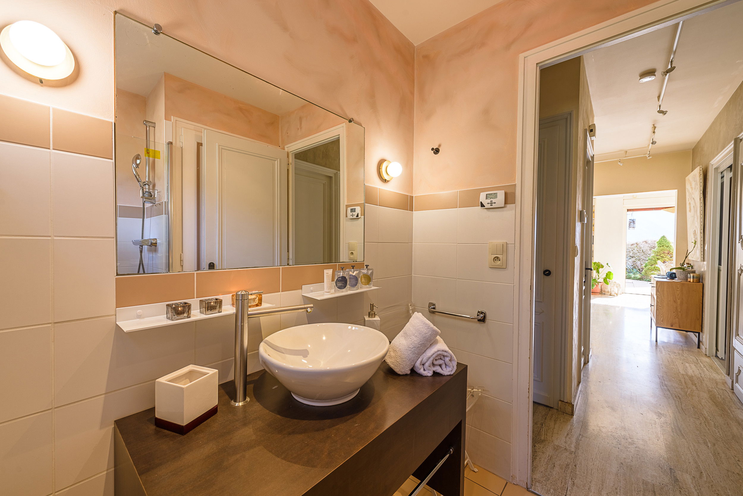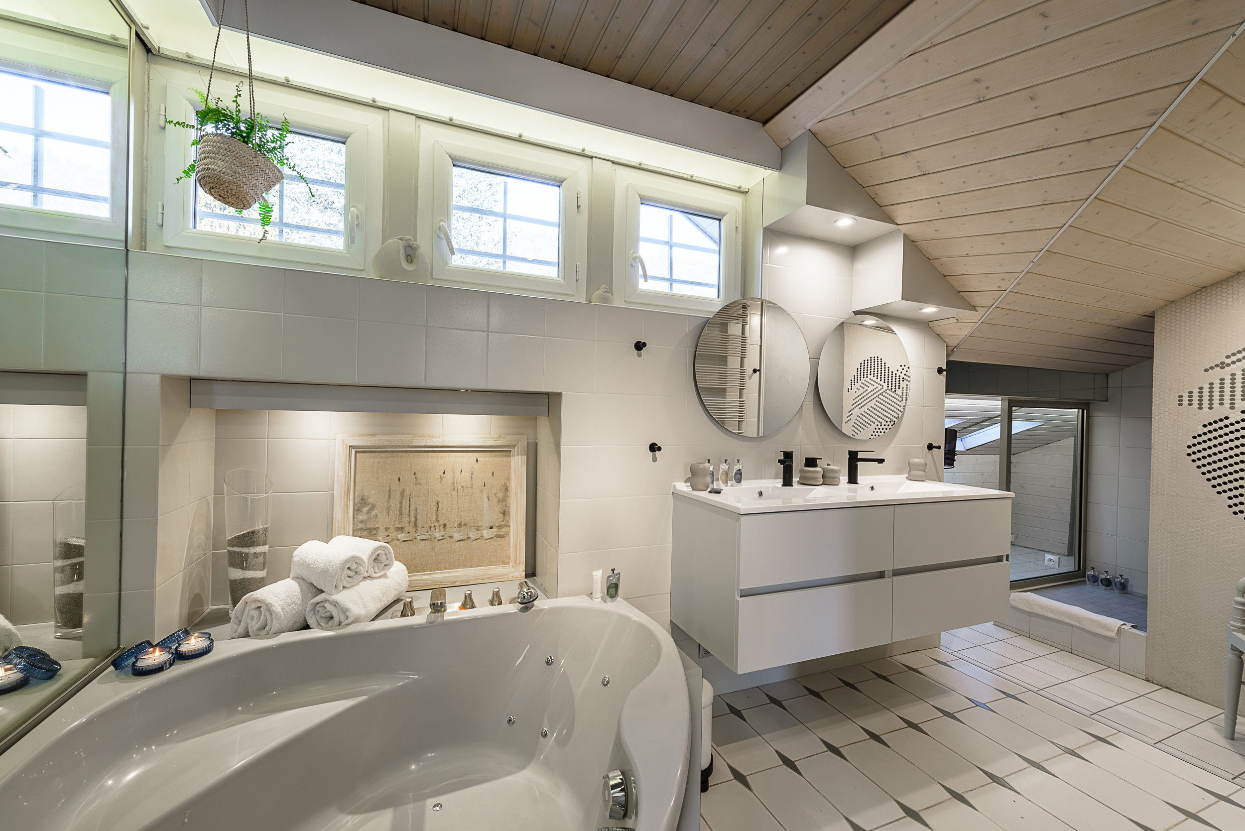 - Salle de bain avec douche et baignoire, deux vasques et espace de rangement