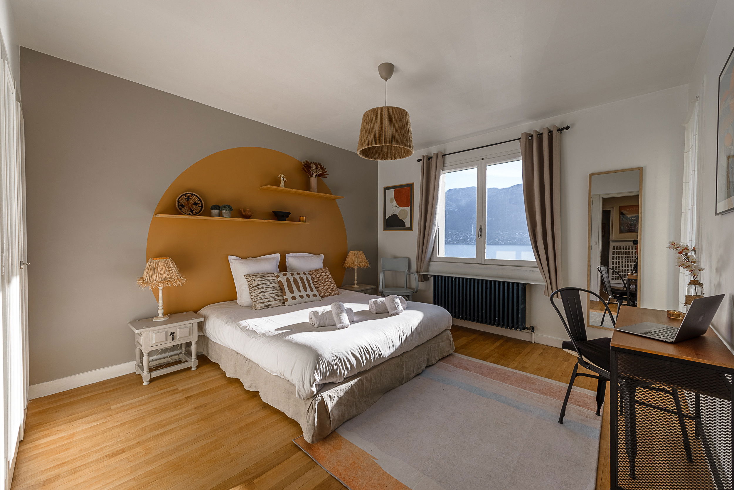 - Chambre n°3, Tournette : 1 lit double 160x200 avec accès balcon, salon de jardin avec vue unique sur le lac et les montagnes et placard de rangement (dressing)