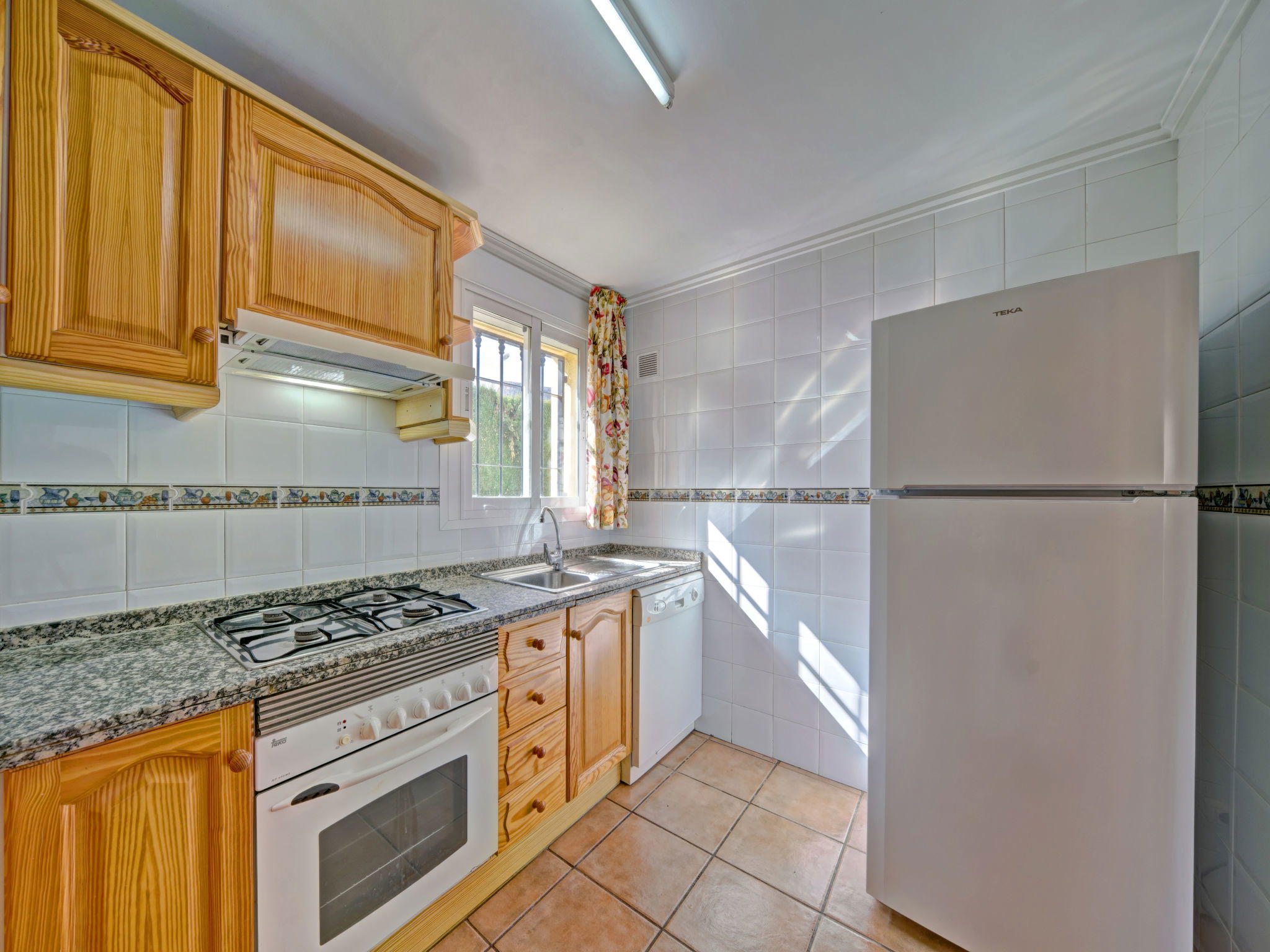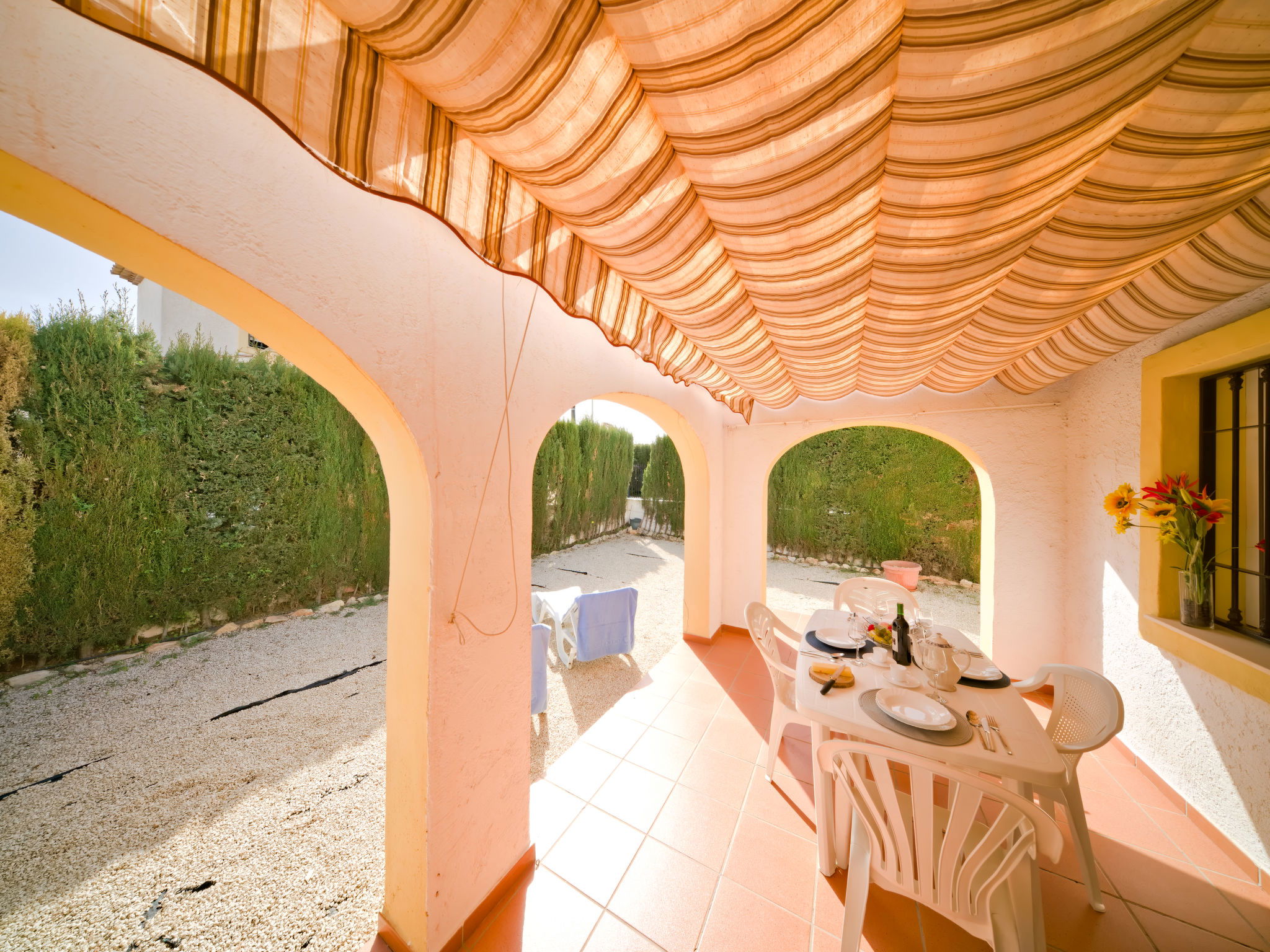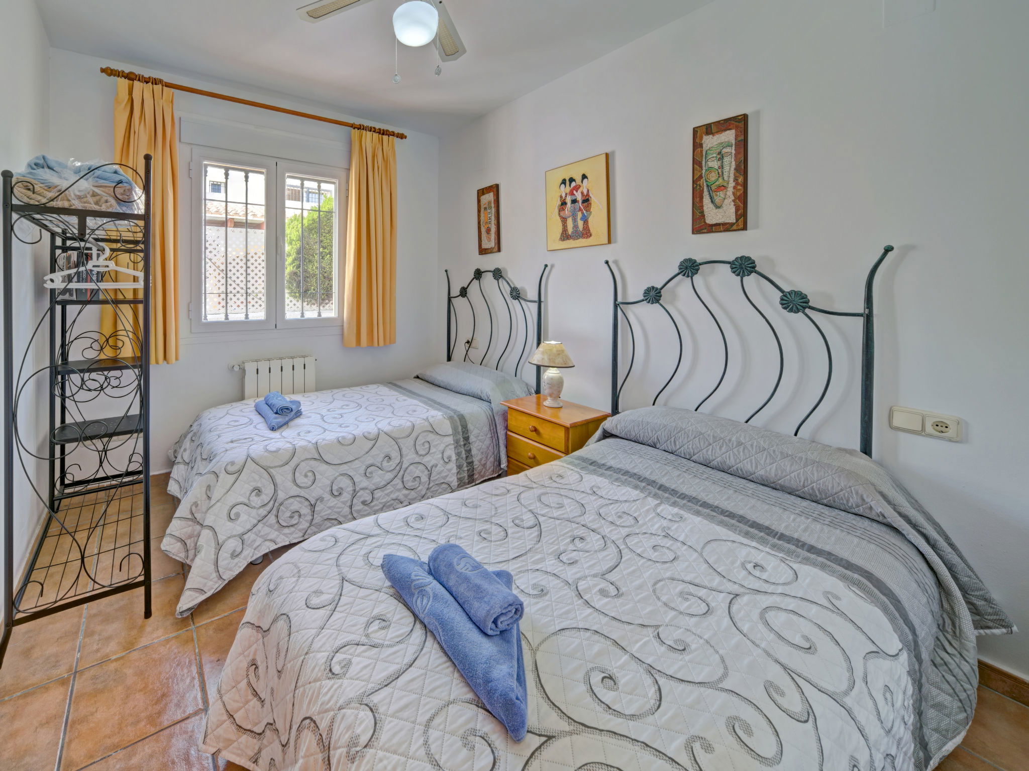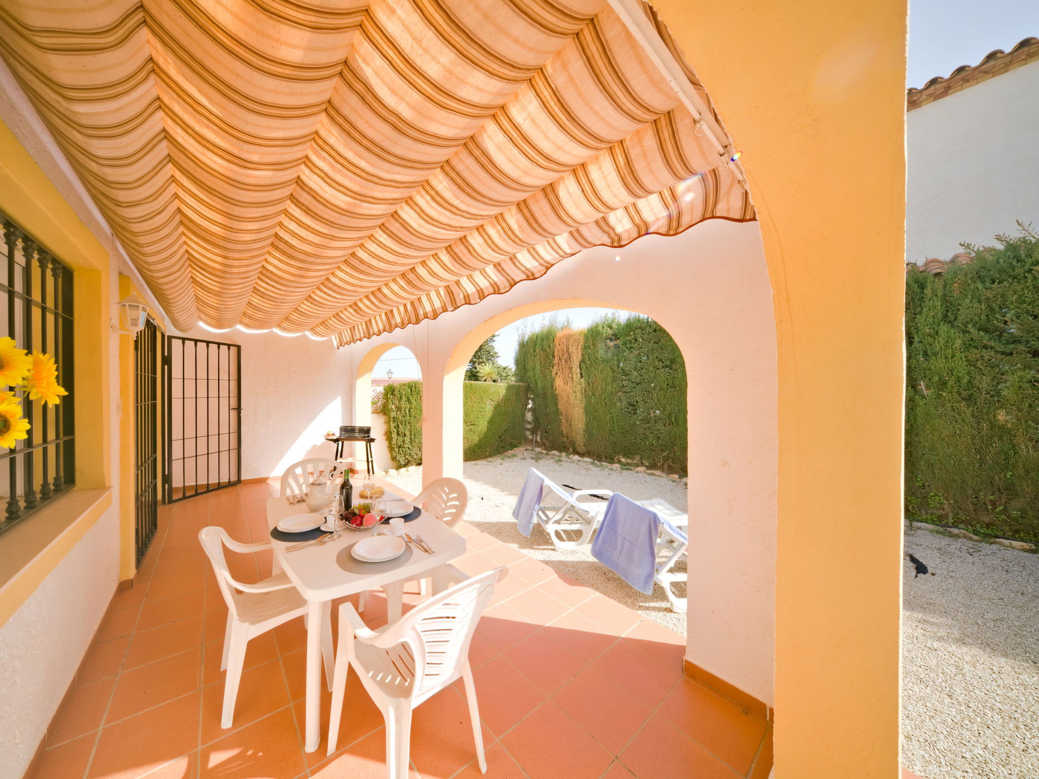 "Puerta de Calpe 31", maison jumelée 4 pièces 120 m2 sur 2 niveaux. Aménagement confortable: séjour/salle à manger avec 1 lit pliant (80 cm, longueur 180 cm), table pour les repas, TV, TV (satellite), Télévision numérique, air-conditionné et chauffage à air chaud. Sortie sur la terrasse. 1 chambre avec 2 lits (90 cm, longueur 190 cm). Cuisine (four, lave-vaisselle, 4 feux, grille-pain, bouilloire électrique, micro-ondes, congélateur, cafetière électrique). Douche/WC. À l'étage supérieur: 1 chambre avec 1 grand-lit (135 cm, longueur 190 cm), bain/bidet/WC, air-conditionné et chauffage à air chaud. Sortie sur la terrasse. 1 chambre avec 2 lits (90 cm, longueur 190 cm). Sortie sur le balcon. Balcon, terrasse. Meubles de terrasse, mobilier de balcon, barbecue (portable), chaises longues (2), réduit. A disposition: lave-linge, fer à repasser, chaise haute pour enfant, lit bébé jusqu'à 2 ans, sèche-cheveux. Internet (Connexion WIFI, gratuit). Place de parking No 51 (1 Voiture). Adapté(e) aux familles. Maximum 1 animal/ chien autorisé. AT-438386-A // Reg. Nr.: ESFCTU00000302900055014500000000000000000AT-438386-A4