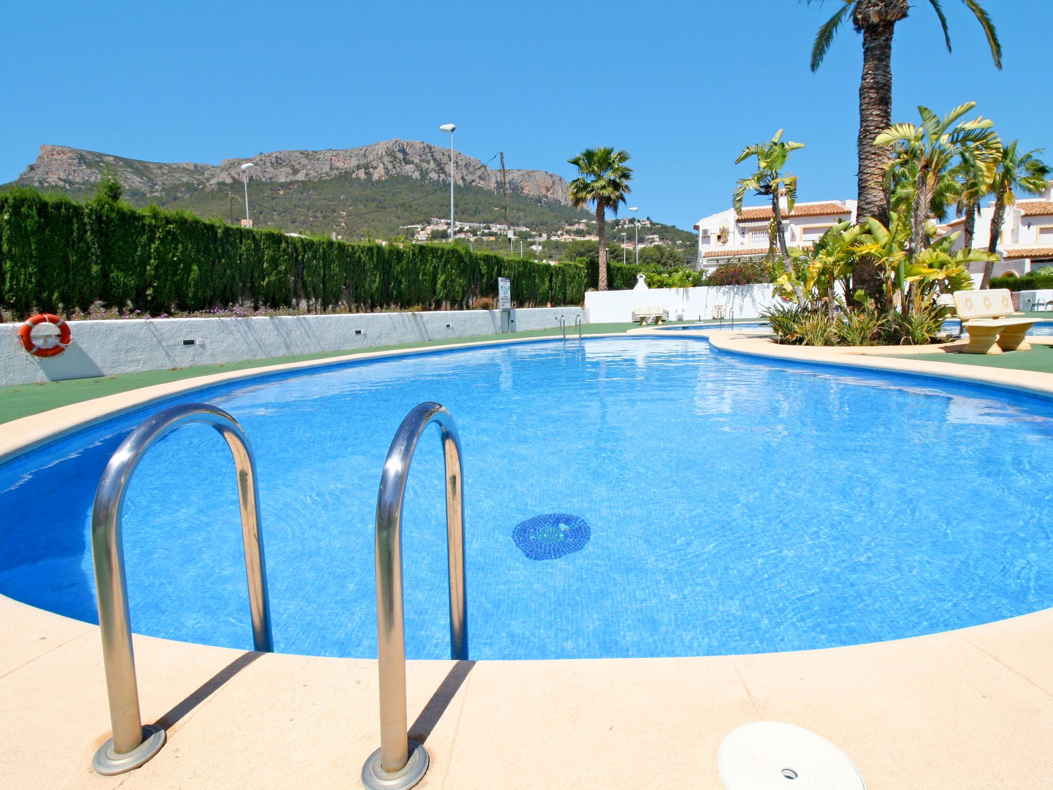 Maison mitoyenne "Residencial Puerta de Calpe". 32 maisons dans le même complexe de vacances. À 1 km du centre de Calpe, à 60 km du centre d'Alicante, à 120 km du centre de Valencia, à 1.8 km de la mer, à 1.8 km de la plage. En commun: 2 piscines en forme d’haricot (disponibilité saisonnière: 01.Jun. - 30.Sep.). Bassin pour les enfants, douche extérieure. A usage privé: terrain (clôturé), place de parking sur le terrain. Supermarché 1 km, restaurant 1 km, arrêt de bus 750 m, plage de sable "Playa del Arenal" 2 km. Tennis 1.5 km. Le propriétaire n'accepte pas les groupes de jeunes.