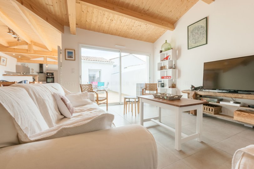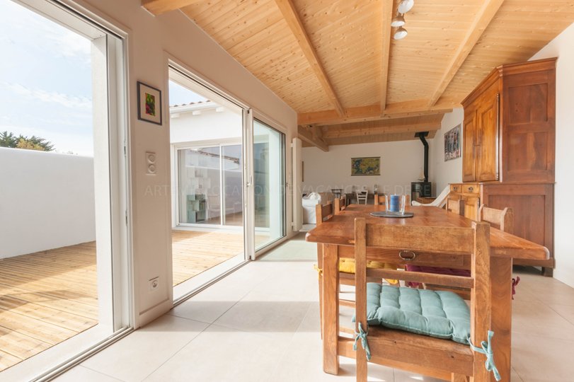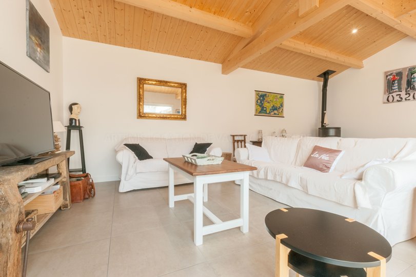 Vous apprécierez le grand séjour lumineux de 30m², éclairé naturellement par une baie vitrée orientée sud ouest et donnant sur la terrasse en bois, et sa cuisine équipée ouverte sur la salle à manger.