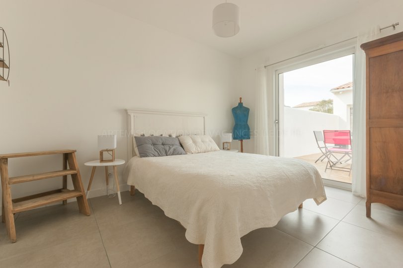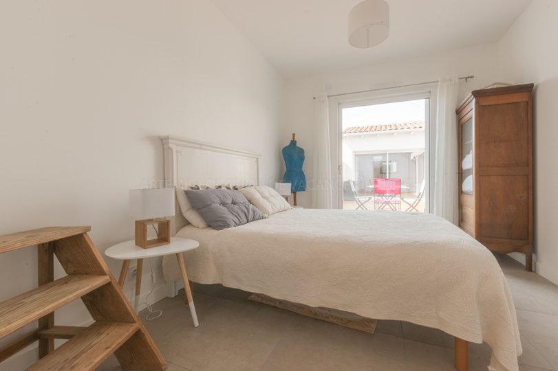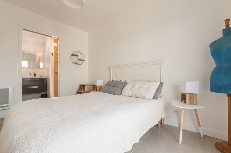 La chambre parentale est aménagée avec un lit de 160 cm et une salle d’eau, ouvrant sur la terrasse.