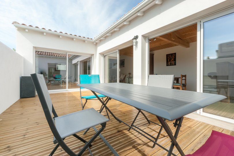 À l’extérieur, vous pourrez profiter de la terrasse orientée sud-ouest et son mobilier pour déjeuner en toute tranquillité au soleil ou à l’ombre du parasol.