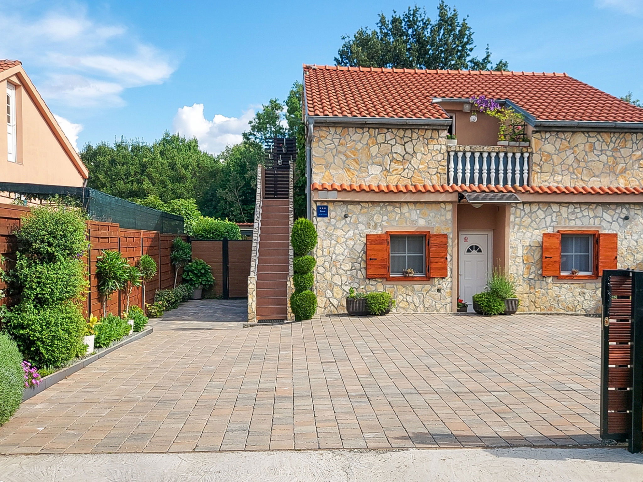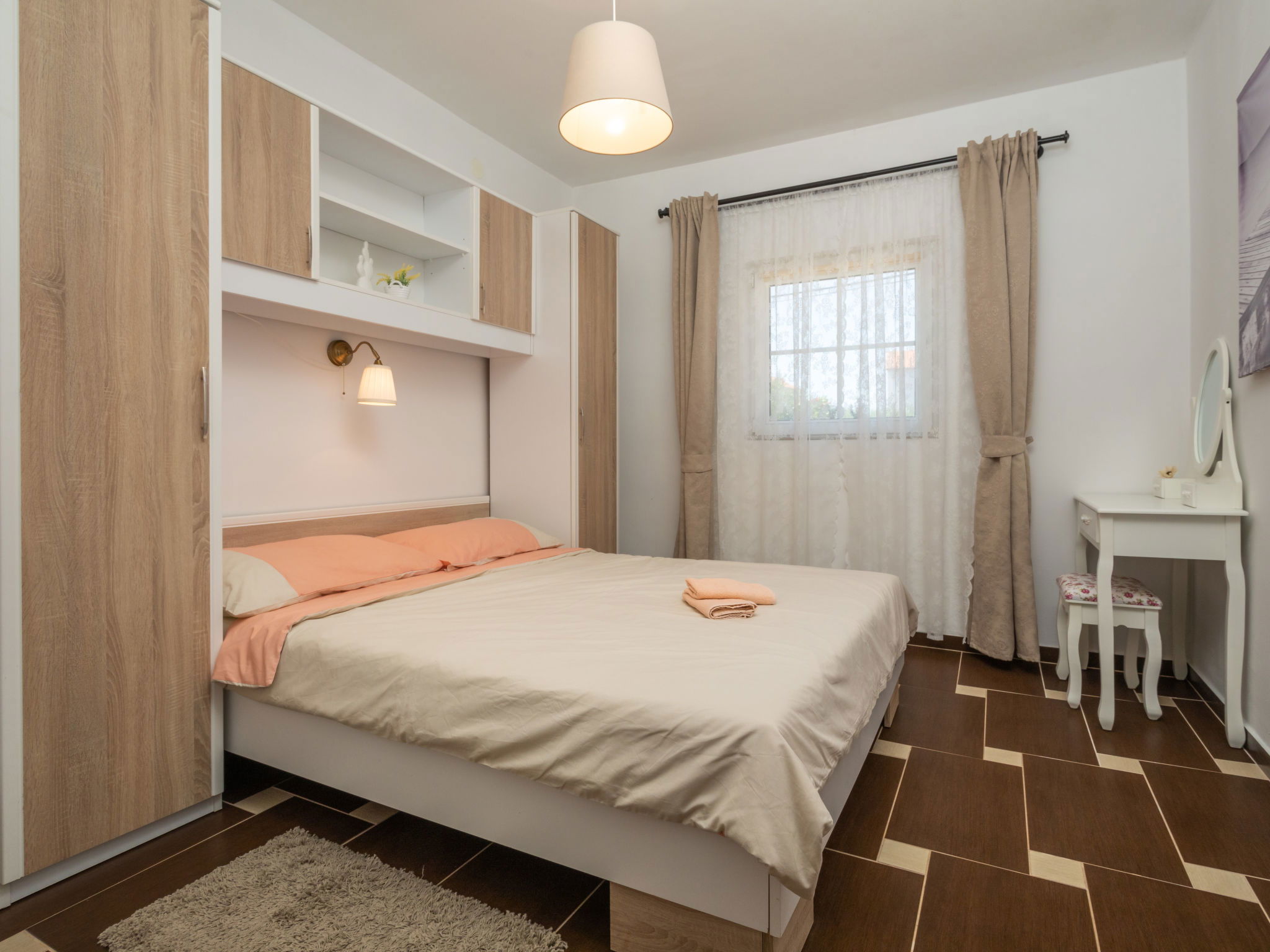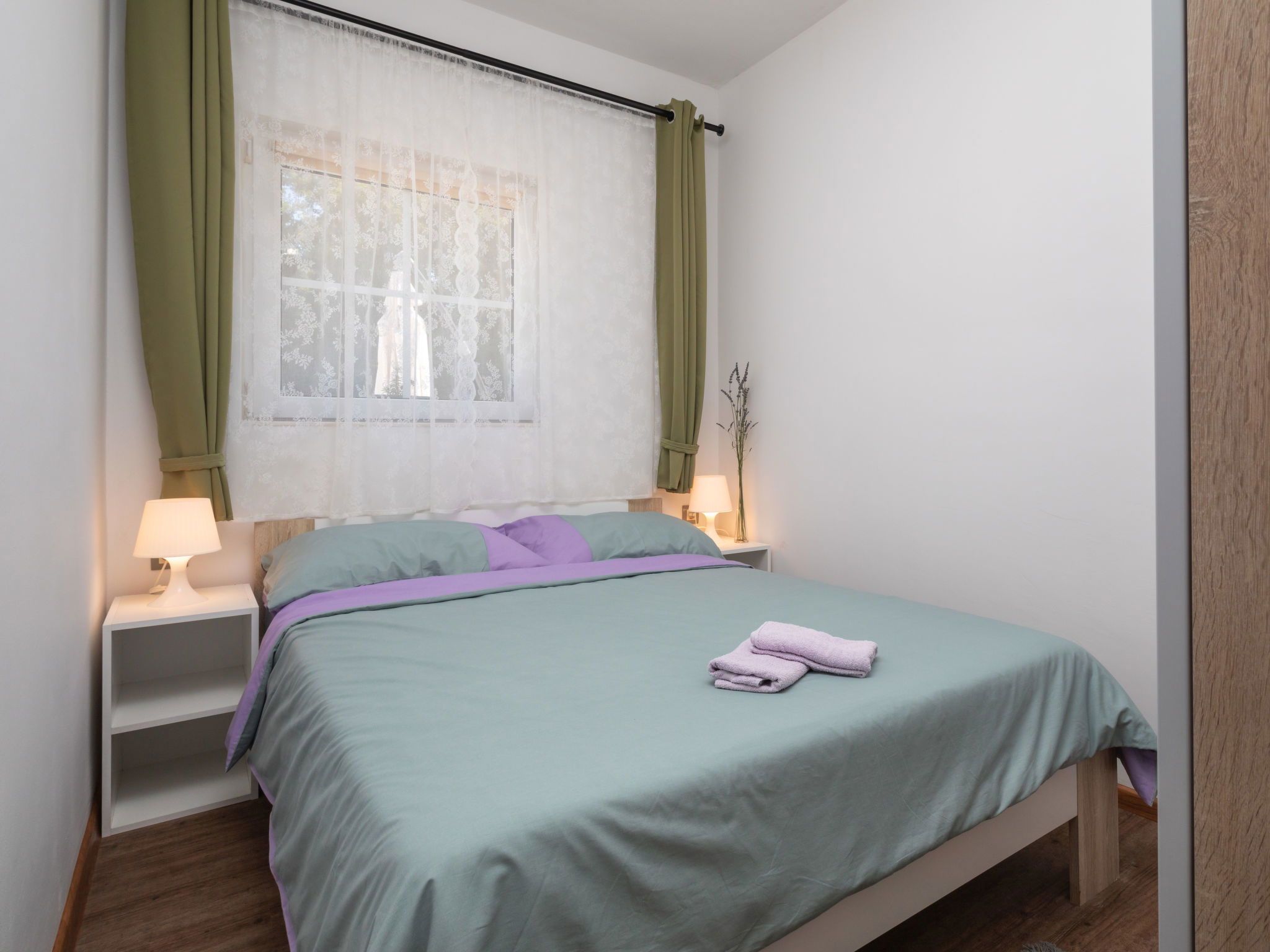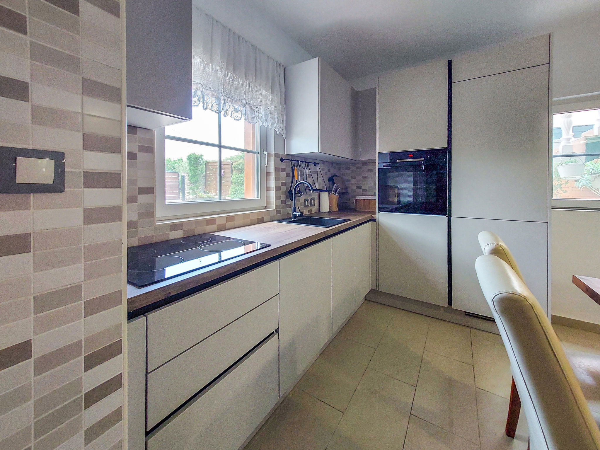 Maison 6 pièces 110 m2 sur 2 niveaux. Séjour/salle à manger avec TV (satellite) et air-conditionné. Sortie sur la terrasse. 1 chambre avec 1 grand-lit (160 cm, longueur 200 cm). 2 chambres, chaque chambre avec: 1 grand-lit (140 cm, longueur 200 cm). Cuisine ouverte (four, lave-vaisselle, 4 plaques vitrocéramiques, grille-pain, bouilloire électrique, micro-ondes, congélateur, cafetière électrique). 2 douches/WC. À l'étage supérieur: (escalier extérieur) séjour/salle à manger mansardé avec 1 divan-lit double (140 cm, longueur 200 cm), TV (satellite) et air-conditionné. Sortie sur le balcon. 1 chambre, mansardée avec 1 grand-lit (160 cm, longueur 200 cm). Cuisine ouverte (2 plaques de cuisson, grille-pain, bouilloire électrique, cafetière électrique). Douche/WC. Chauffage (en sus), air-conditionné (en sus). Balcon 4 m2. Chaises longues. A disposition: moustiquaire, lit bébé. Internet (Connexion WIFI, gratuit). Veuillez noter: maison non-fumeur. Maximum 3 animaux/ chiens autorisés. Pas de liaison interne entre les étages. Si le nombre d’occupants n’atteint pas le maximum, un étage restera fermé.