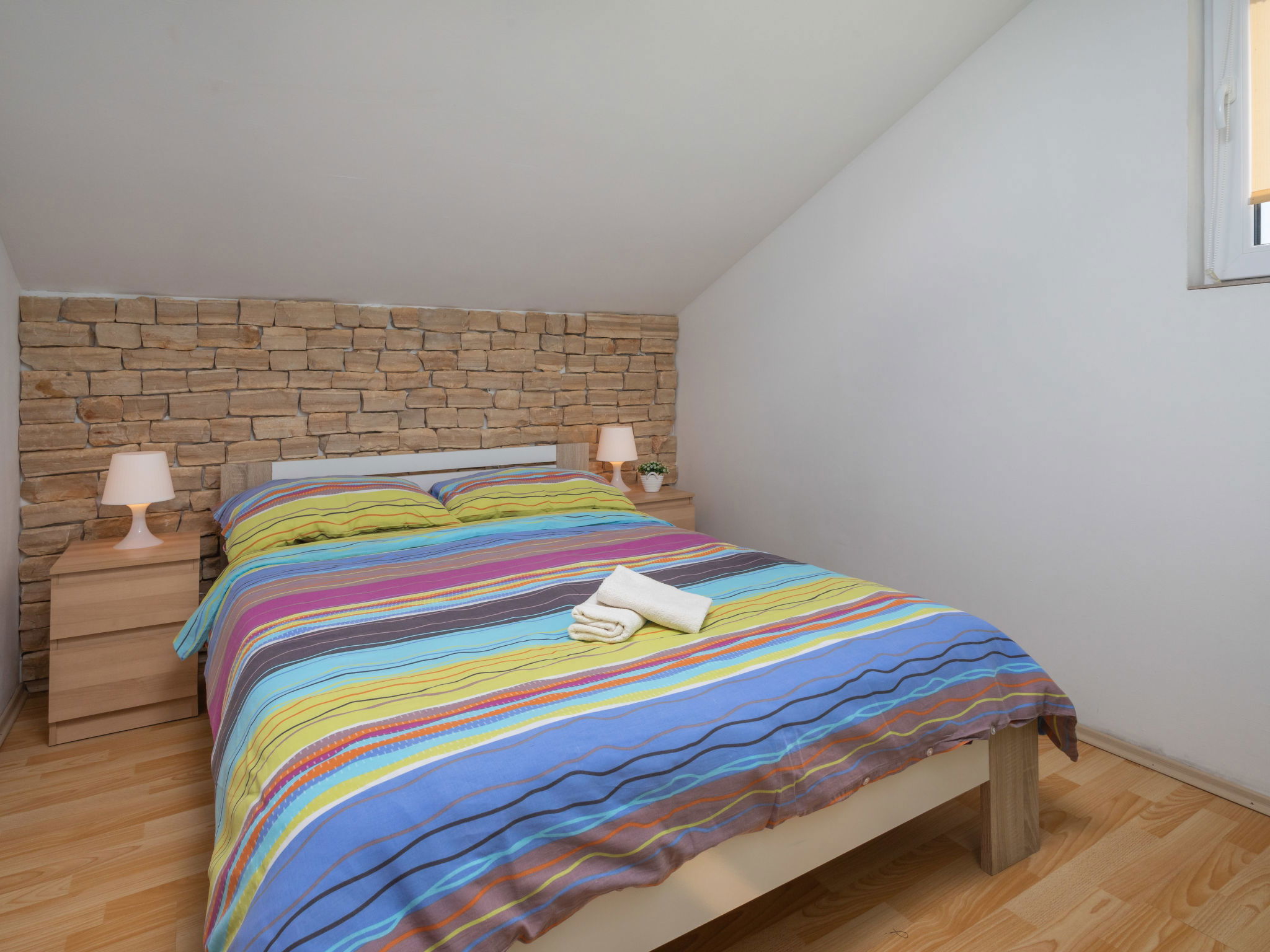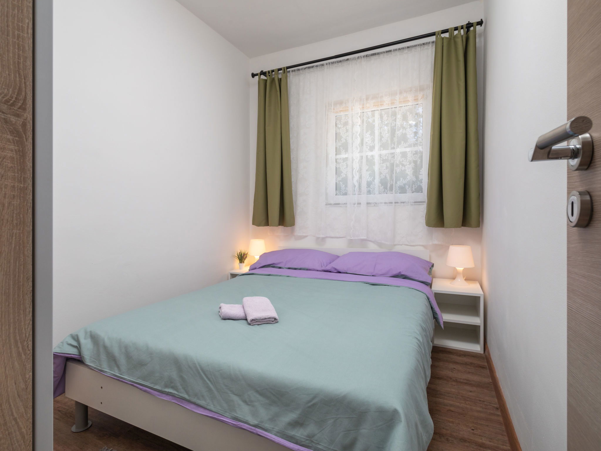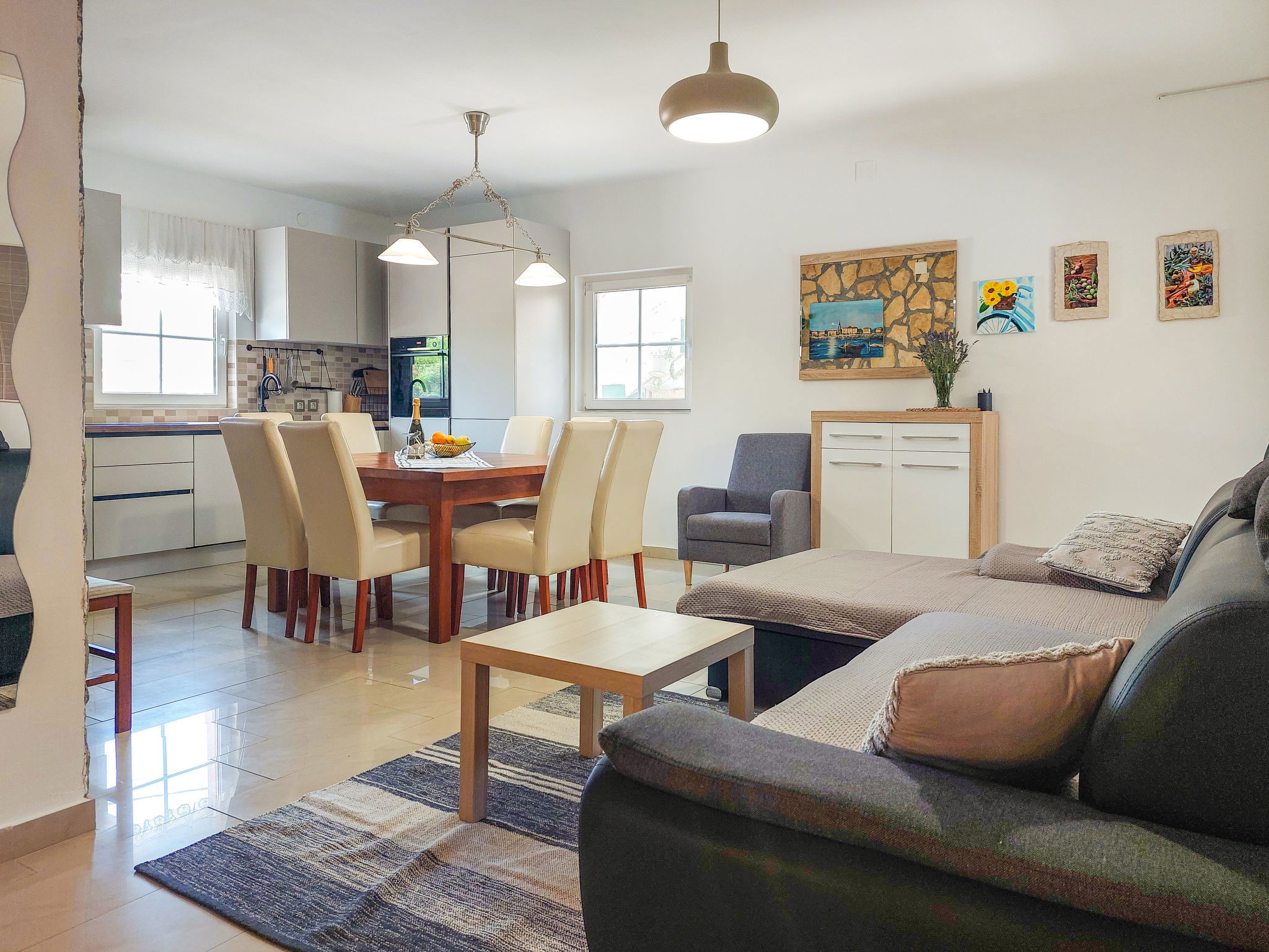Maison 6 pièces 110 m2 sur 2 niveaux. Séjour/salle à manger avec TV (satellite) et air-conditionné. Sortie sur la terrasse. 1 chambre avec 1 grand-lit (160 cm, longueur 200 cm). 2 chambres, chaque chambre avec: 1 grand-lit (140 cm, longueur 200 cm). Cuisine ouverte (four, lave-vaisselle, 4 plaques vitrocéramiques, grille-pain, bouilloire électrique, micro-ondes, congélateur, cafetière électrique). 2 douches/WC. À l'étage supérieur: (escalier extérieur) séjour/salle à manger mansardé avec 1 divan-lit double (140 cm, longueur 200 cm), TV (satellite) et air-conditionné. Sortie sur le balcon. 1 chambre, mansardée avec 1 grand-lit (160 cm, longueur 200 cm). Cuisine ouverte (2 plaques de cuisson, grille-pain, bouilloire électrique, cafetière électrique). Douche/WC. Chauffage (en sus), air-conditionné (en sus). Balcon 4 m2. Chaises longues. A disposition: moustiquaire, lit bébé. Internet (Connexion WIFI, gratuit). Veuillez noter: maison non-fumeur. Maximum 3 animaux/ chiens autorisés. Pas de liaison interne entre les étages. Si le nombre d’occupants n’atteint pas le maximum, un étage restera fermé.