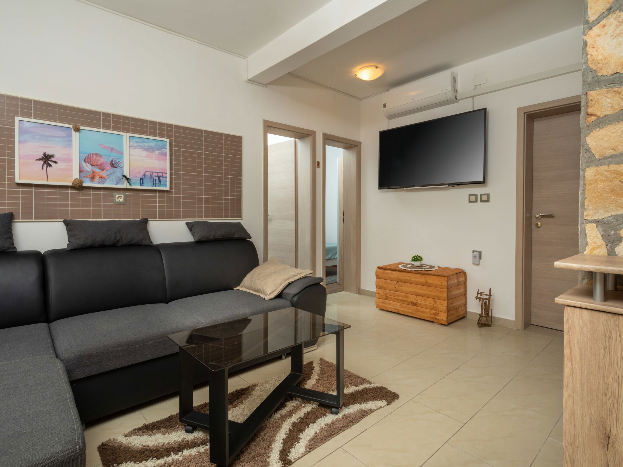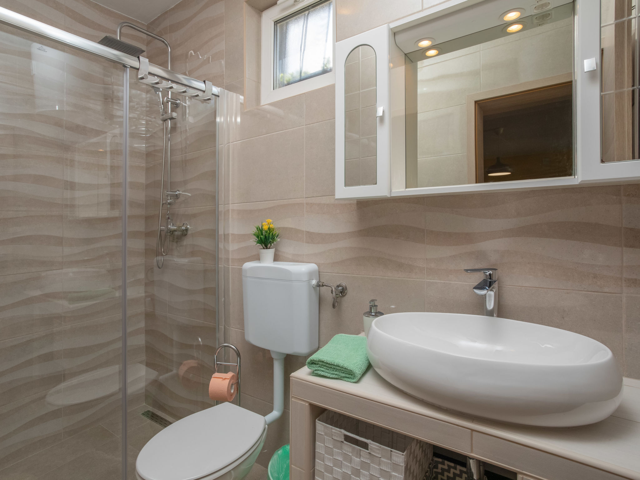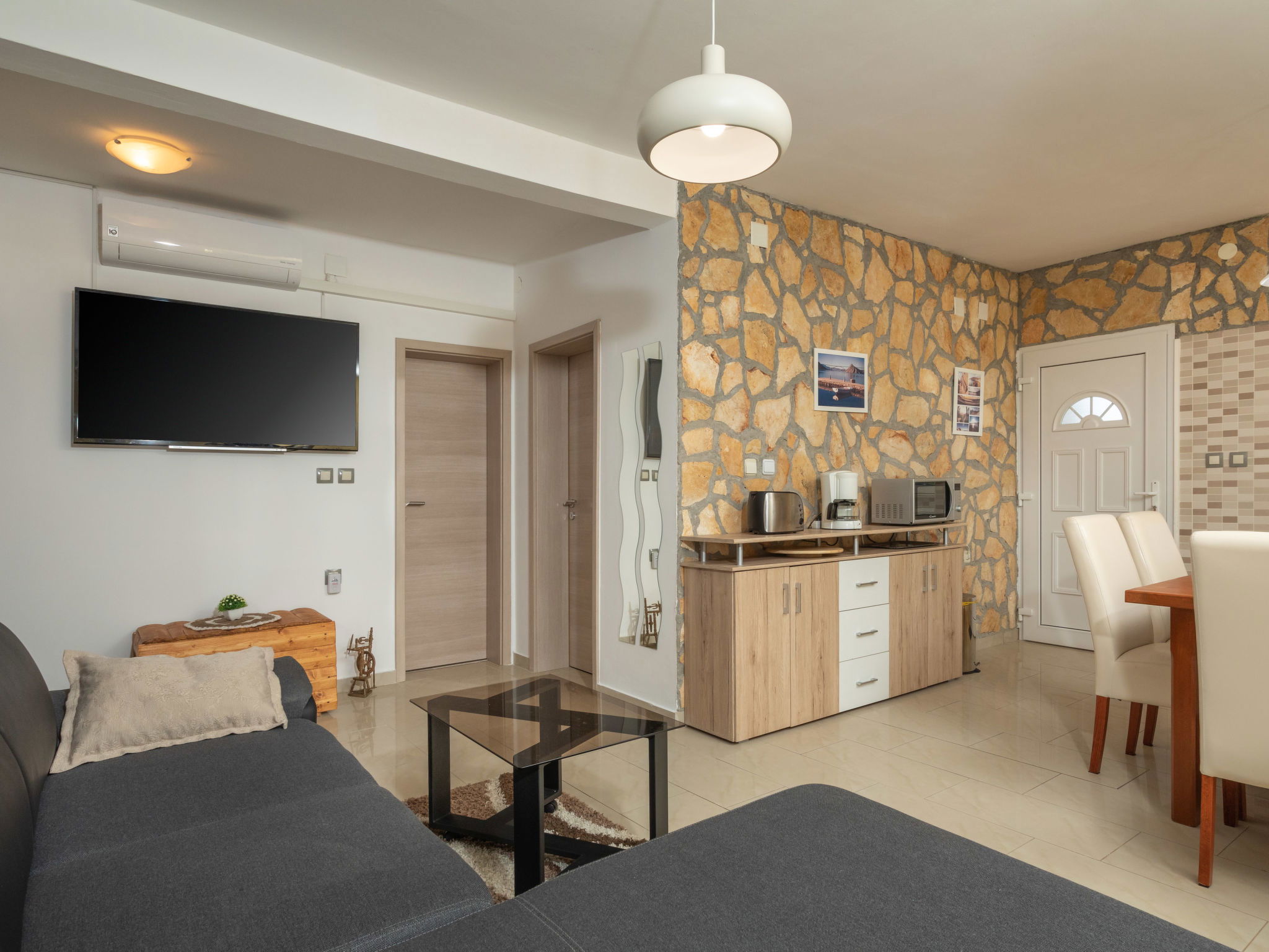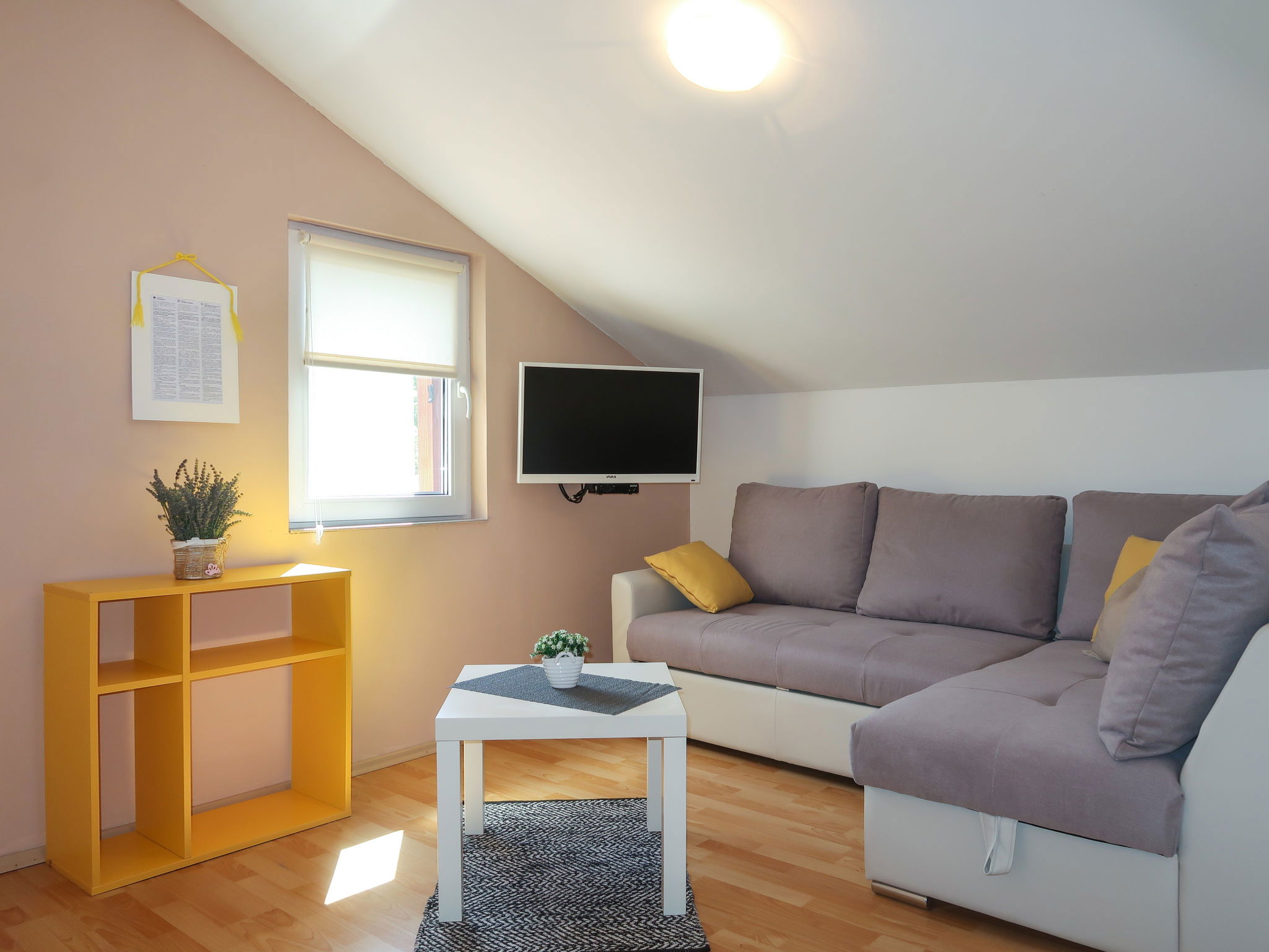 Maison 6 pièces 110 m2 sur 2 niveaux. Séjour/salle à manger avec TV (satellite) et air-conditionné. Sortie sur la terrasse. 1 chambre avec 1 grand-lit (160 cm, longueur 200 cm). 2 chambres, chaque chambre avec: 1 grand-lit (140 cm, longueur 200 cm). Cuisine ouverte (four, lave-vaisselle, 4 plaques vitrocéramiques, grille-pain, bouilloire électrique, micro-ondes, congélateur, cafetière électrique). 2 douches/WC. À l'étage supérieur: (escalier extérieur) séjour/salle à manger mansardé avec 1 divan-lit double (140 cm, longueur 200 cm), TV (satellite) et air-conditionné. Sortie sur le balcon. 1 chambre, mansardée avec 1 grand-lit (160 cm, longueur 200 cm). Cuisine ouverte (2 plaques de cuisson, grille-pain, bouilloire électrique, cafetière électrique). Douche/WC. Chauffage (en sus), air-conditionné (en sus). Balcon 4 m2. Chaises longues. A disposition: moustiquaire, lit bébé. Internet (Connexion WIFI, gratuit). Veuillez noter: maison non-fumeur. Maximum 3 animaux/ chiens autorisés. Pas de liaison interne entre les étages. Si le nombre d’occupants n’atteint pas le maximum, un étage restera fermé.