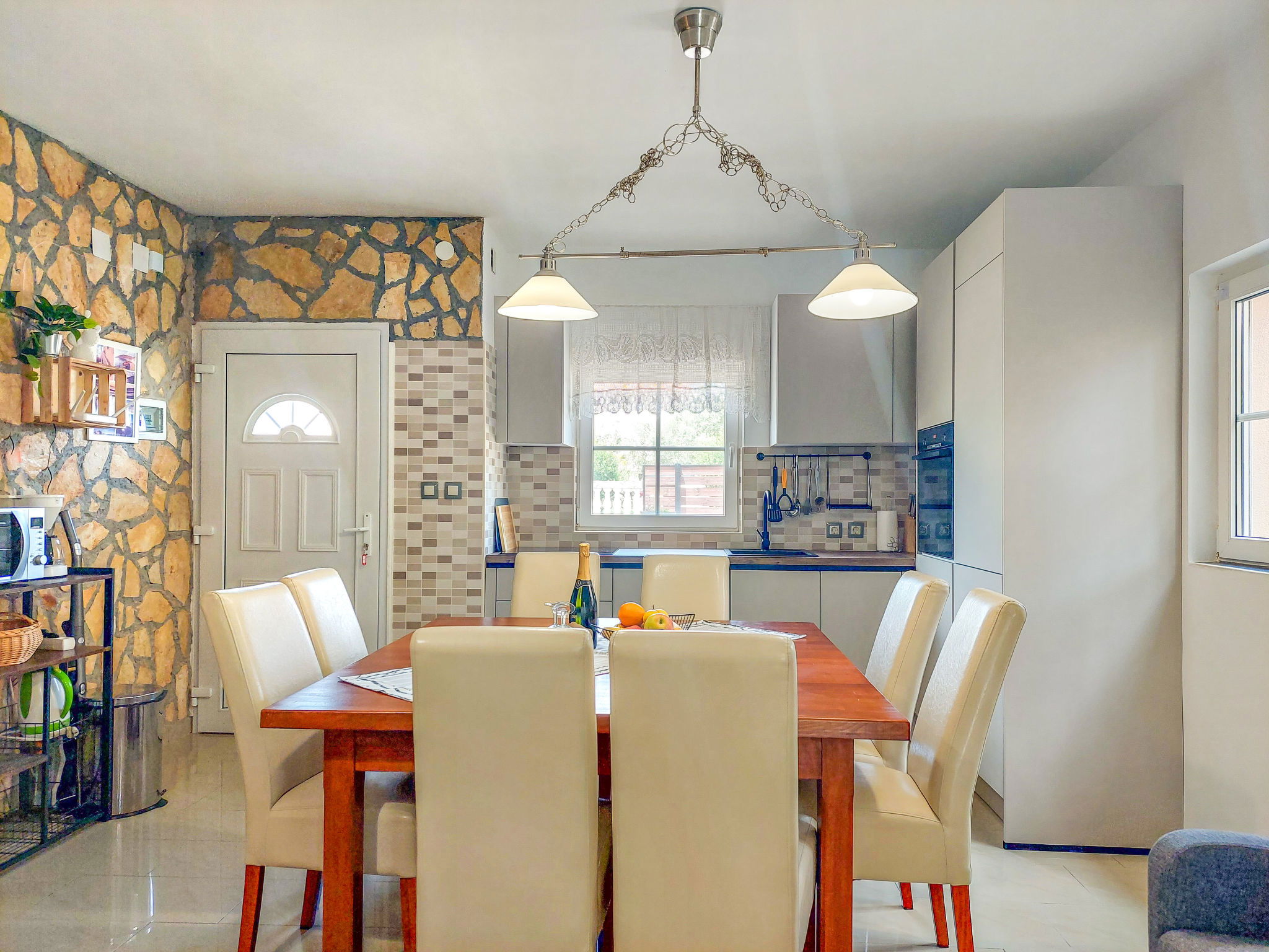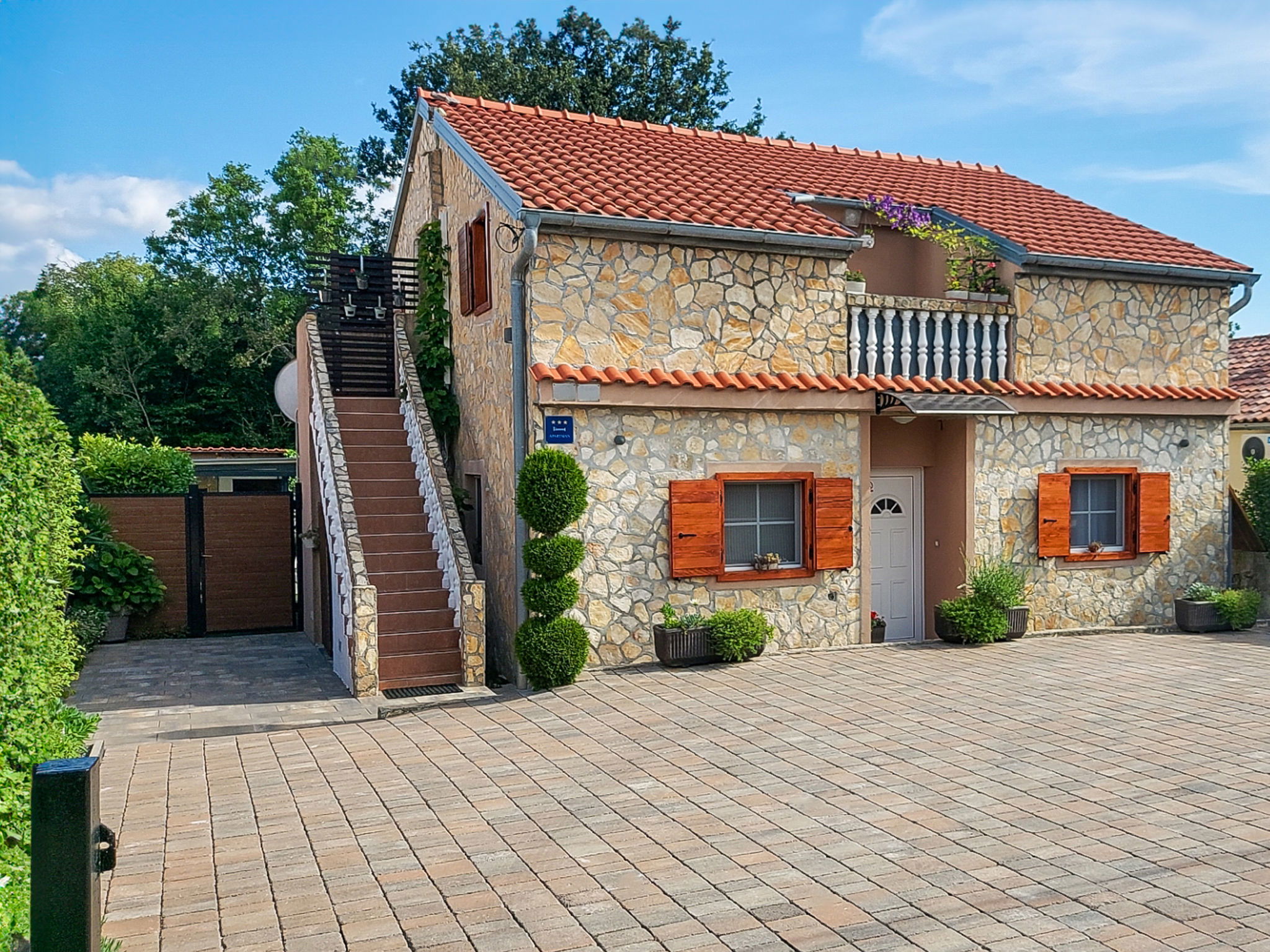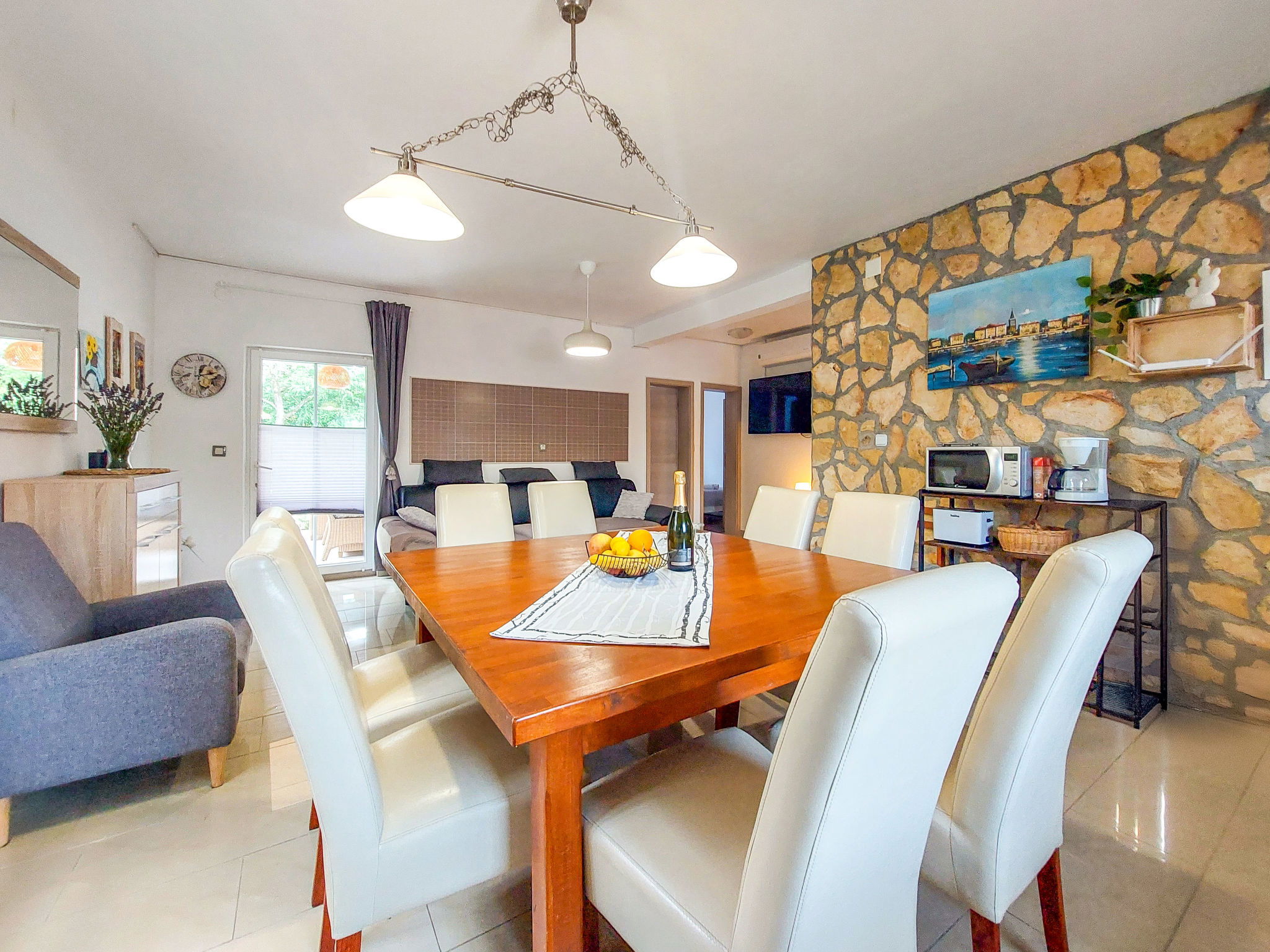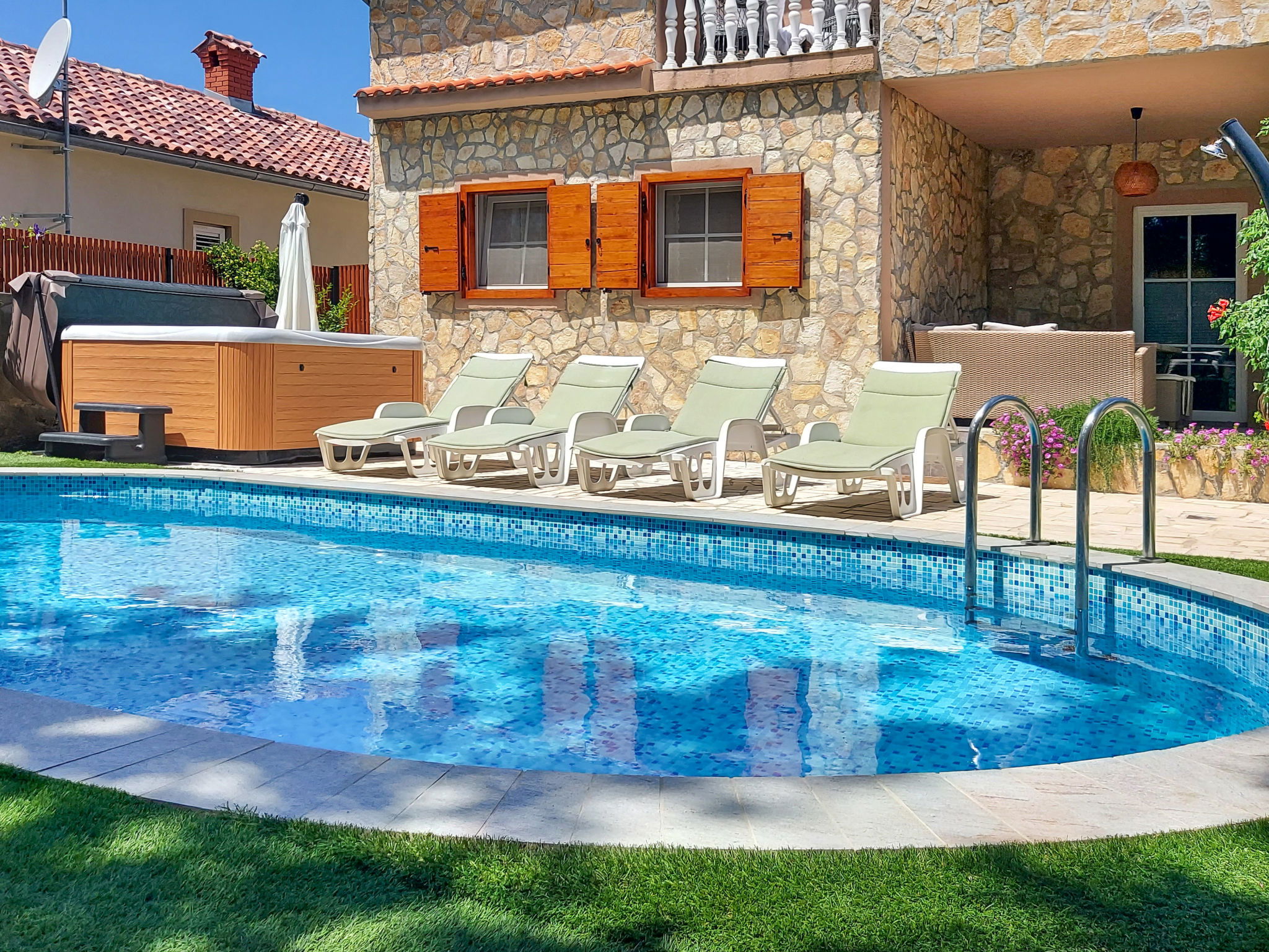 Maison "Mikac", de 2 étages. Dans le hameau de Županje, à 12 km du centre de Malinska, à 3 km du centre de Šilo, à 13 km du centre de Vrbnik, à 3.1 km de la mer, à 3.1 km de la plage. A usage privé: terrain 400 m2 (clôturé), piscine (7 x 3 m, profondeur 120 cm, disponibilité saisonnière: 15.Mar. - 15.Nov.). Douche extérieure, bain à remous , terrasse (9 m2), meubles de jardin, barbecue, entretien de la piscine par le propriétaire/jardinier. Infrastructures de la Maison: accès internet, sauna, lave-linge. Place de parking (pour 5 voitures) sur le terrain. Magasins 1.4 km, arrêt de bus 3.5 km, plage de sable 4 km plage de graviers 3.1 km. Le propriétaire n'accepte pas les groupes de jeunes. Veuillez noter: le propriétaire habite dans la même maison. Aéroport 16 km de la maison.