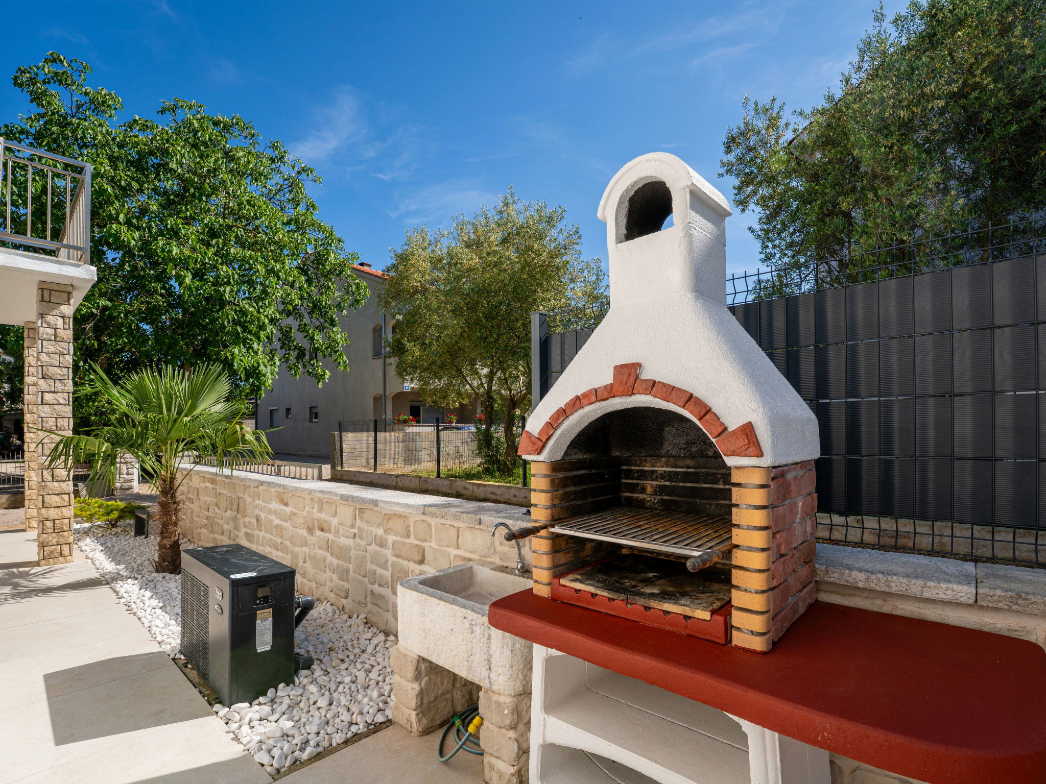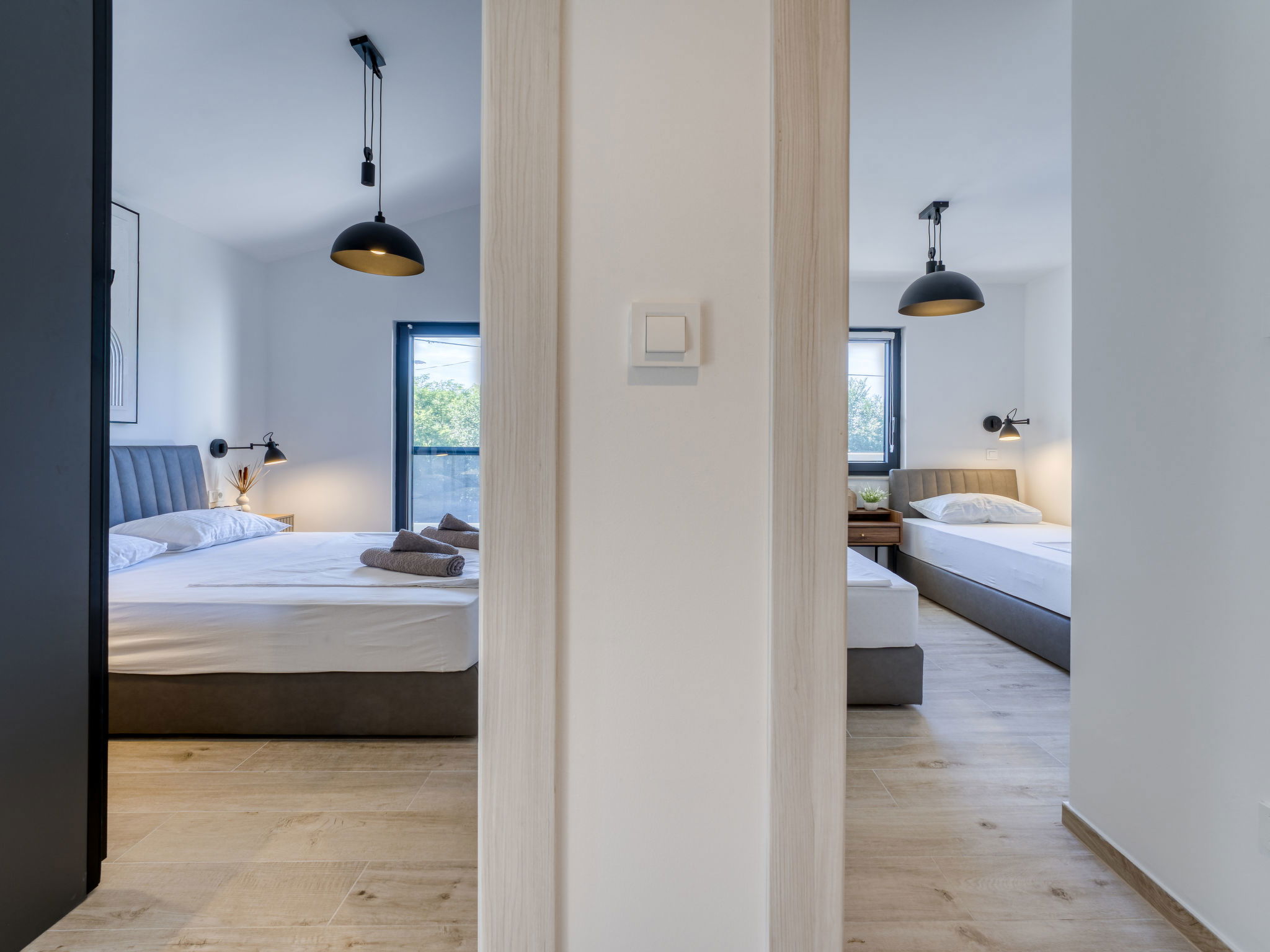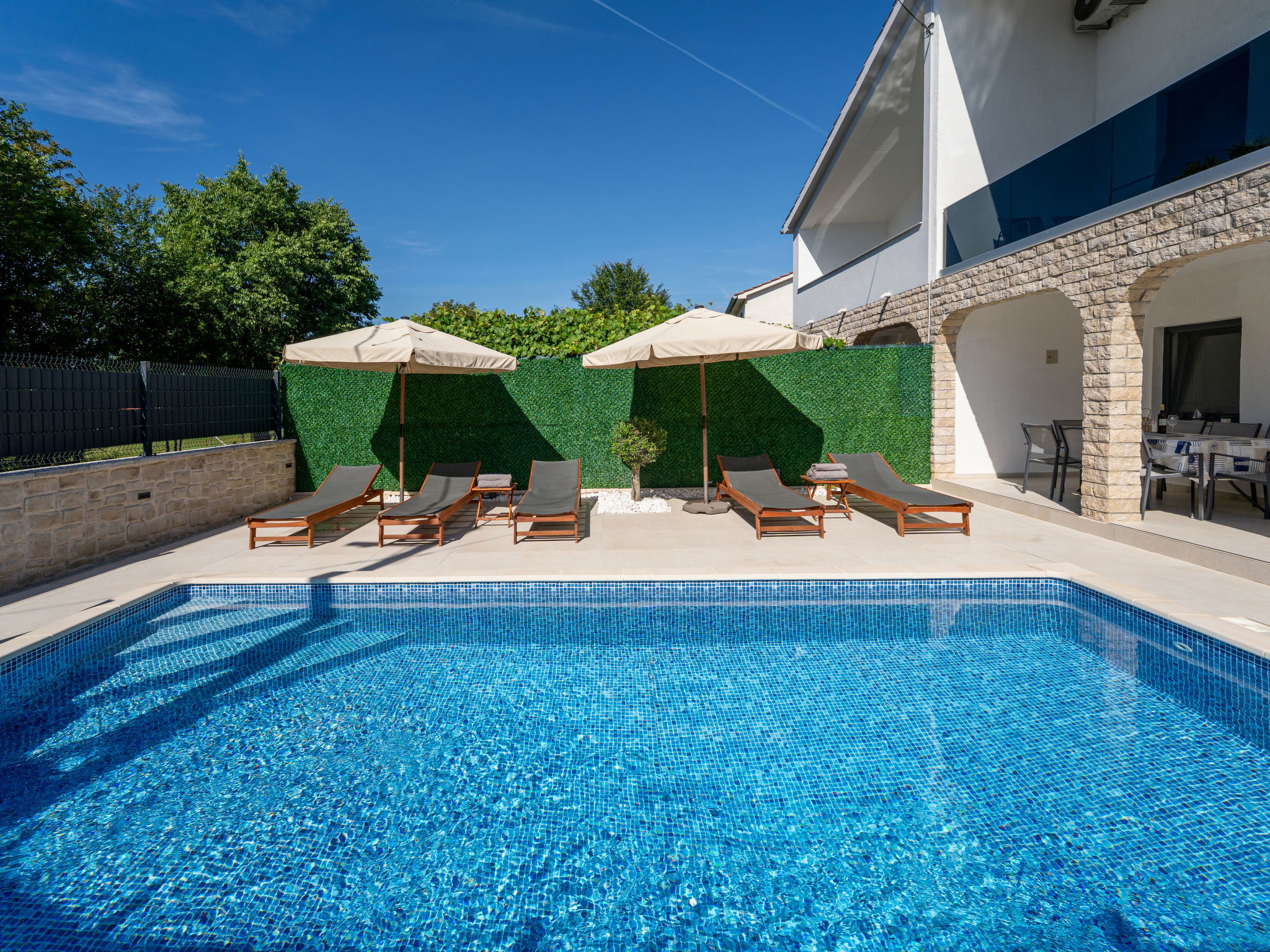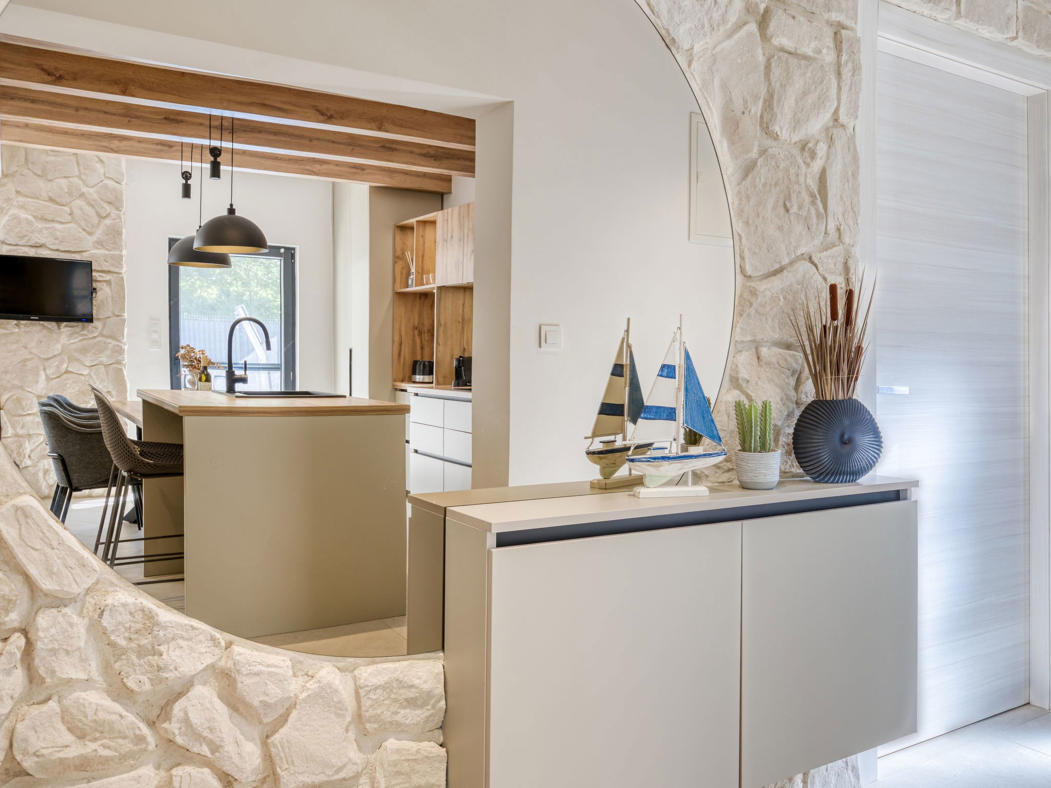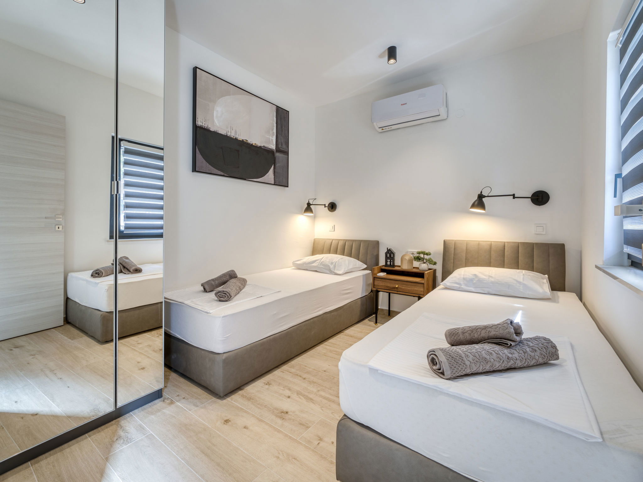 Maison jumelée "Domagoj". Dans le hameau de Sveti Anton, à 2.5 km du centre de Malinska, à 11 km du centre de Krk, à 20.5 km du centre de Vrbnik, à 1.8 km de la mer. A usage privé: terrain 200 m2 (clôturé) avec arbres, piscine chauffée (7 x 3 m, 24 m2, profondeur 120 - 150 cm, disponibilité saisonnière: 15.Mar. - 15.Nov.) avec systeme d'électolyseur au sel. Douche extérieure, entretien de la piscine par le propriétaire/jardinier. Infrastructures de la Maison: lave-linge (en commun, en sus). Place de parking (pour 2 voitures) sur le terrain. Magasins 1 km, arrêt de bus 350 m, plage de graviers 1.8 km. Veuillez noter: le propriétaire habite dans la même maison. Aéroport 17 km de la maison.