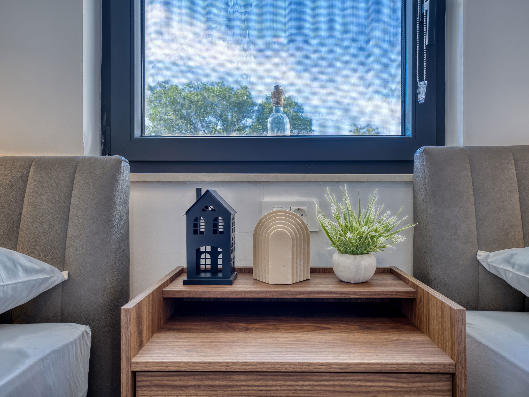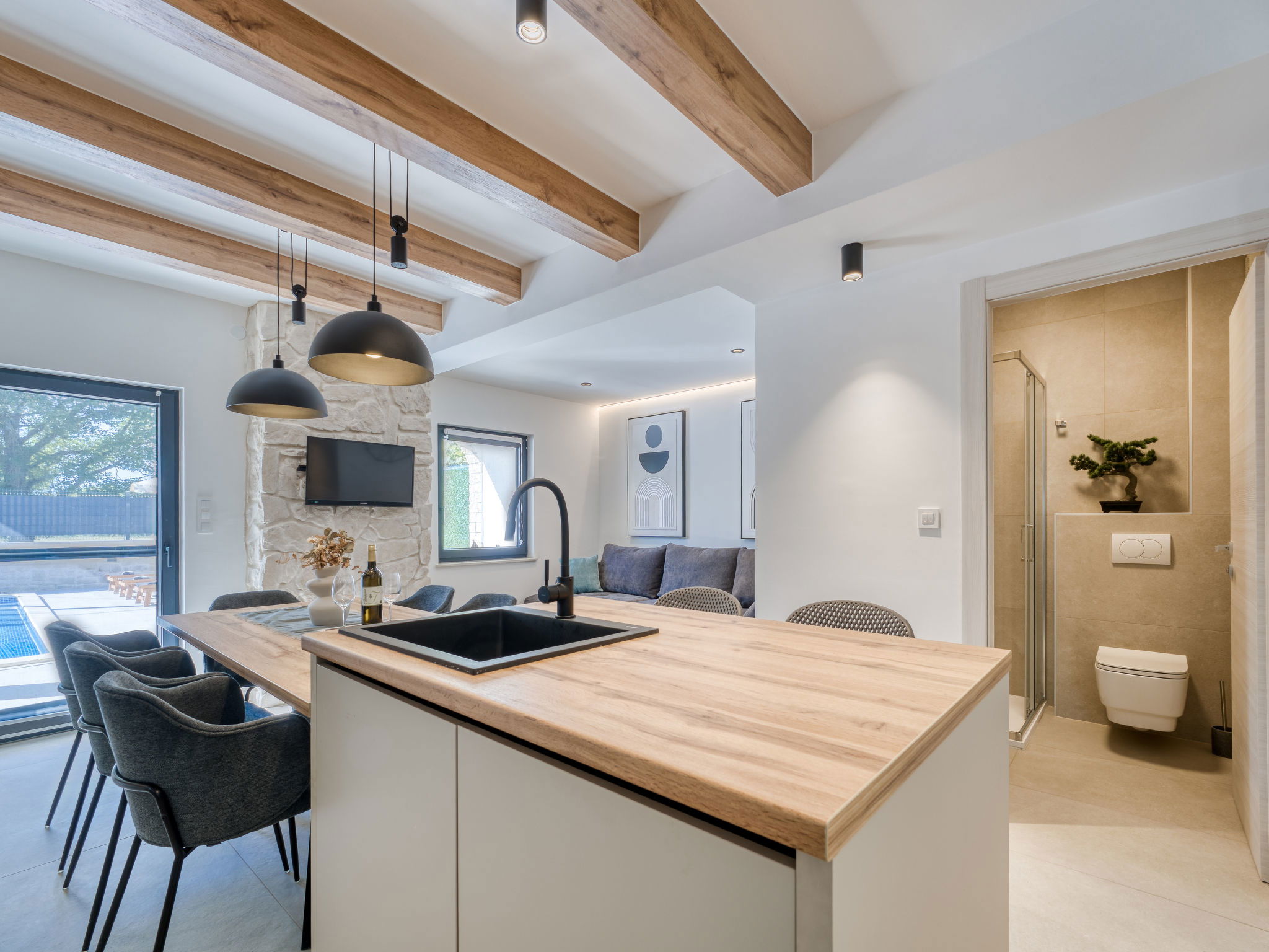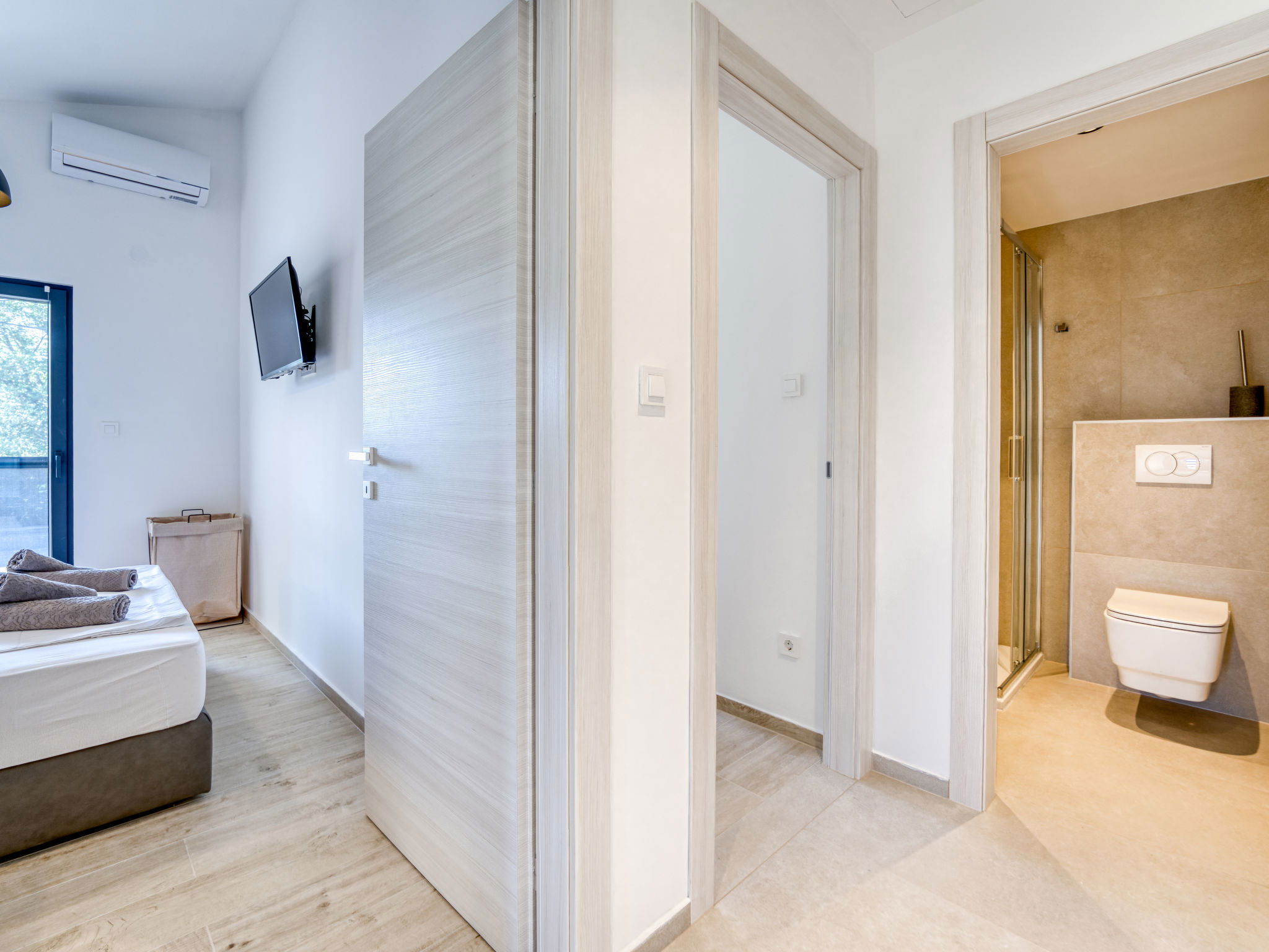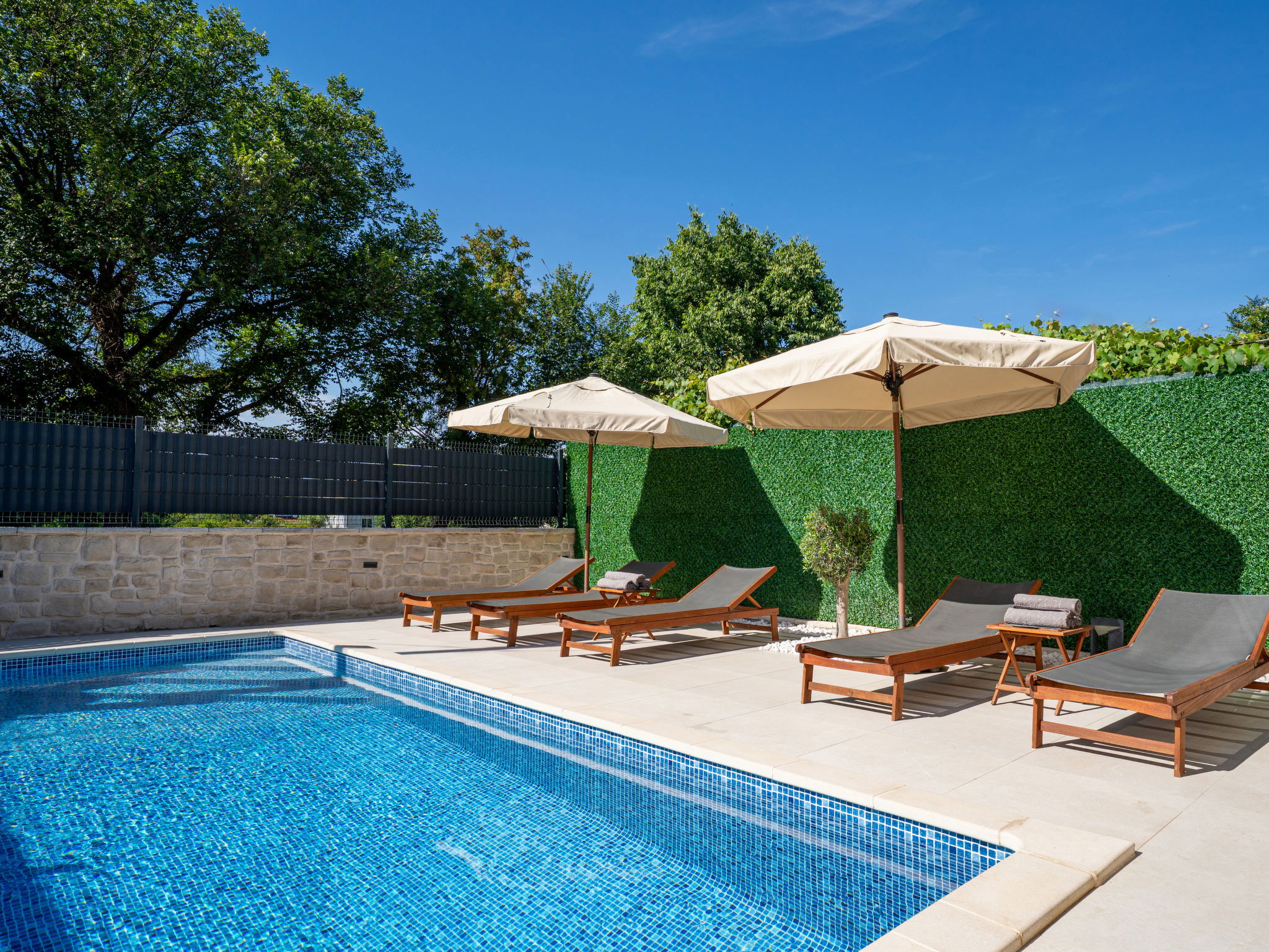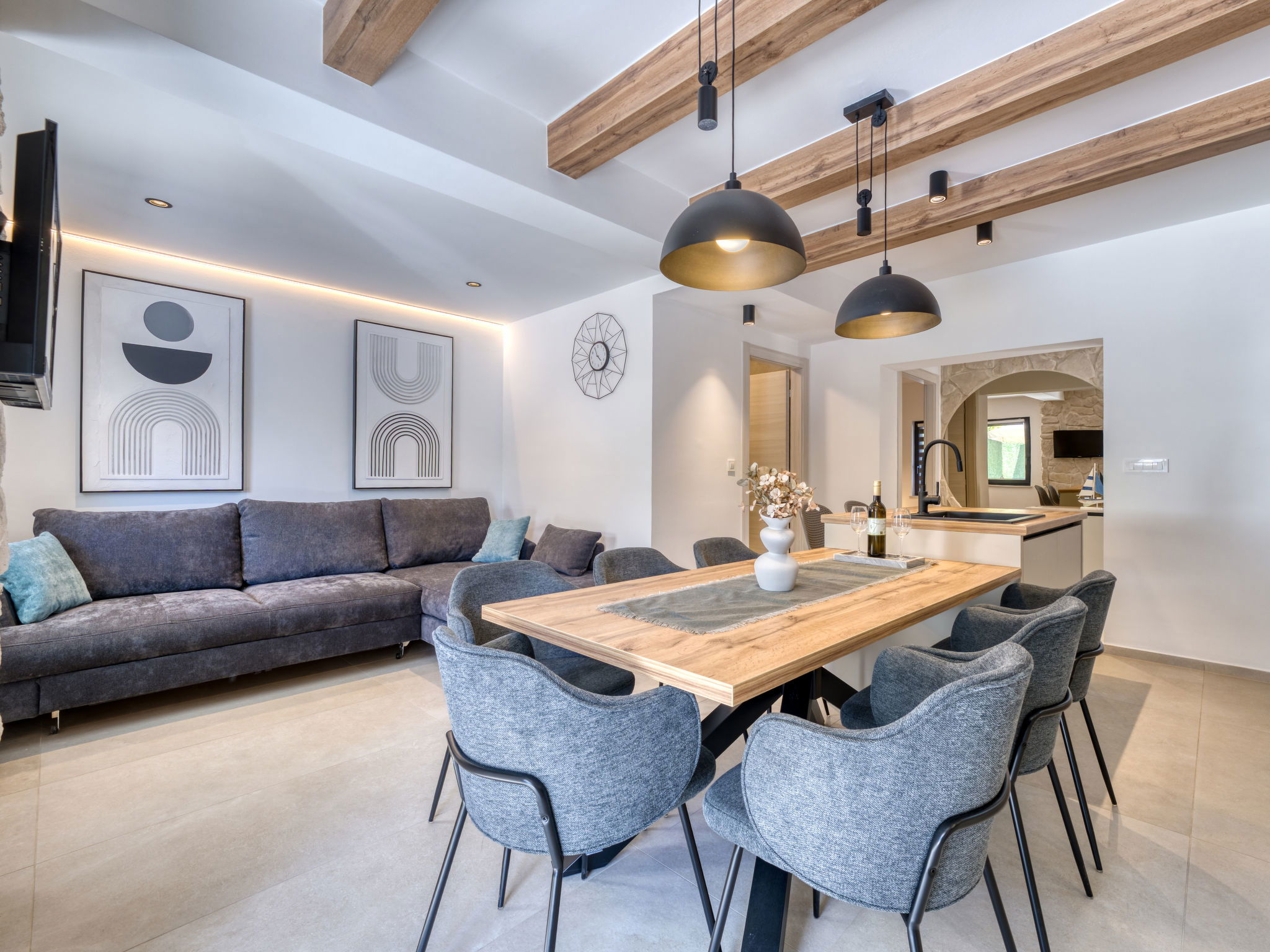 Maison jumelée "Domagoj". Dans le hameau de Sveti Anton, à 2.5 km du centre de Malinska, à 11 km du centre de Krk, à 20.5 km du centre de Vrbnik, à 1.8 km de la mer. A usage privé: terrain 200 m2 (clôturé) avec arbres, piscine chauffée (7 x 3 m, 24 m2, profondeur 120 - 150 cm, disponibilité saisonnière: 15.Mar. - 15.Nov.) avec systeme d'électolyseur au sel. Douche extérieure, entretien de la piscine par le propriétaire/jardinier. Infrastructures de la Maison: lave-linge (en commun, en sus). Place de parking (pour 2 voitures) sur le terrain. Magasins 1 km, arrêt de bus 350 m, plage de graviers 1.8 km. Veuillez noter: le propriétaire habite dans la même maison. Aéroport 17 km de la maison.