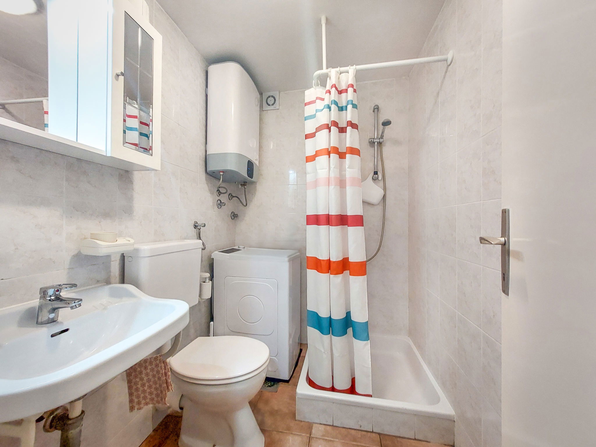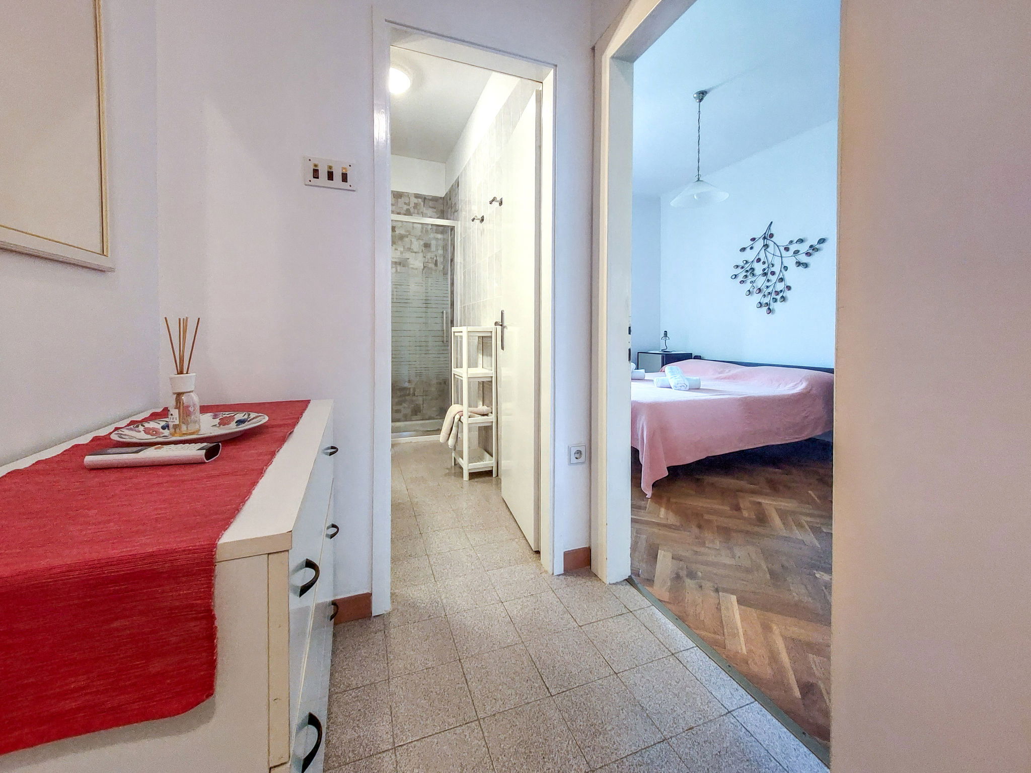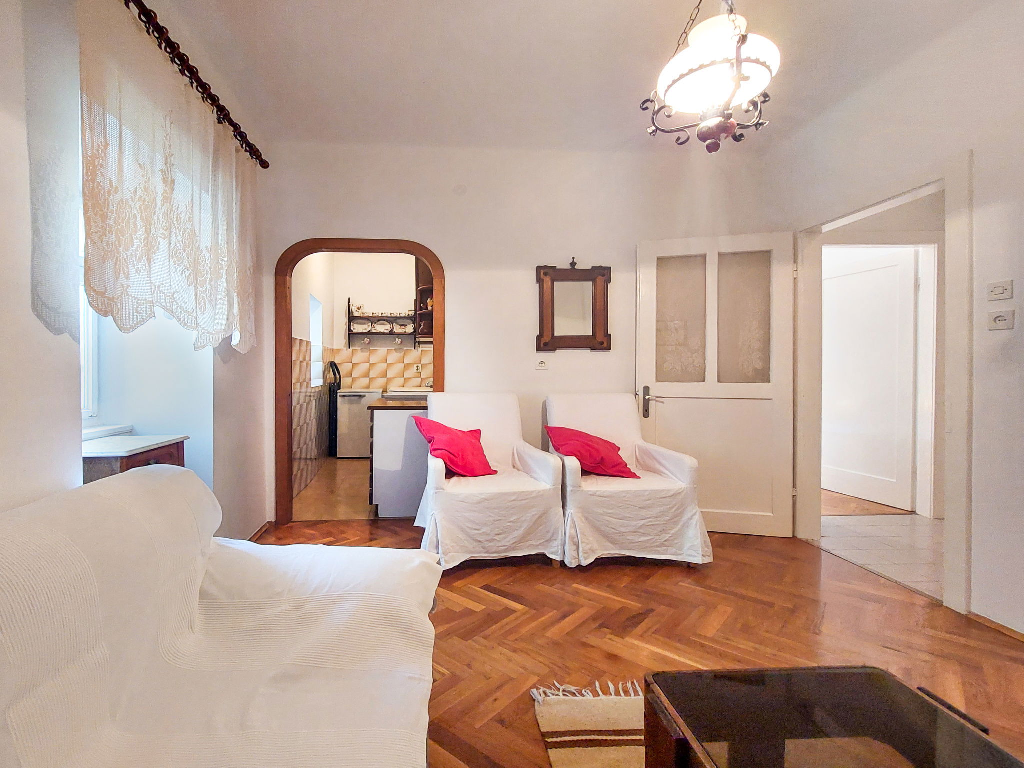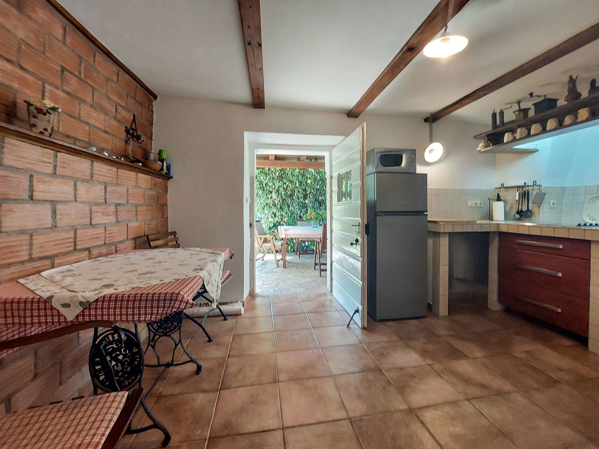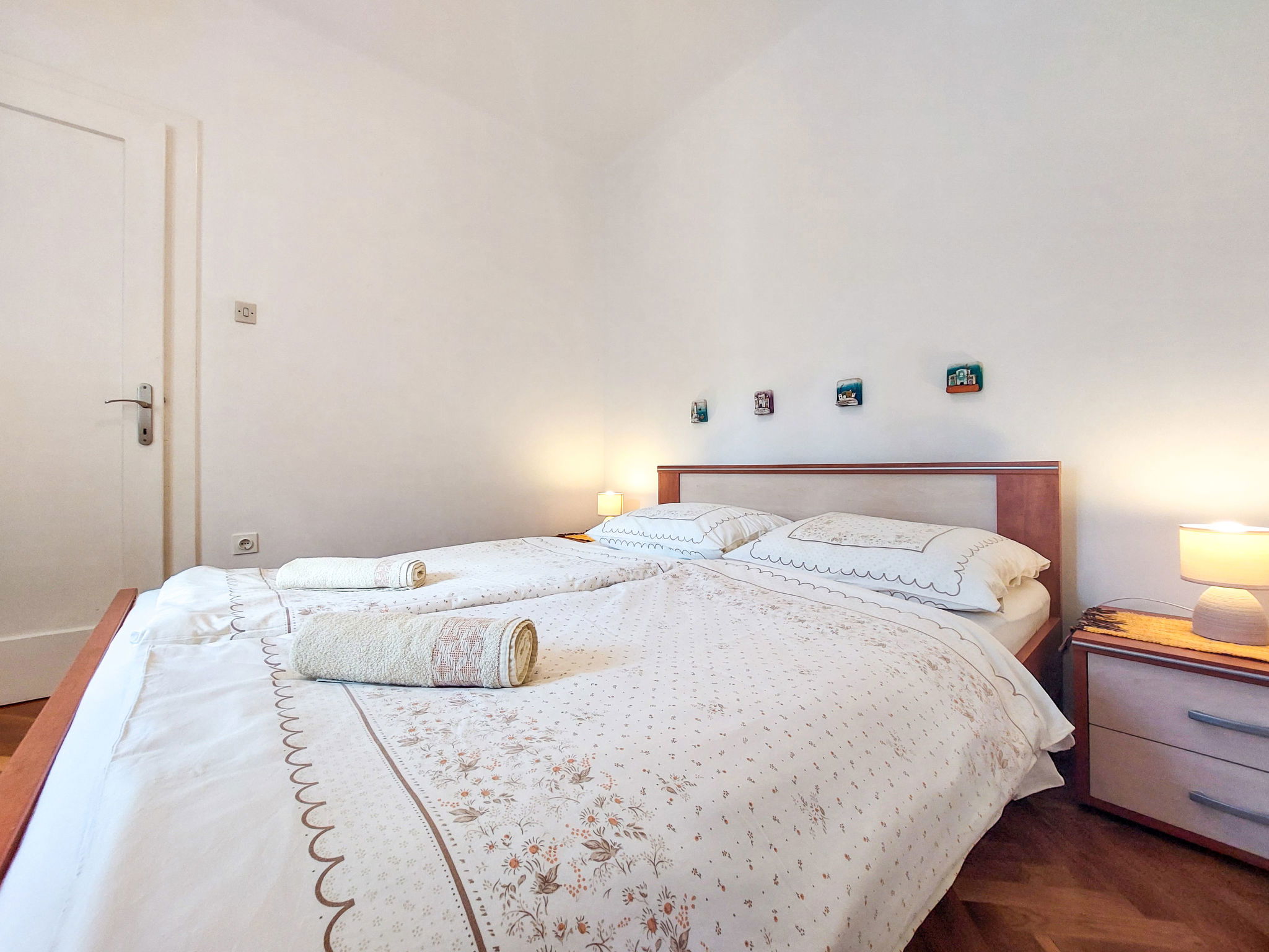 Maison 4 pièces 70 m2 sur 2 niveaux. Salle à manger avec table pour les repas. Cuisine (lave-vaisselle, 4 plaques vitrocéramiques, grille-pain, bouilloire électrique, micro-ondes, congélateur, cafetière électrique). Sortie sur la terrasse. Douche/WC. À l'étage supérieur: (escalier extérieur) entrée avec air-conditionné. Sortie sur la terrasse. Séjour avec 1 divan-lit double et TV (satellite). 1 chambre avec 1 lit double (2 x 80 cm, longueur 200 cm). 1 chambre avec 1 grand-lit (160 cm, longueur 200 cm). Cuisine ouverte (2 plaques de cuisson, four, 2 feux, congélateur). Bain/WC. Pas de chauffage. Terrasse 28 m2, terrasse 30 m2, couverte. Meubles de terrasse, chaises longues (2). A disposition: chaise haute pour enfant, lit bébé. Internet (Connexion WIFI, gratuit). Veuillez noter: maison non-fumeur. Maximum 2 animaux/ chiens autorisés. Pas de liaison interne entre les étages. UP/I-335-03/06-01/594 Ur.broj:2170-83-03-06-3