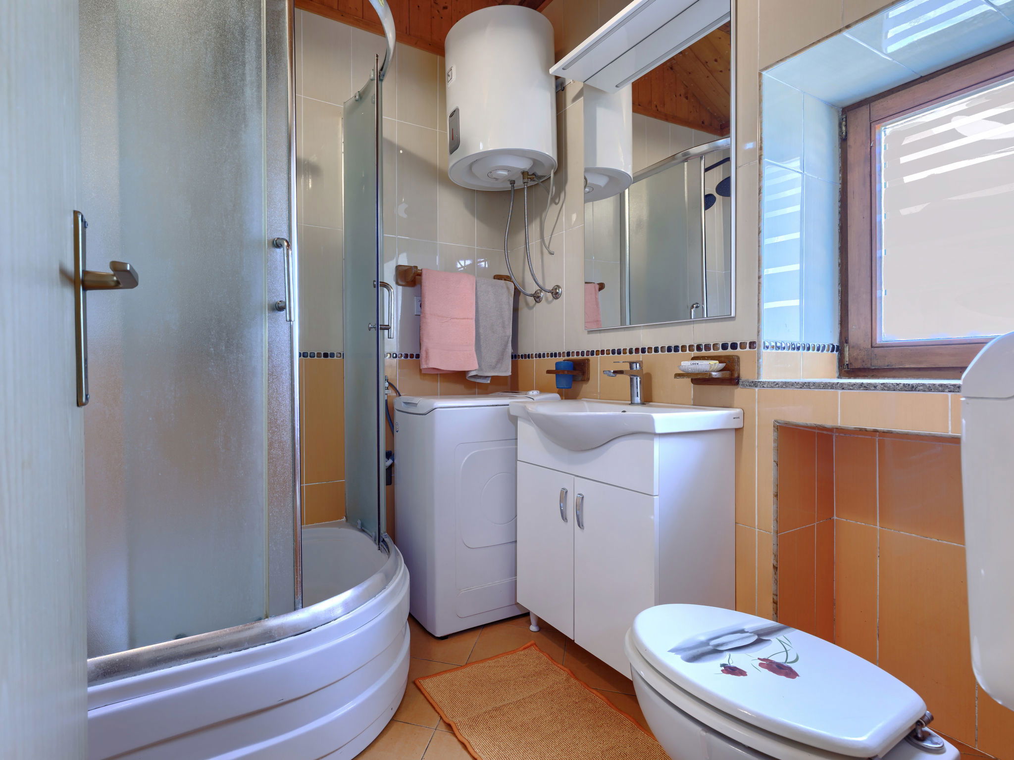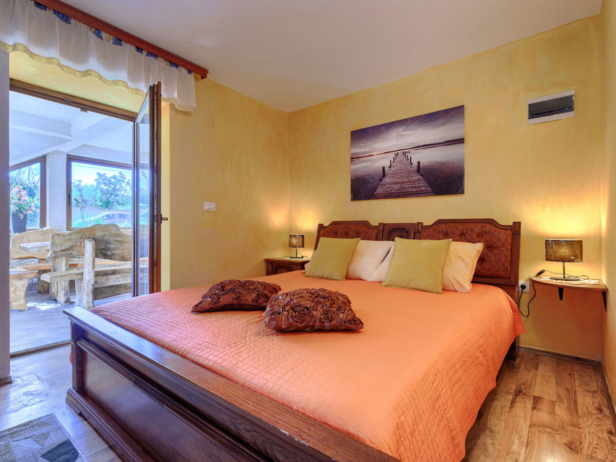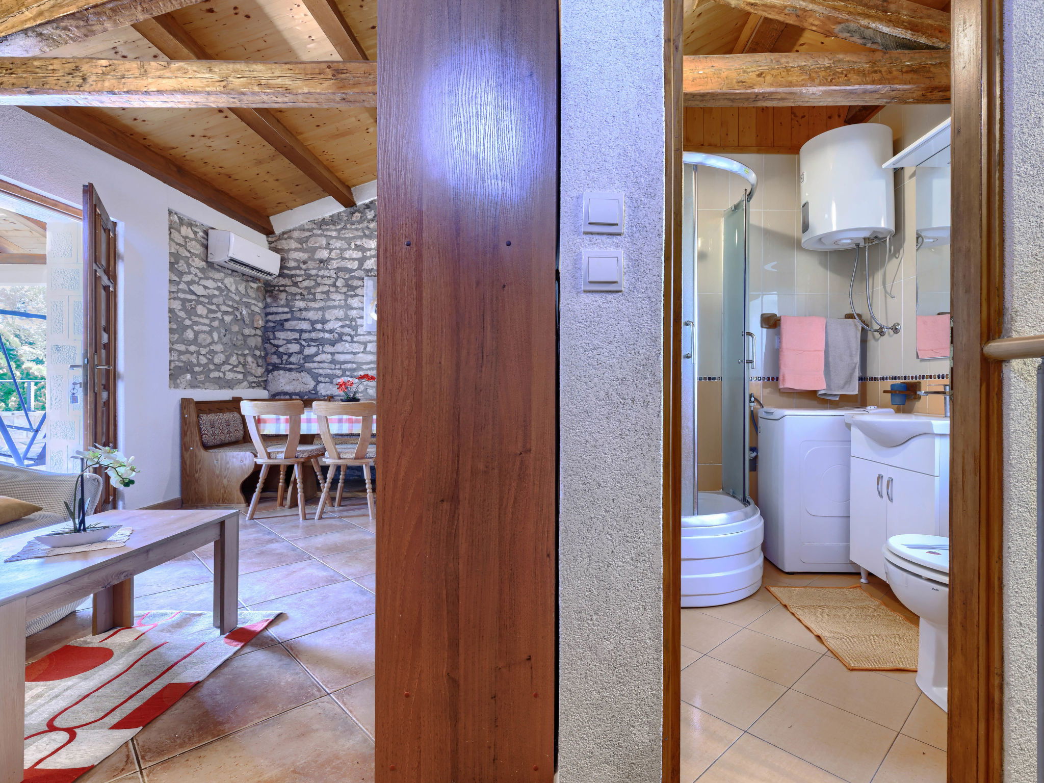 "Pinezici", maison mitoyenne 2 pièces 48 m2 sur 2 niveaux. 1 chambre avec 1 grand-lit (180 cm, longueur 200 cm). Salle à manger. Sortie sur la véranda. À l'étage supérieur: (escalier en colimaçon) séjour/chambre à coucher avec 1 x 2 lits superposés, table pour les repas, TV (satellite) et air-conditionné. Cuisine ouverte (1 plaque de cuisson, 3 feux, grille-pain, bouilloire électrique, micro-ondes, congélateur, gril, cafetière électrique). Douche/WC. Pas de chauffage. Terrasse 15 m2, couverte. Meubles de terrasse, barbecue. A disposition: Internet (Connexion WIFI, gratuit). Veuillez noter: maison non-fumeur. Maximum 1 animal/ chien autorisé. Véranda (18 m2).