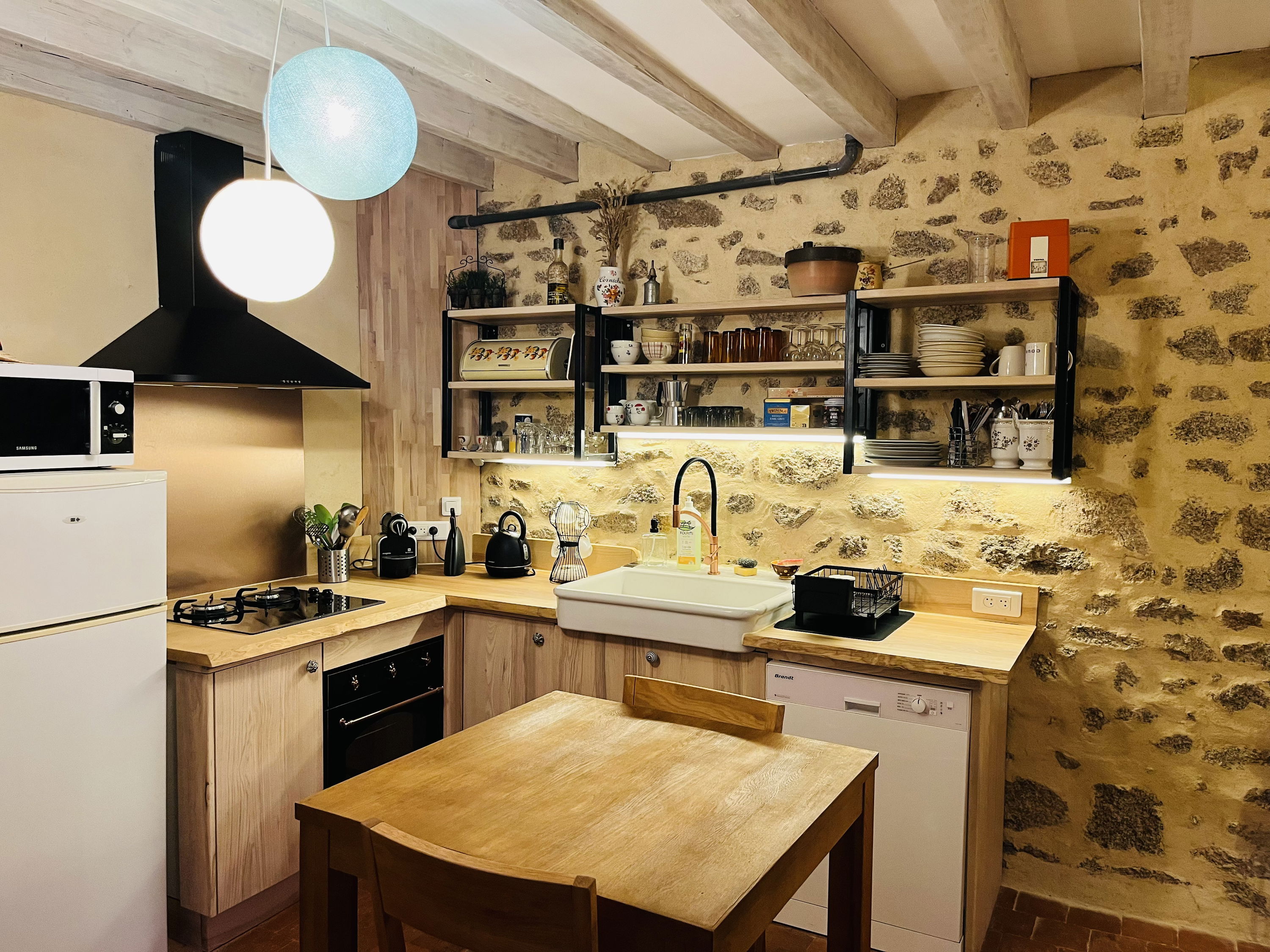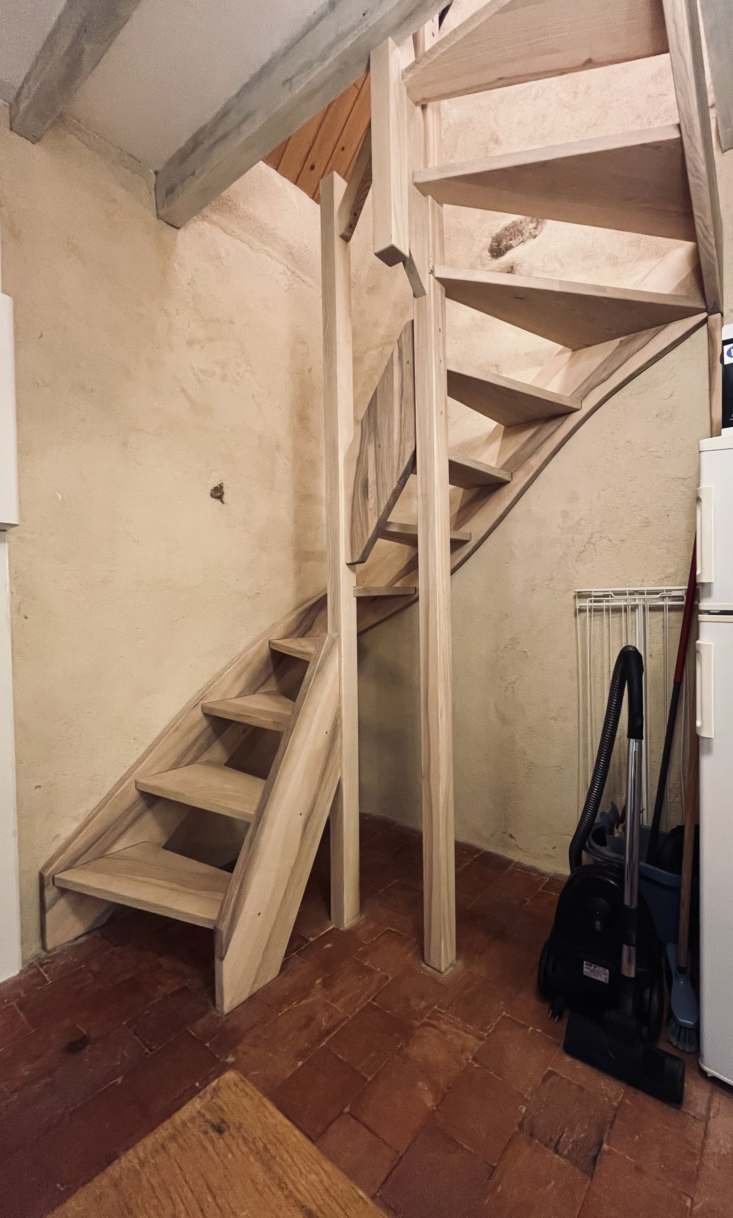 Nous avons priorisé les matériaux d’origine/nobles. En effet, les murs sont en pierre brut et enduits au chanvre, beaucoup d’élément de la maison sont en bois massif également. La cuisine et l’escalier sont entièrement en frêne.