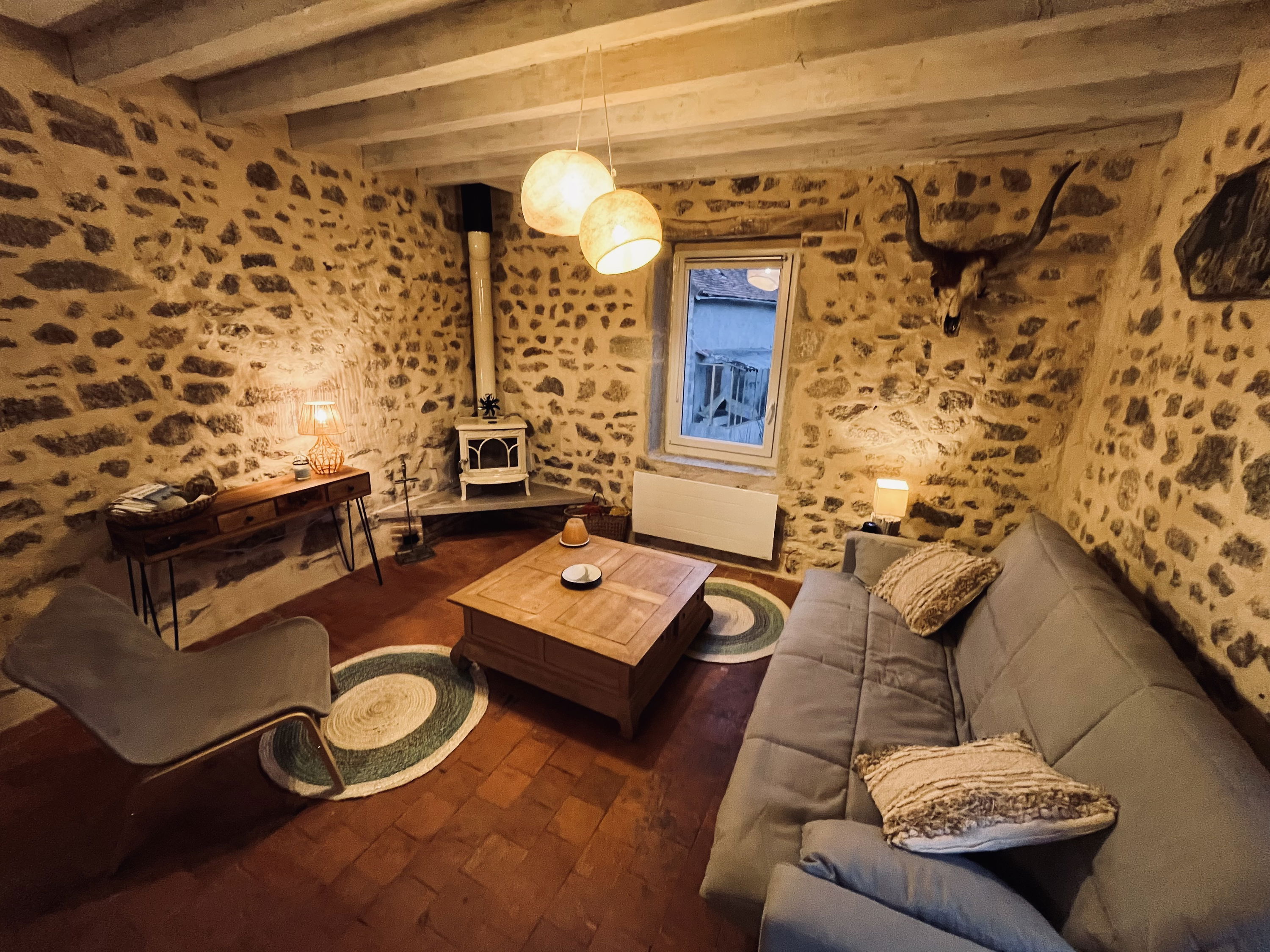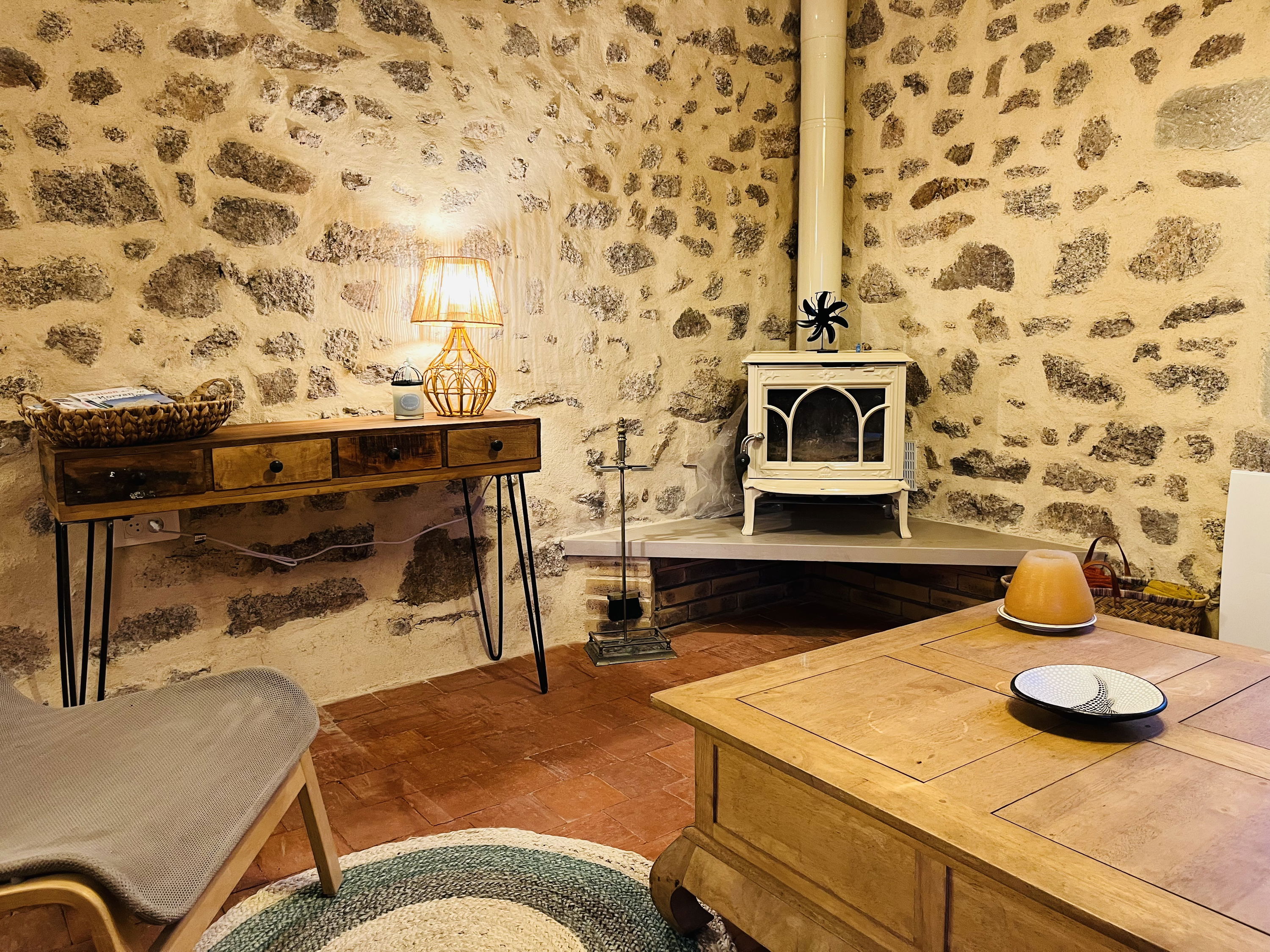 Salon avec poêle à bois pour les soirées d’hiver au coin du feu