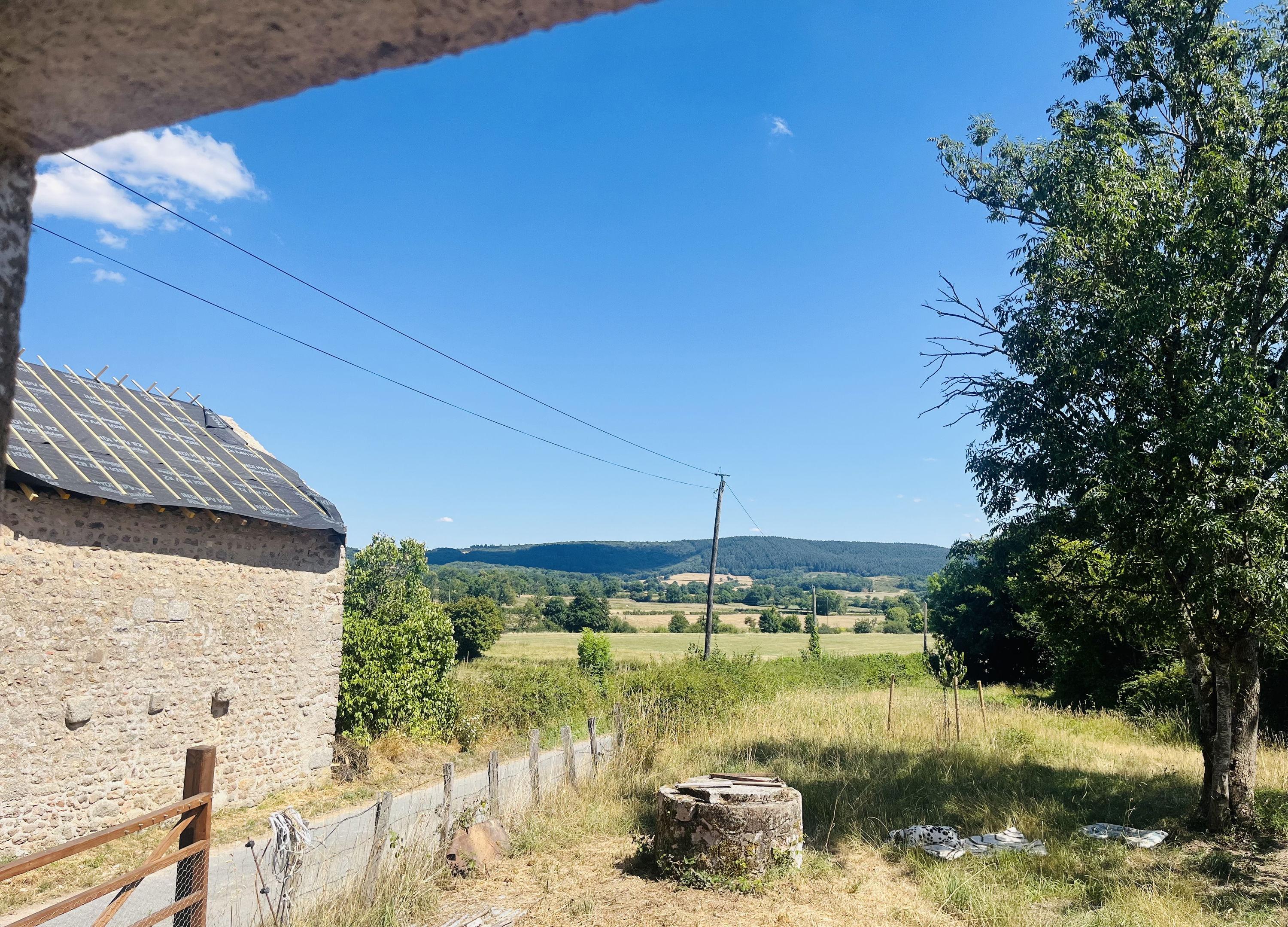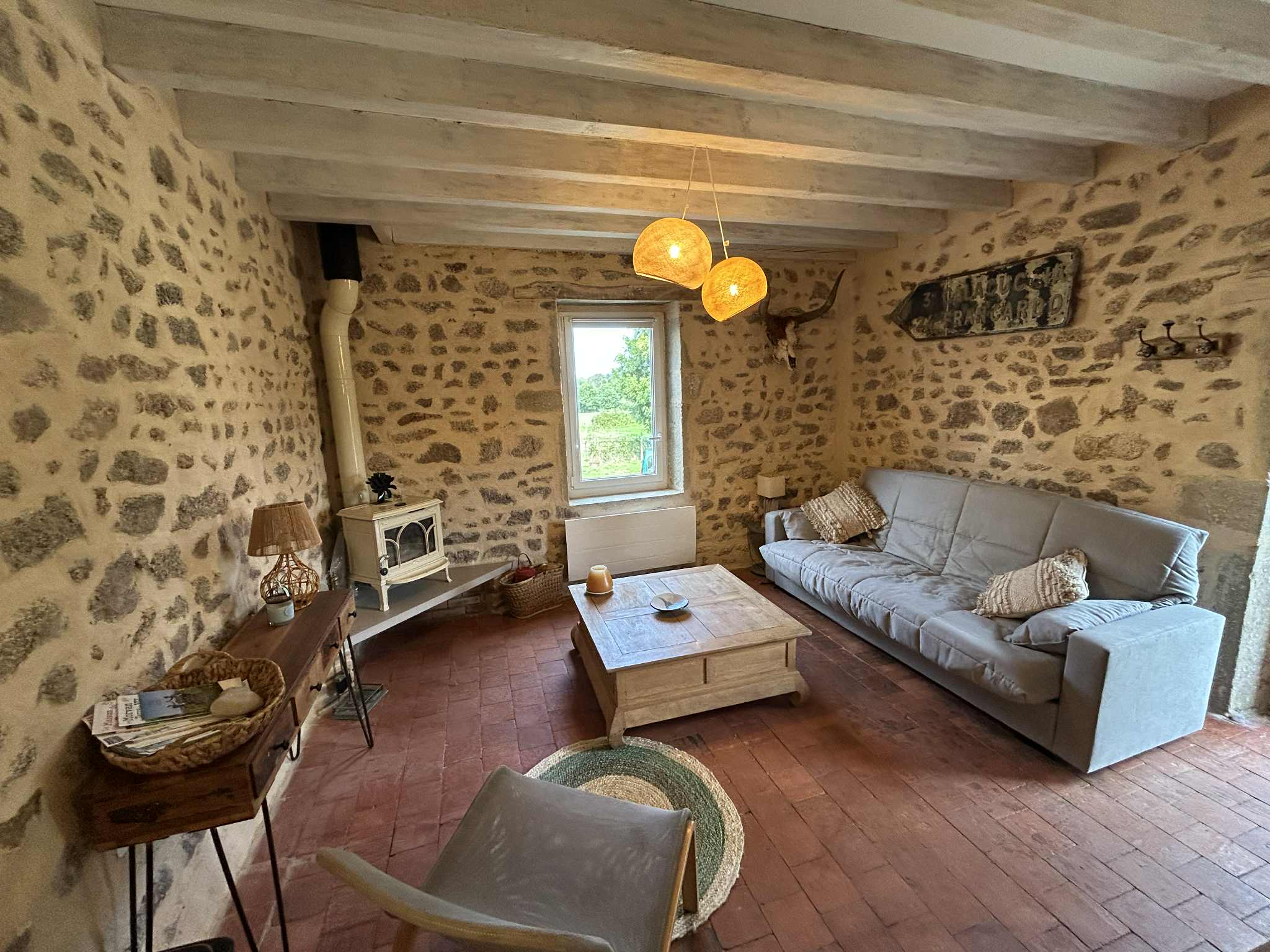 La maison est entourée de prairies, bois et une rivière coule en contre bas de la maison.