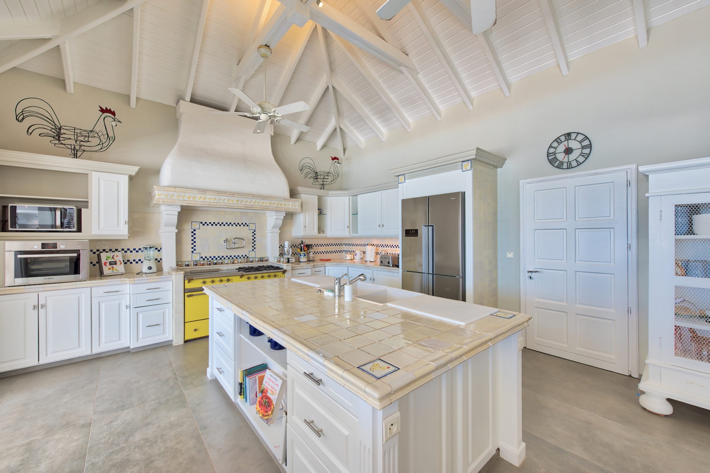 La cuisine de la villa est entièrement équipée et s'ouvre sur la terrasse, ce qui vous permet de profiter de la vue sur le lagon tout en préparant vos repas. Elle offre tout ce dont vous avez besoin pour satisfaire vos envies culinaires.