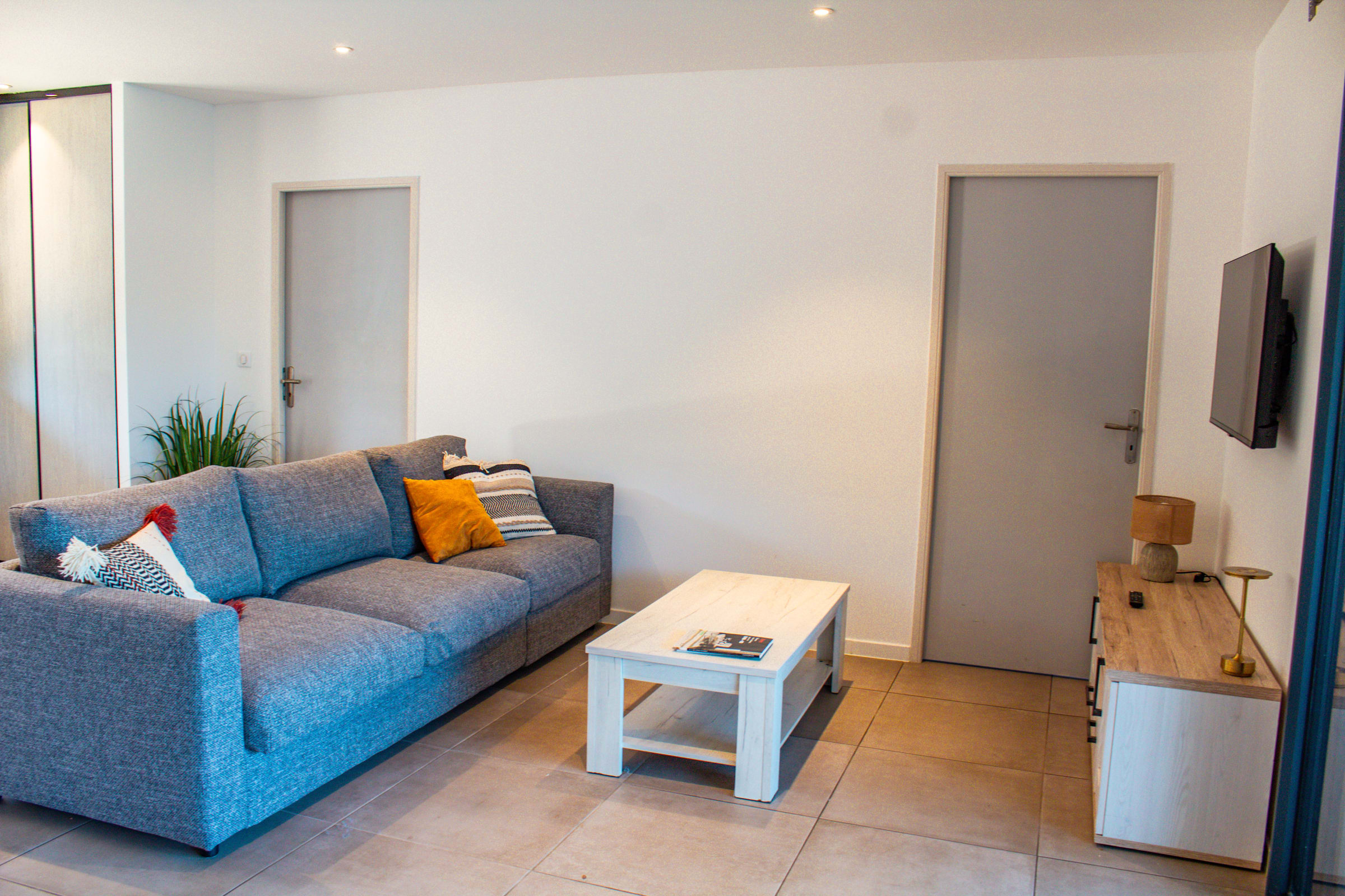 Salon spacieux et lumineux, avec une décoration soignée et une ouverture sur l’extérieur.