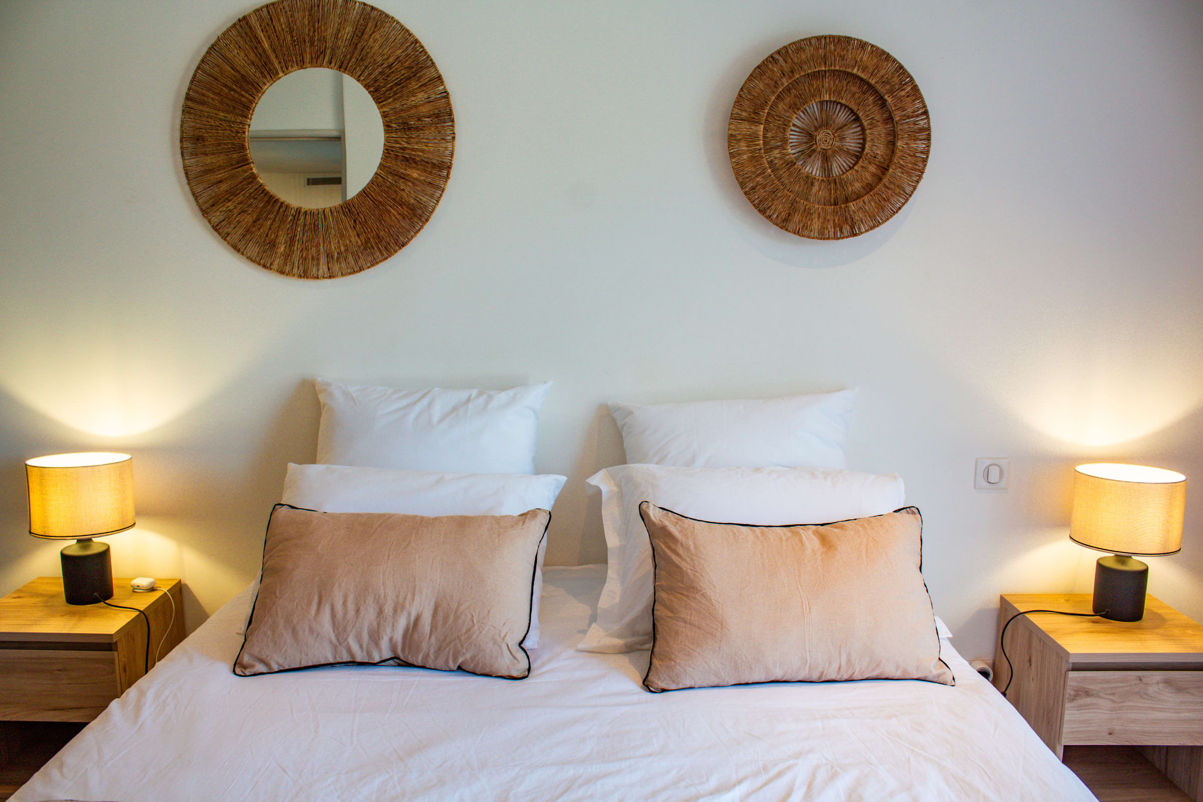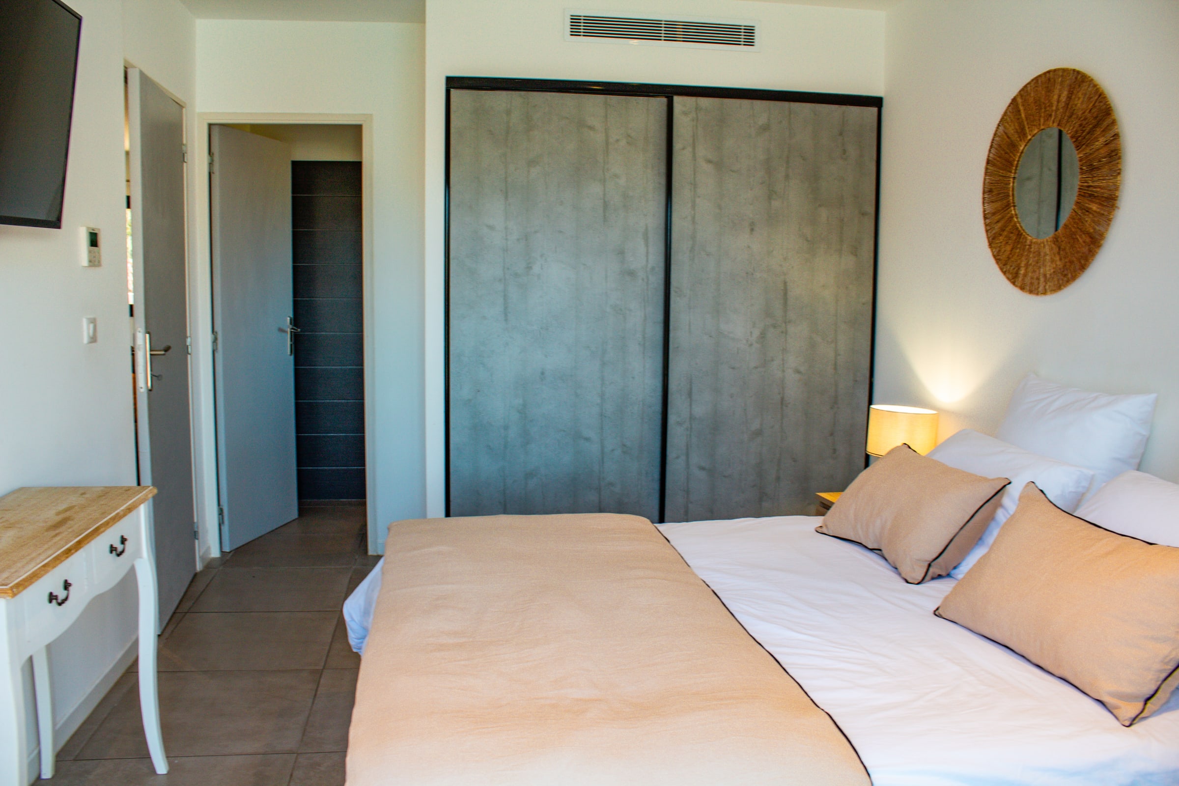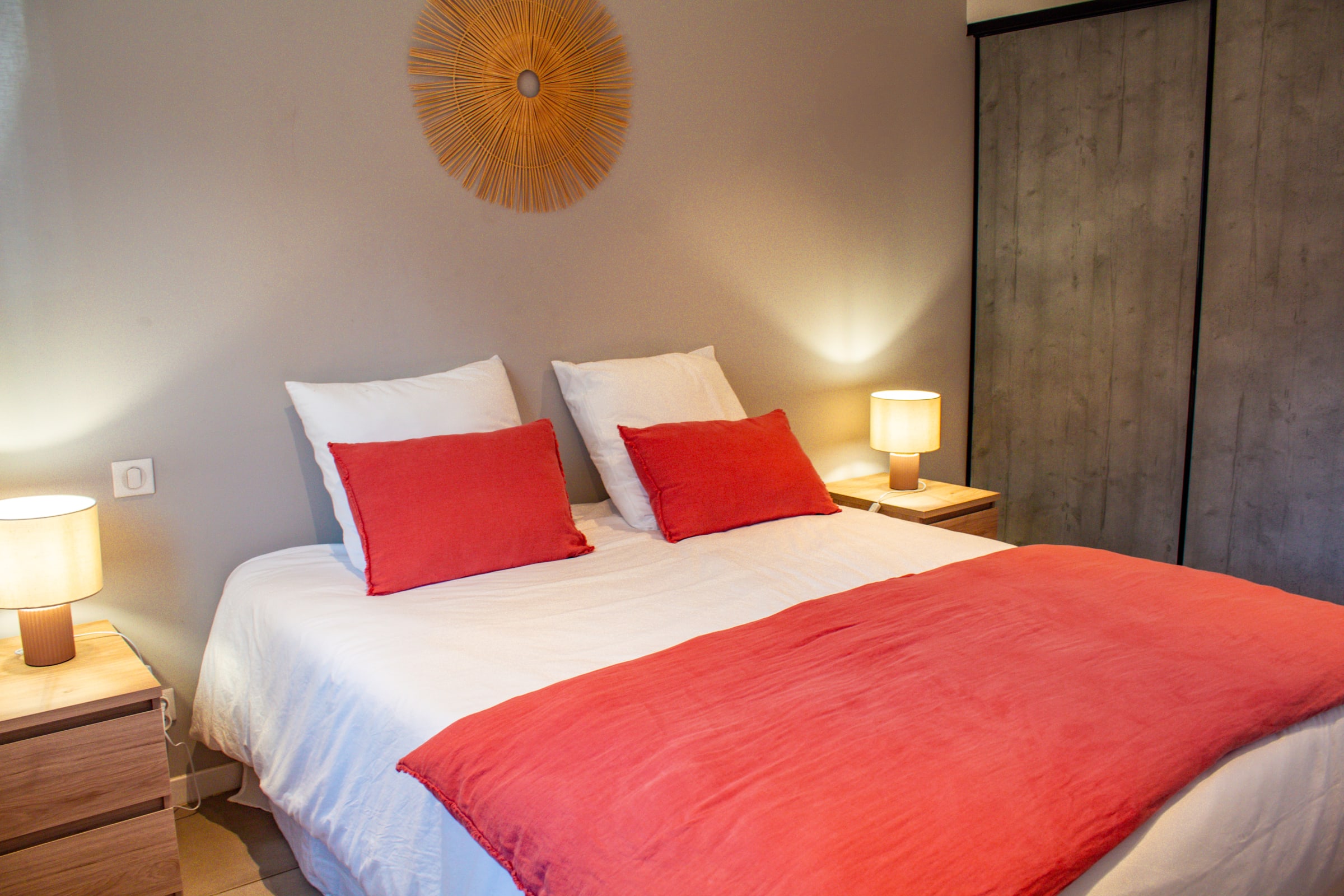 Chambre 1 : Lit Queen size (160x200), salle de bain privative, accès direct à la terrasse et à la piscine.