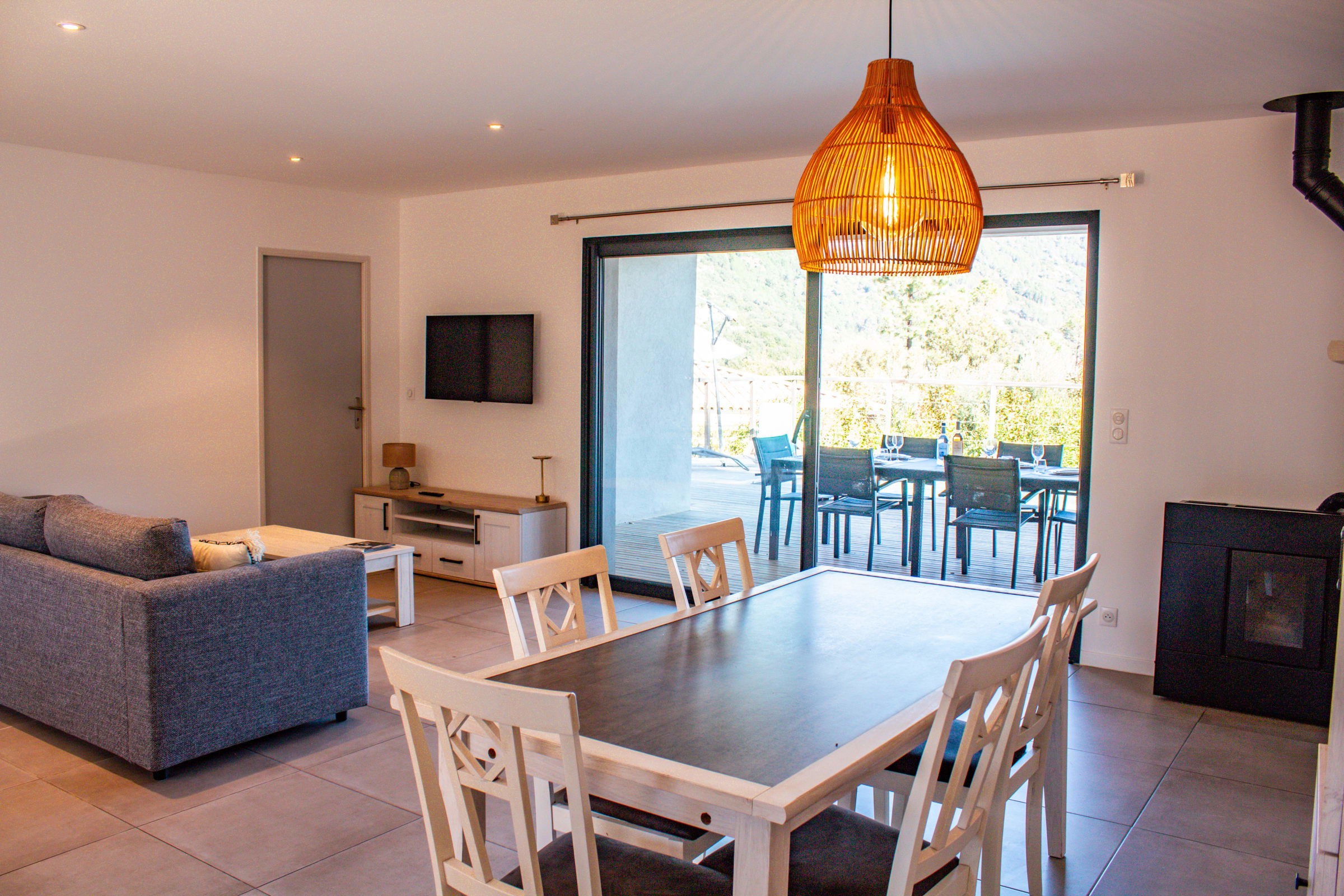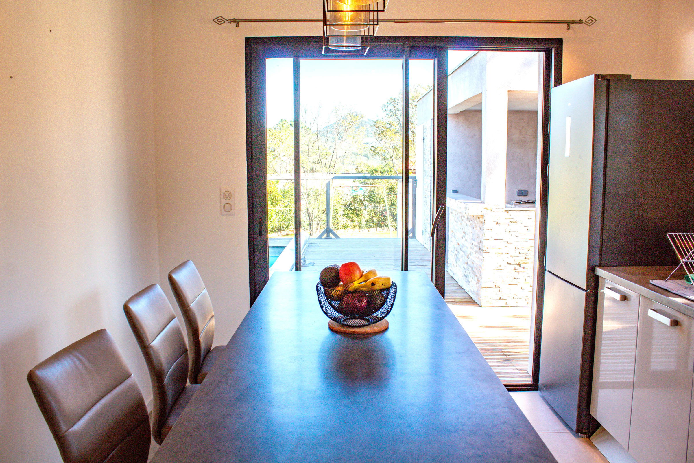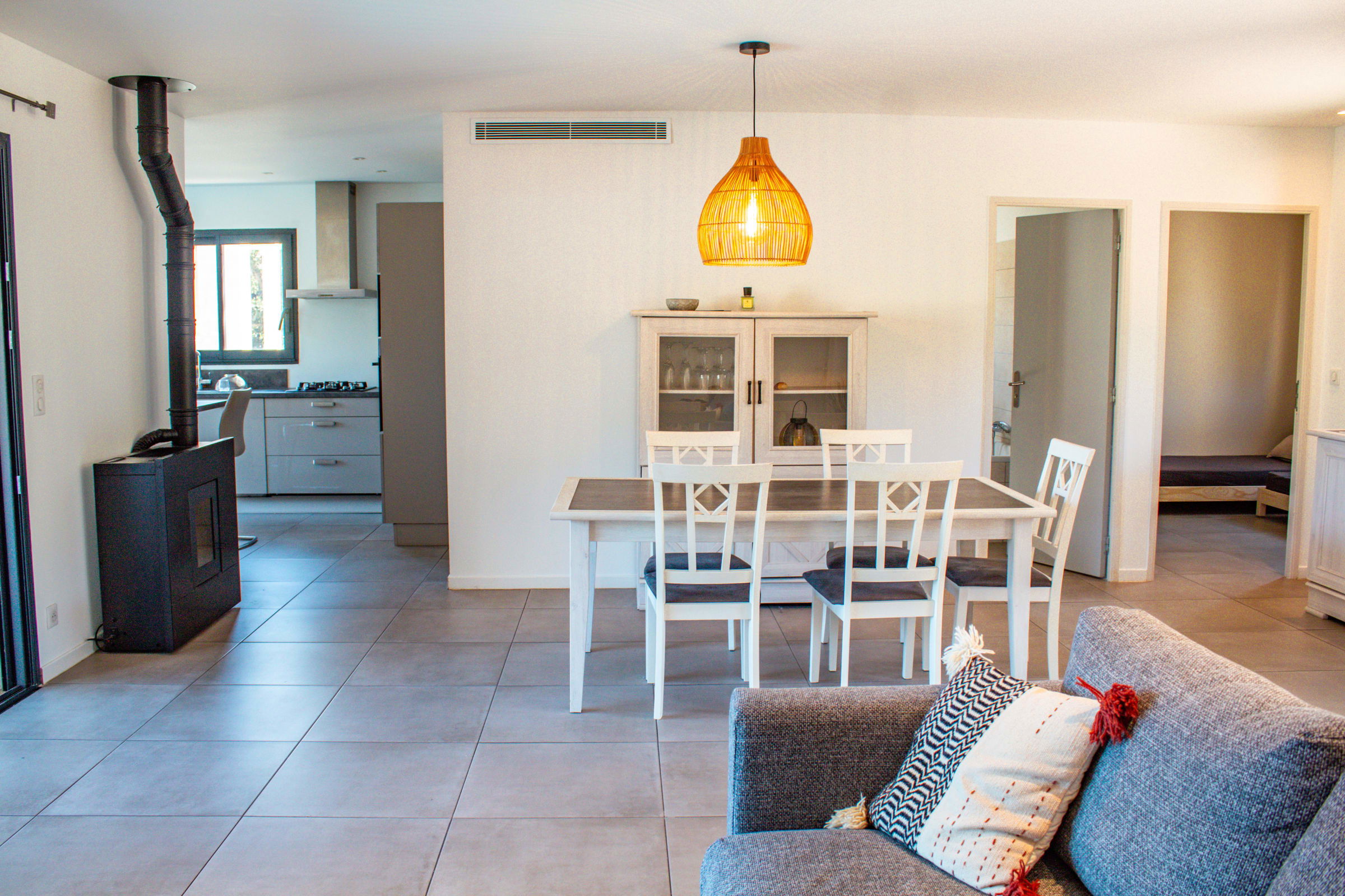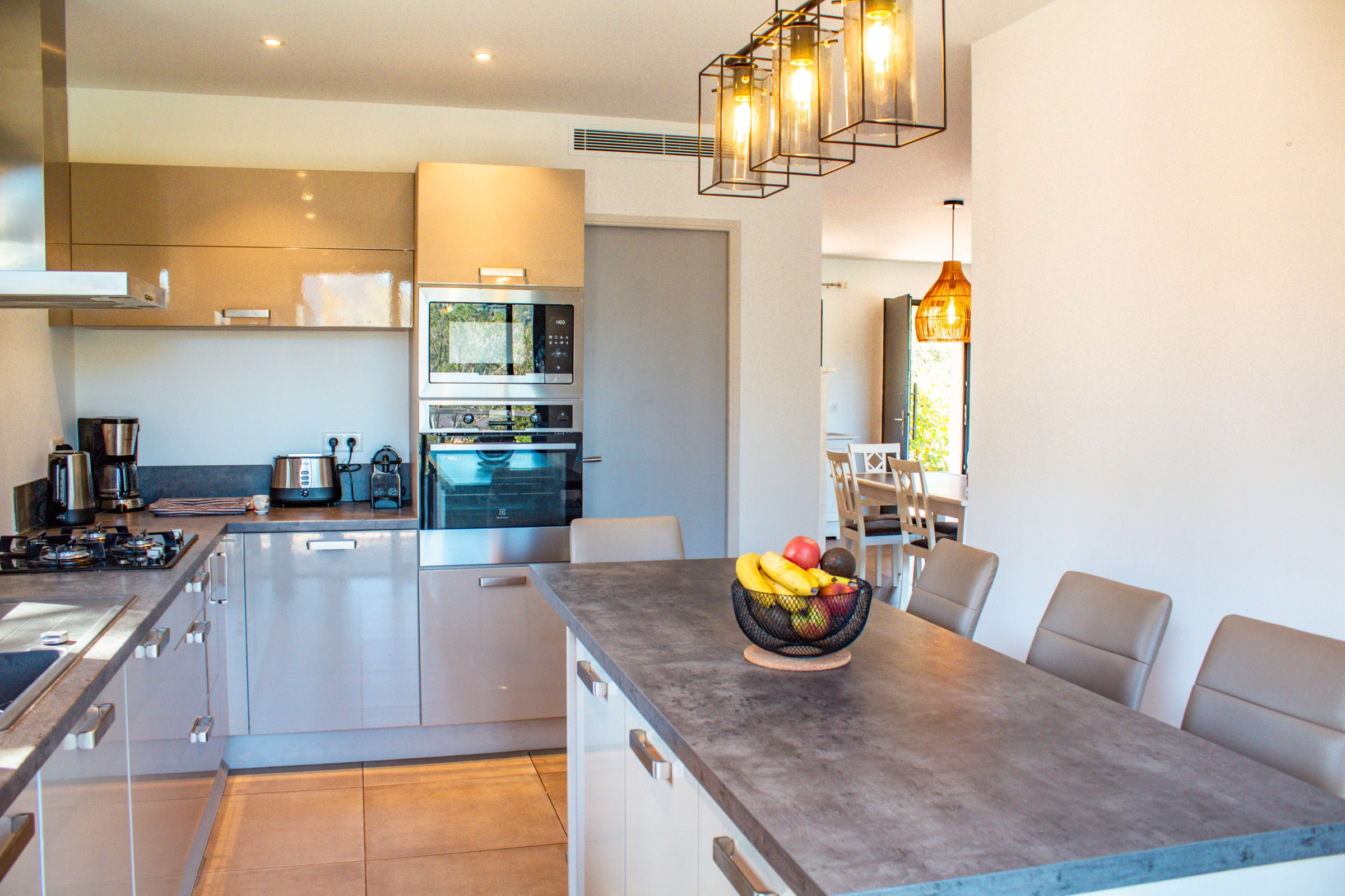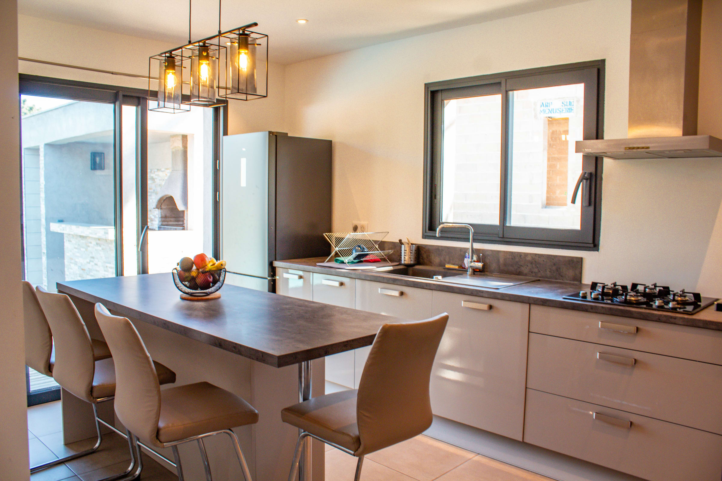 Cuisine ouverte entièrement équipée, idéale pour partager des repas conviviaux.