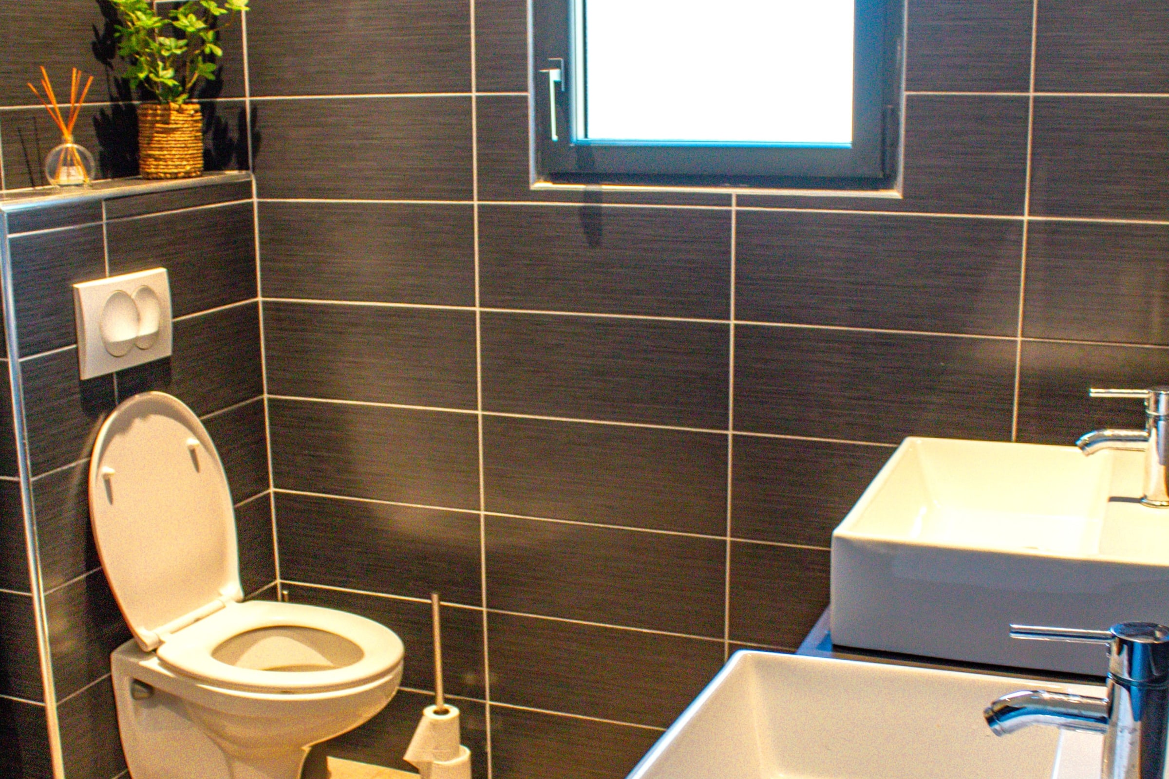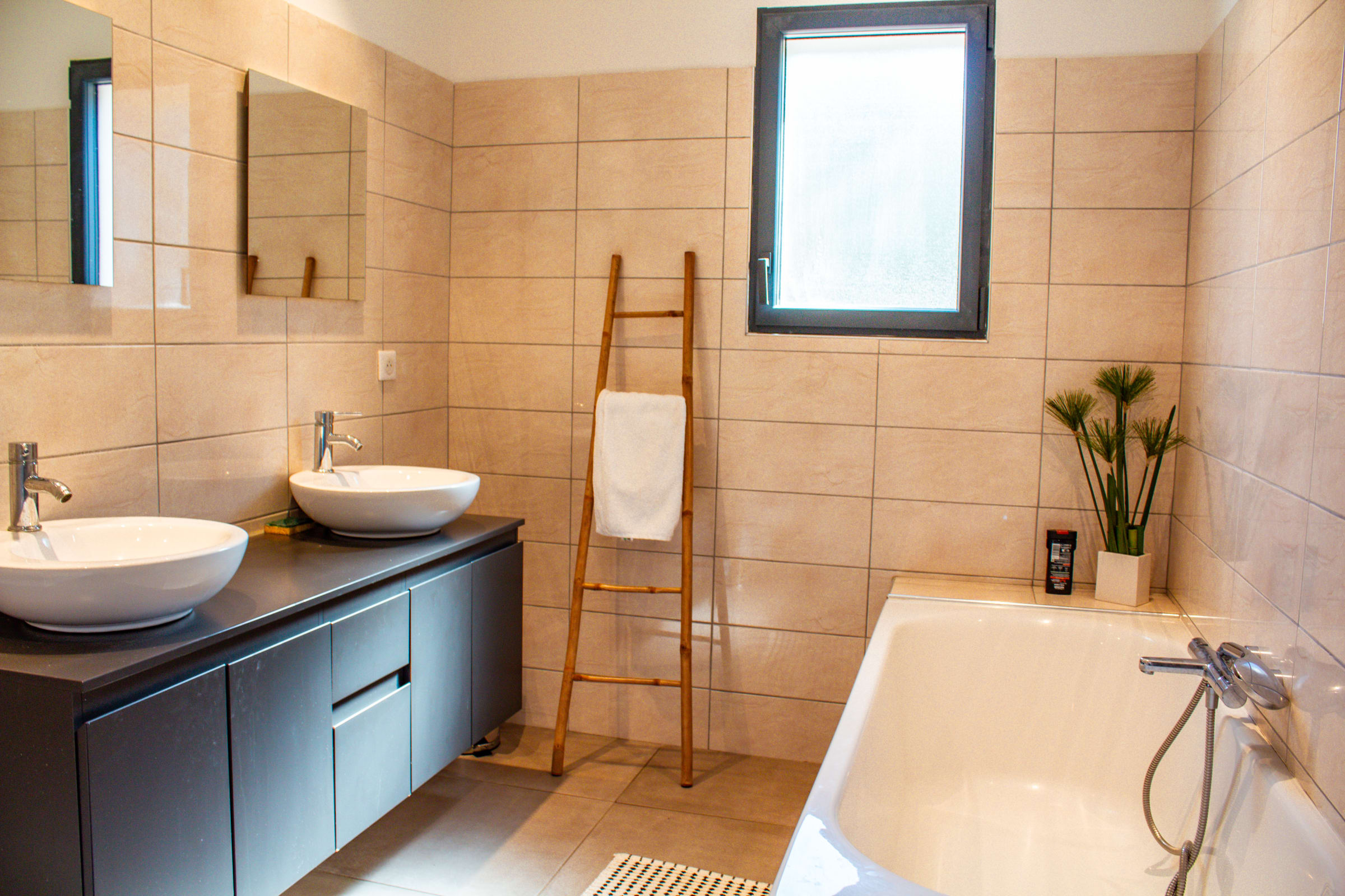 Salle de bain moderne avec baignoire, double vasque et toilettes.