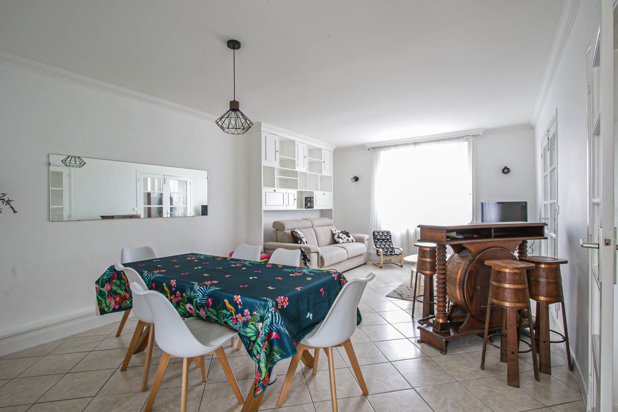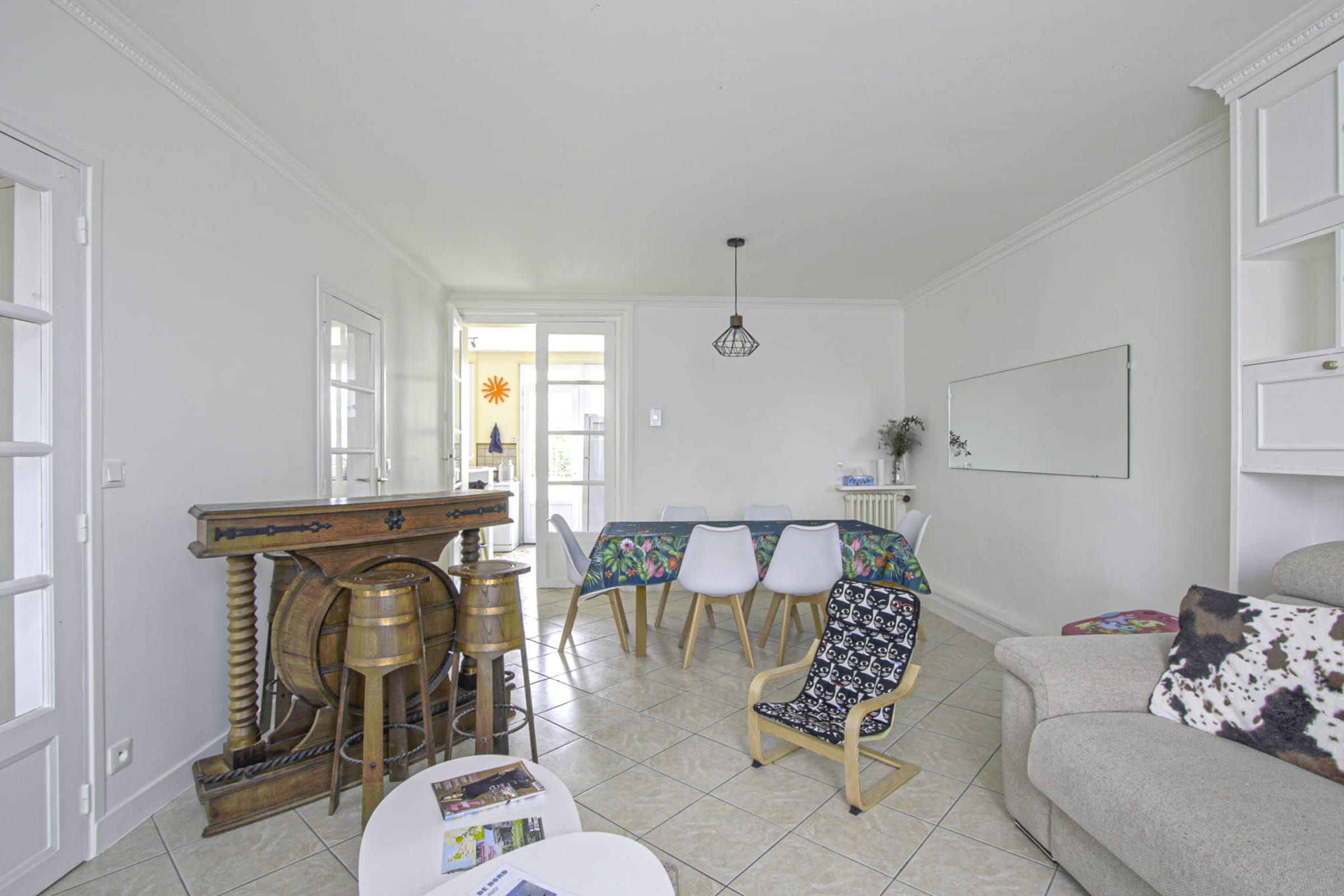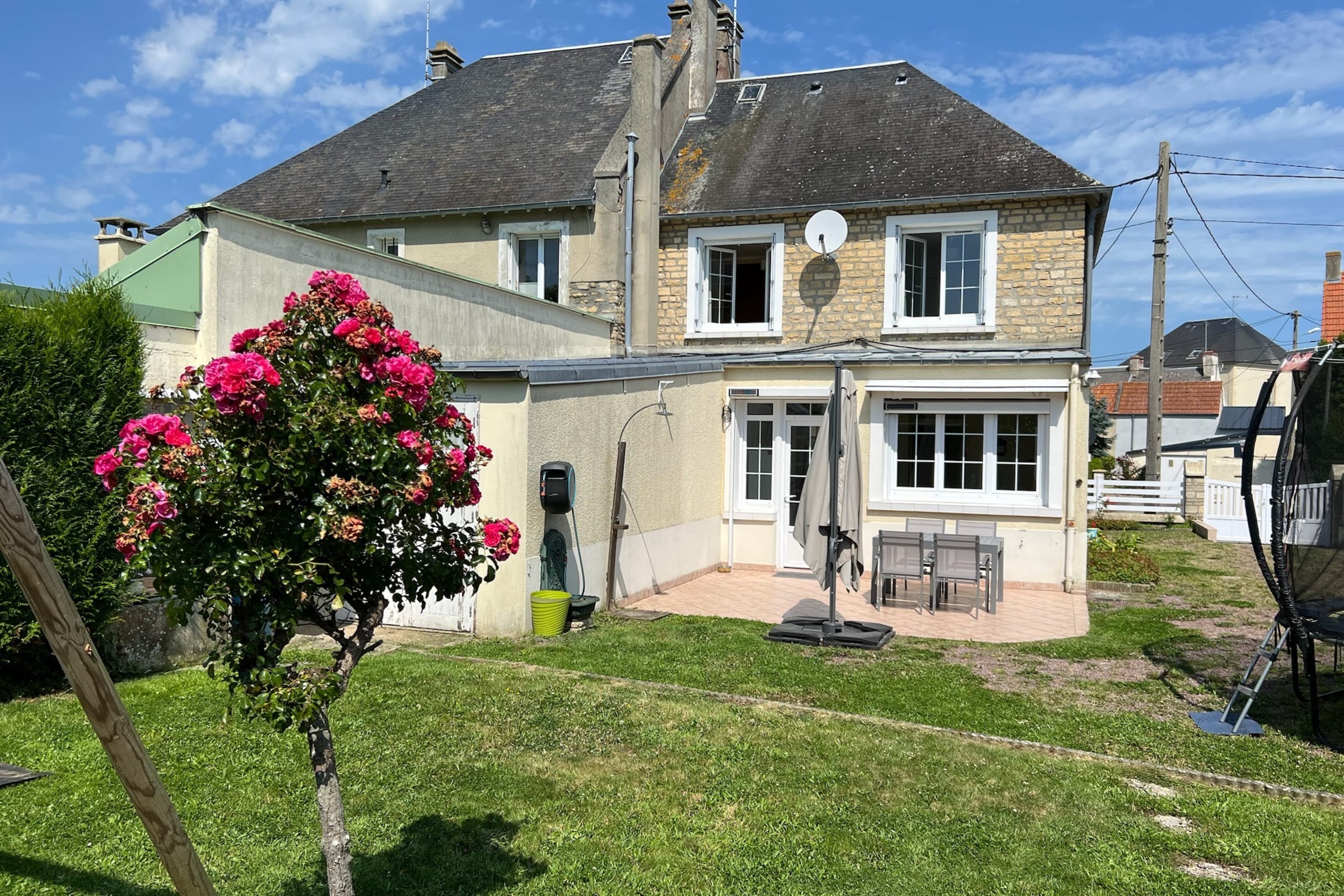 Cette maison de famille dispose d'une entrée donnant suer une pièce de vie et une cuisine équipée. Par cette cuisine, il vous est possible d'accéder au jardin pour vos repas sous le soleil de Normandie.