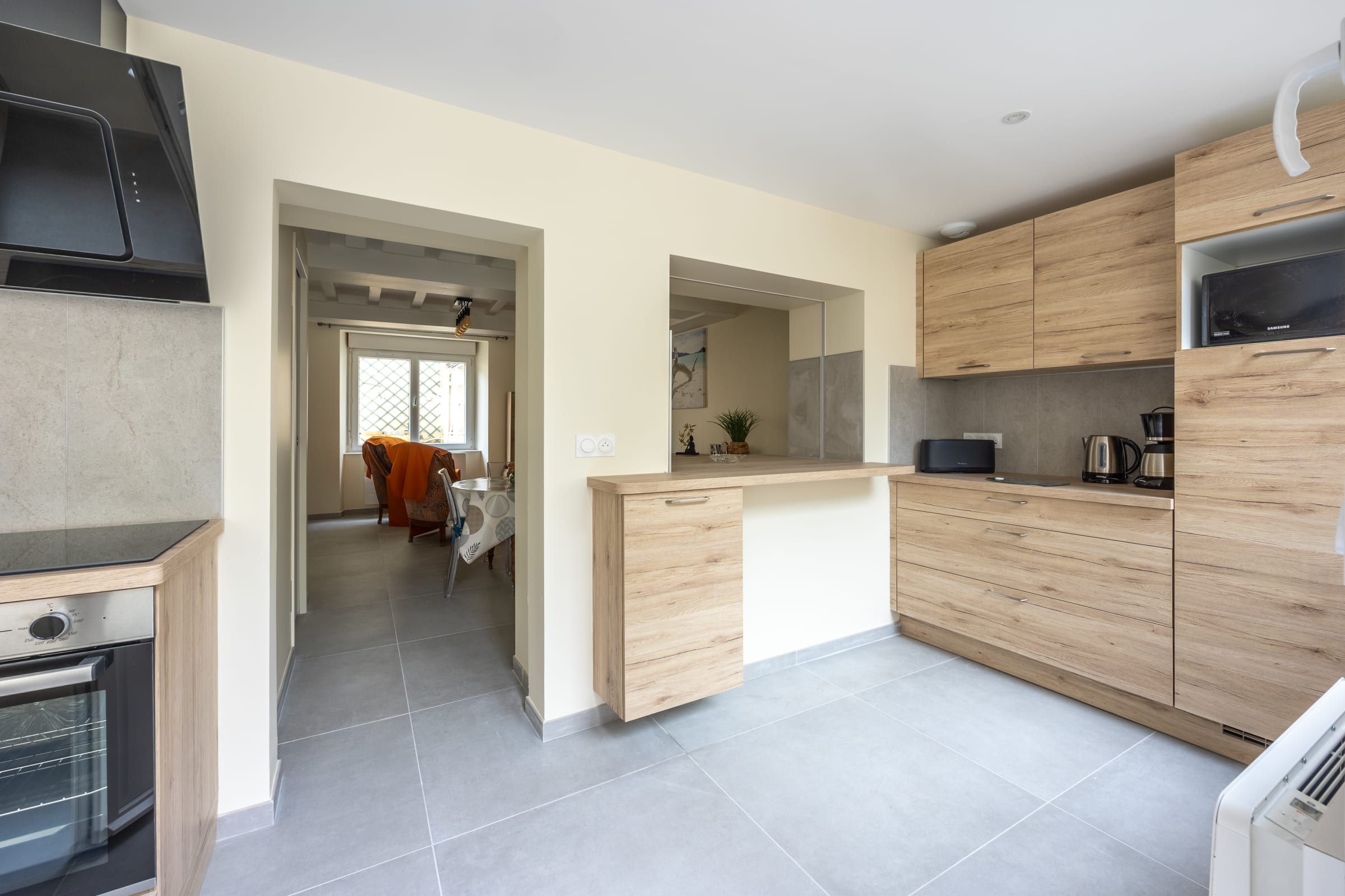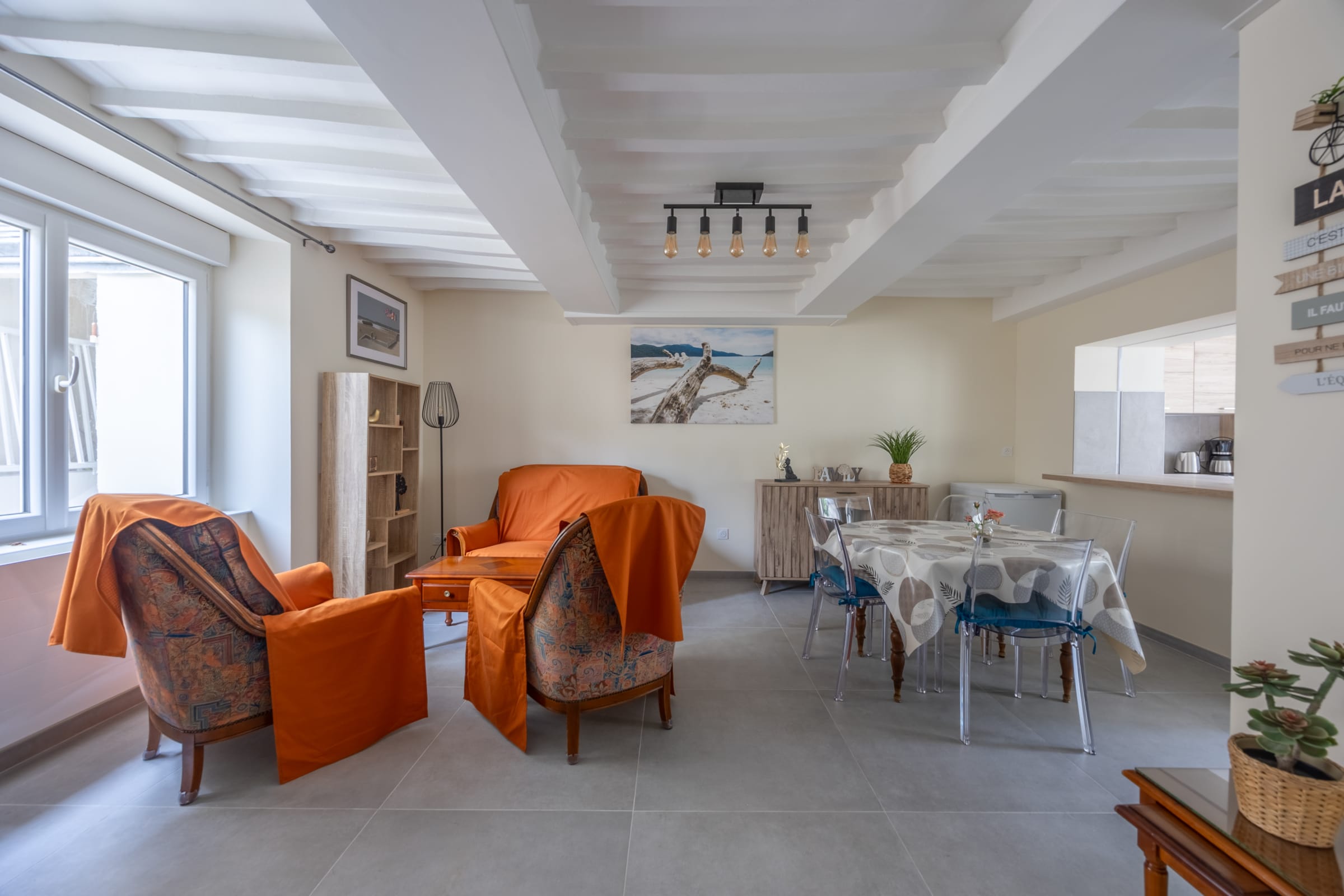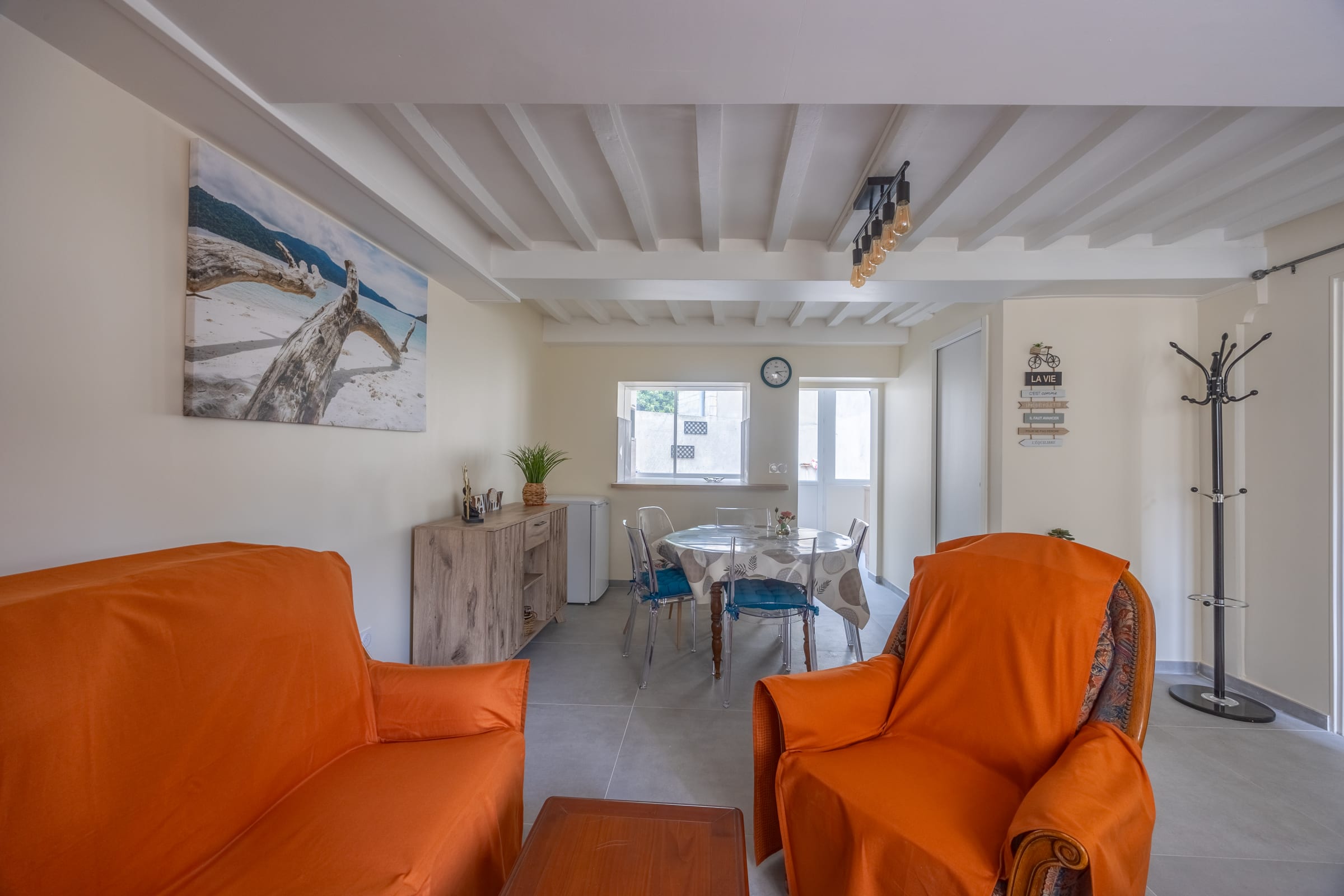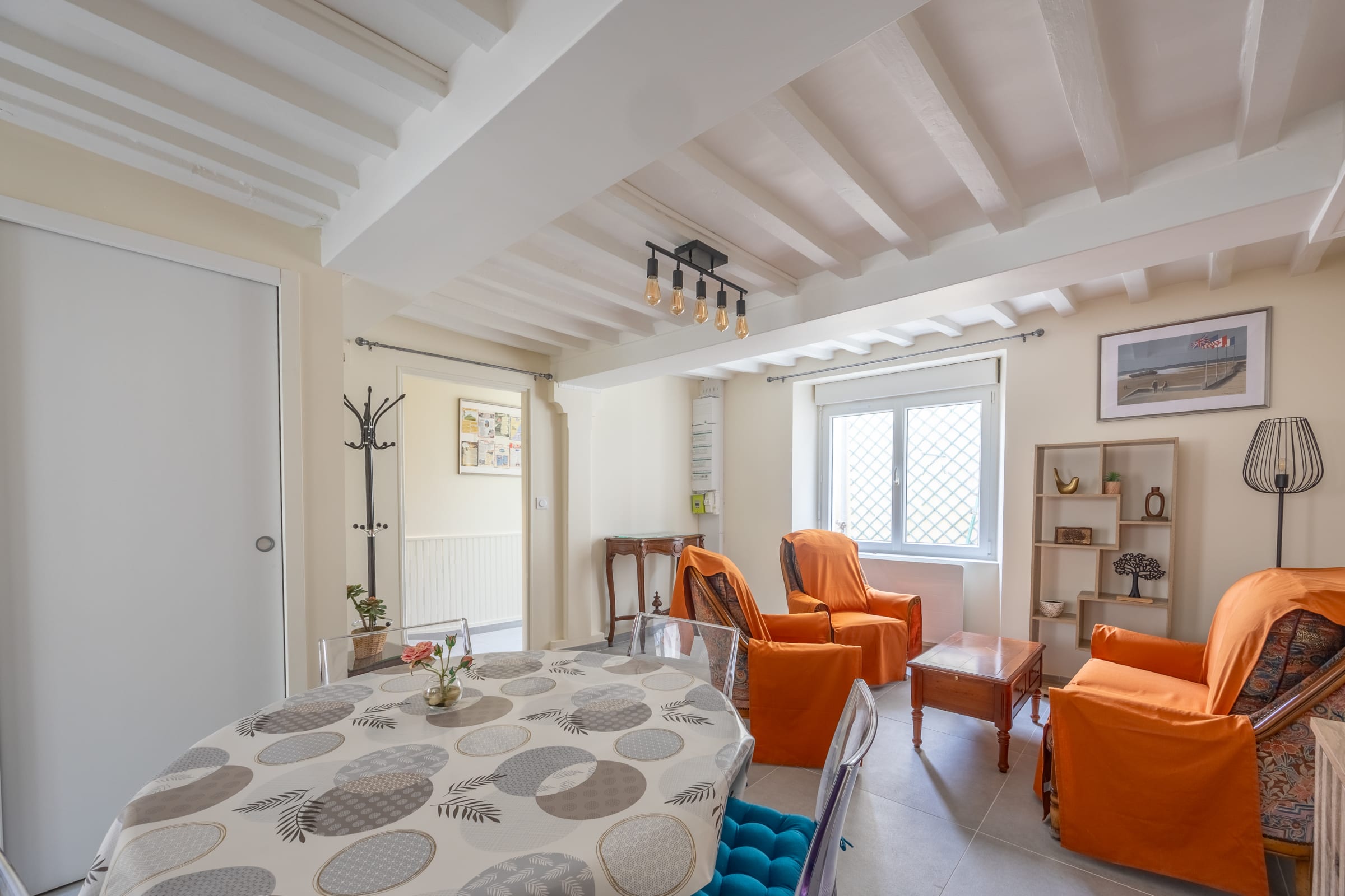 Petite maison de pécheur typique d'Arromanches, entièrement rénovée en 2024 pour y accueillir familles et amis. Cette maison bien qu'en centre-ville, est située au bout d'un chemin qui la met au calme de la ville. Une petite cour intérieure clos de murs dans le prolongement de la cuisine entièrement équipée, vous permet de vous détendre en toute tranquillité. Une pièce de vie mitoyenne de la cuisine.