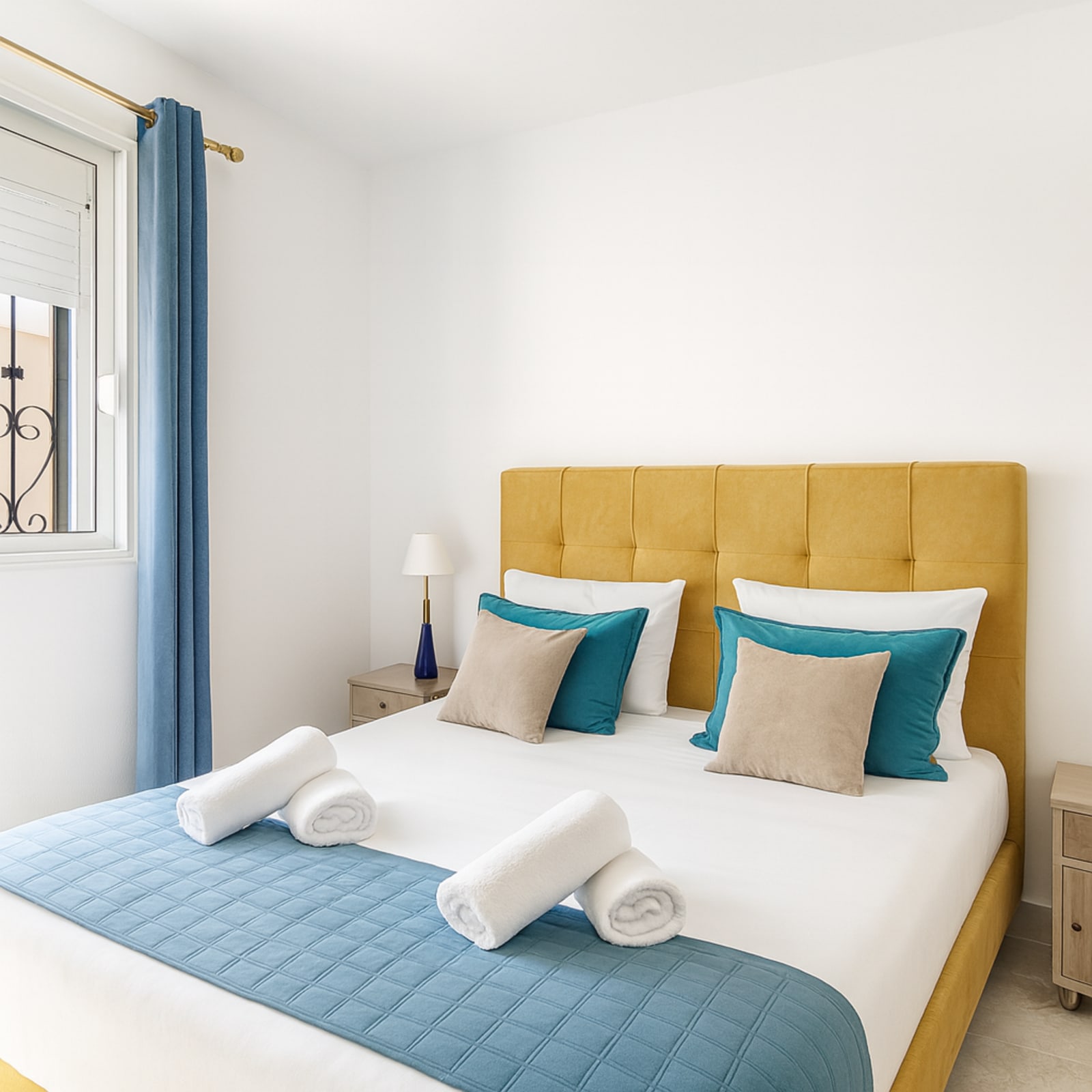 La chambre principale, spacieuse et soigneusement décorée, vous offre un lit double très confortable, une grande armoire pour ranger toutes vos affaires, ainsi qu’un bureau parfaitement adapté si vous souhaitez télétravailler durant votre séjour. Une seconde Smart TV est également disponible dans la chambre pour vos moments de repos.