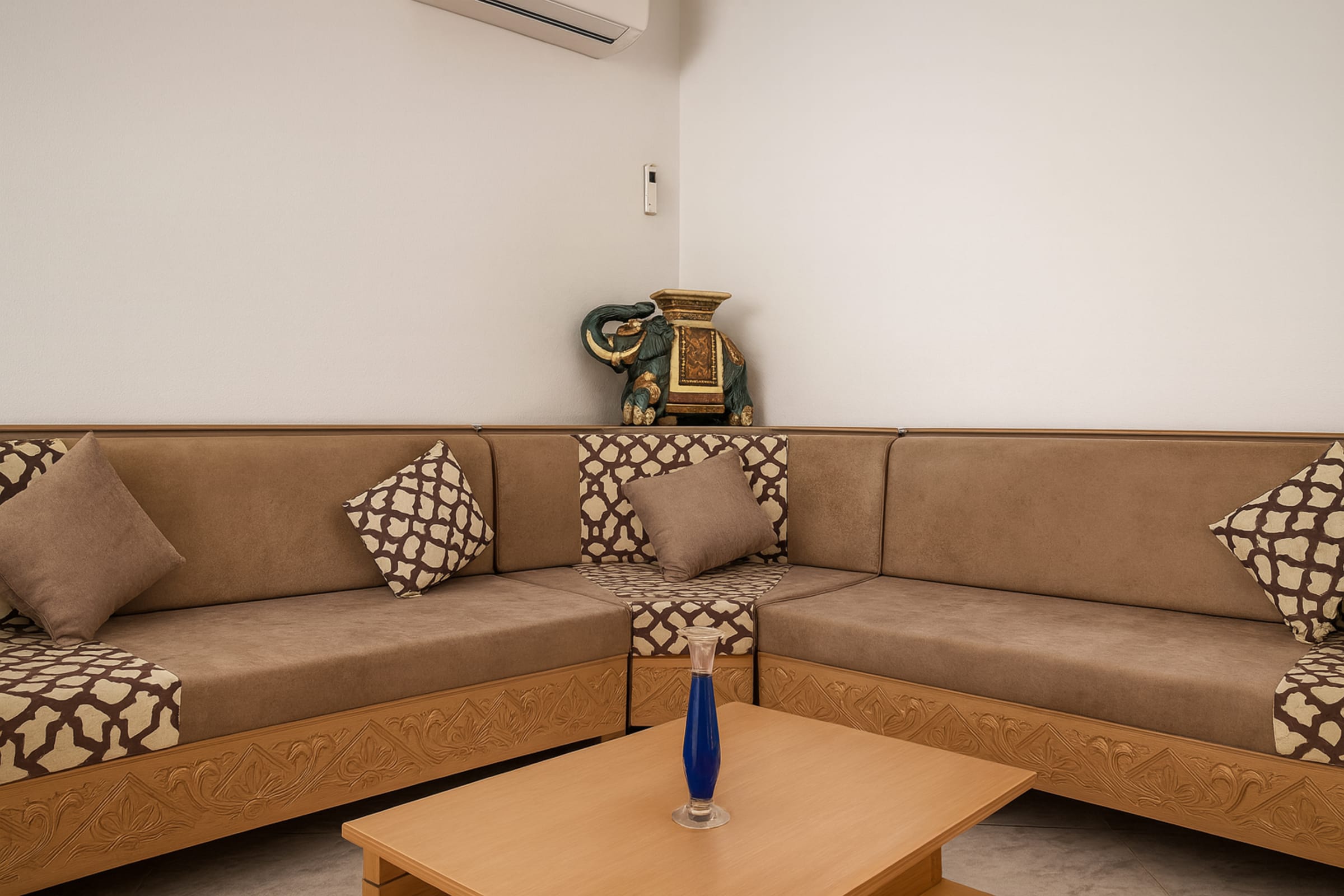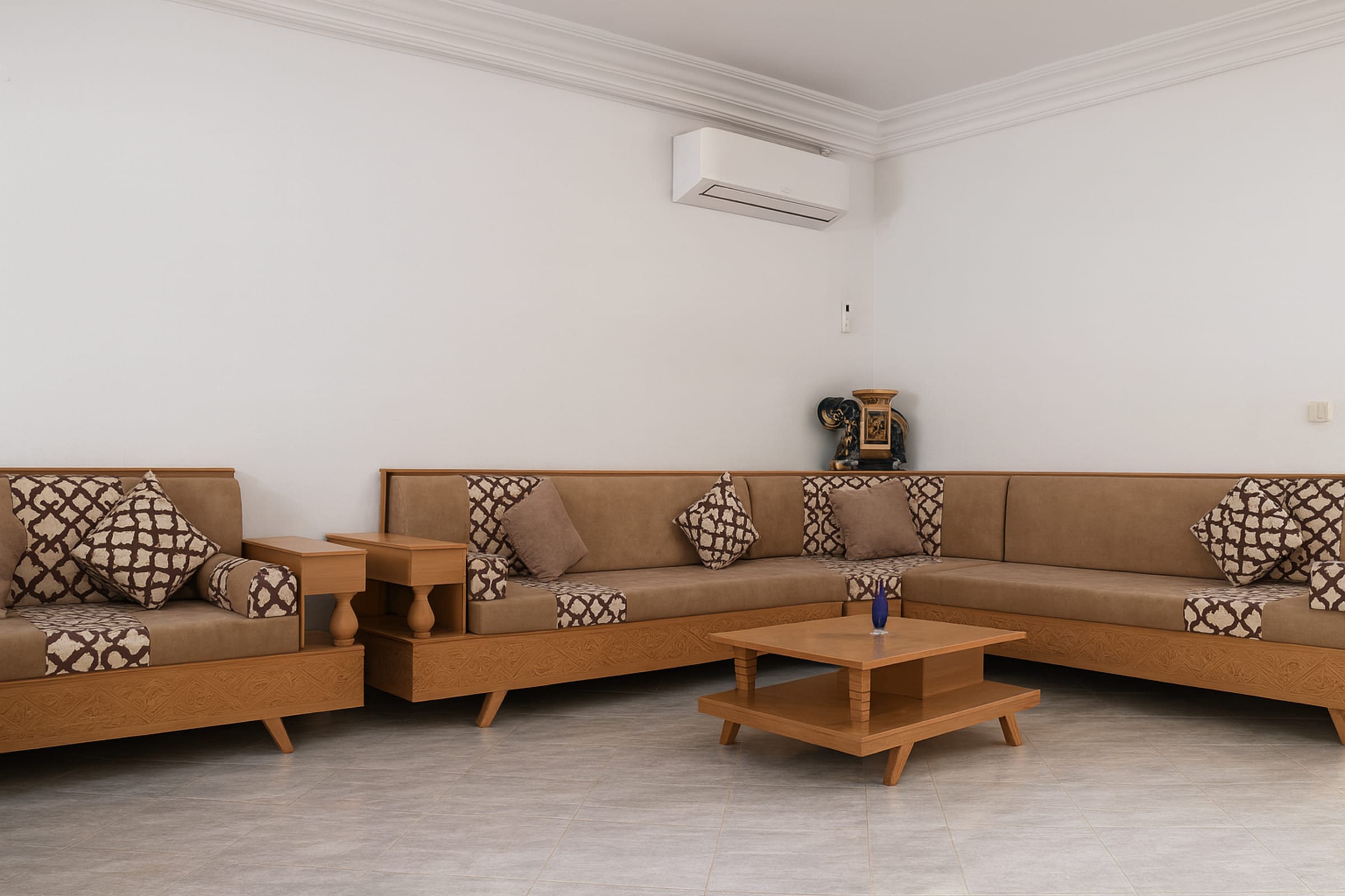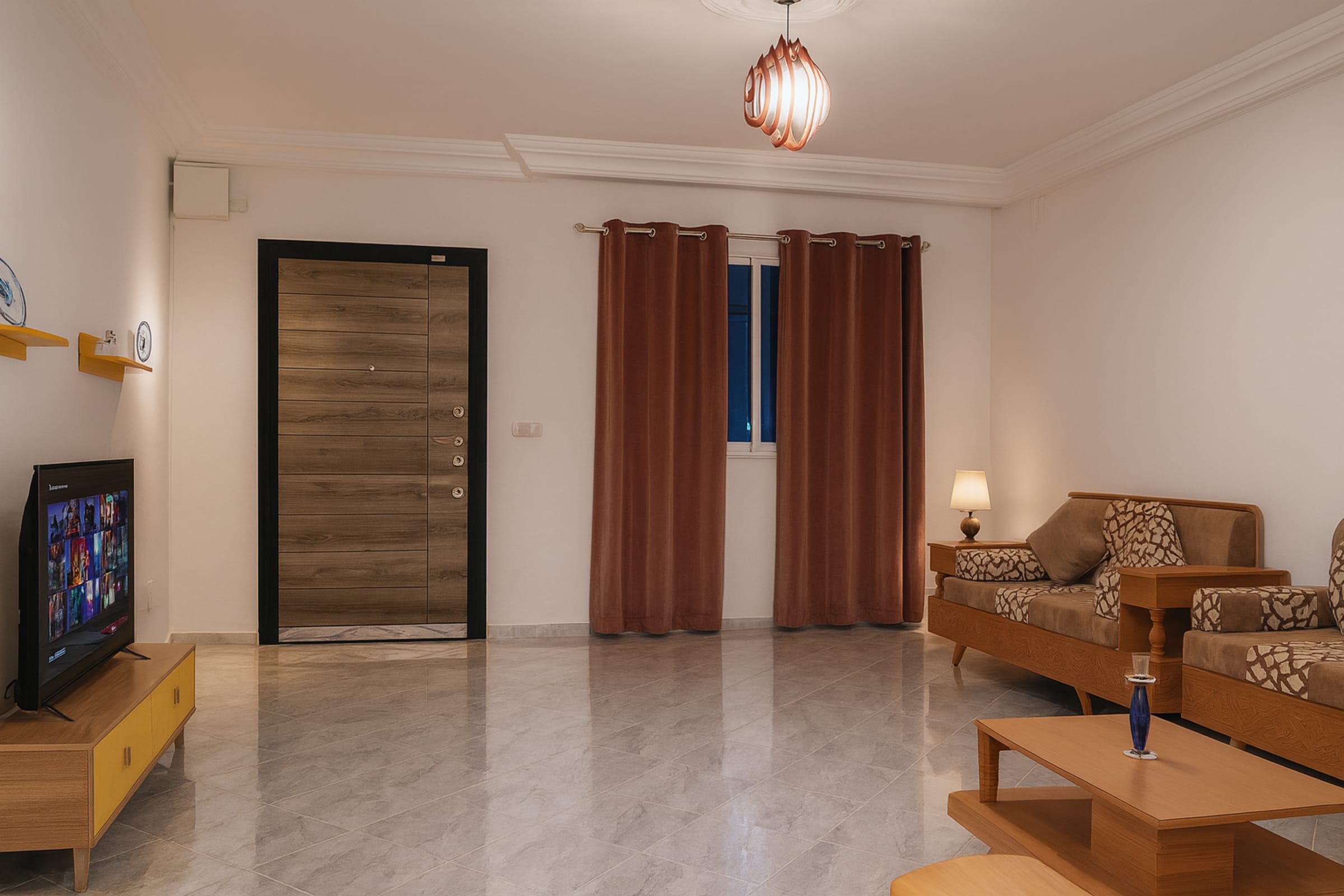 Dès votre entrée, un grand salon lumineux vous accueille avec une décoration chic et contemporaine. Cet espace est doté d’une Smart TV grand écran avec toutes les applications intégrées, offrant un véritable espace de divertissement. Les larges baies vitrées laissent entrer la lumière naturelle et offrent une belle vue sur l’extérieur, créant une atmosphère apaisante.