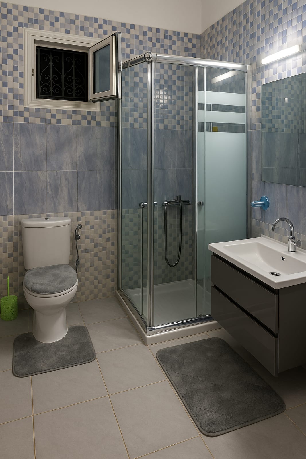 La salle de bain est moderne et élégante, équipée d’une douche à l’italienne, d’un lavabo design et de WC. Vous y trouverez un espace agréable pour vous préparer ou pour vous détendre après une journée sous le soleil de Hammamet.