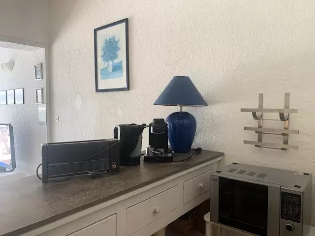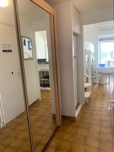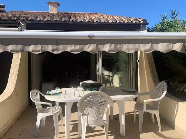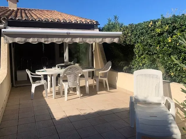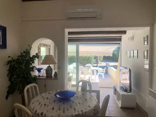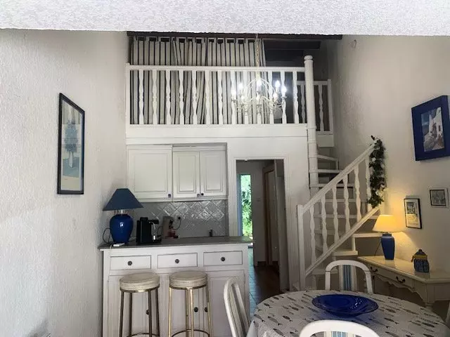 Très jolie villa type Appartement située dans un coin calme de la résidence. Chambre et mezzanine avec couchages lits en 140, 2 fauteuils rotin dans le séjour. La terrasse est couverte sur une partie seulement, elle est orientée sud-est, donc ensoleillée du matin au milieu de l'après-midi. Très joliment décorée. Lave-linge.