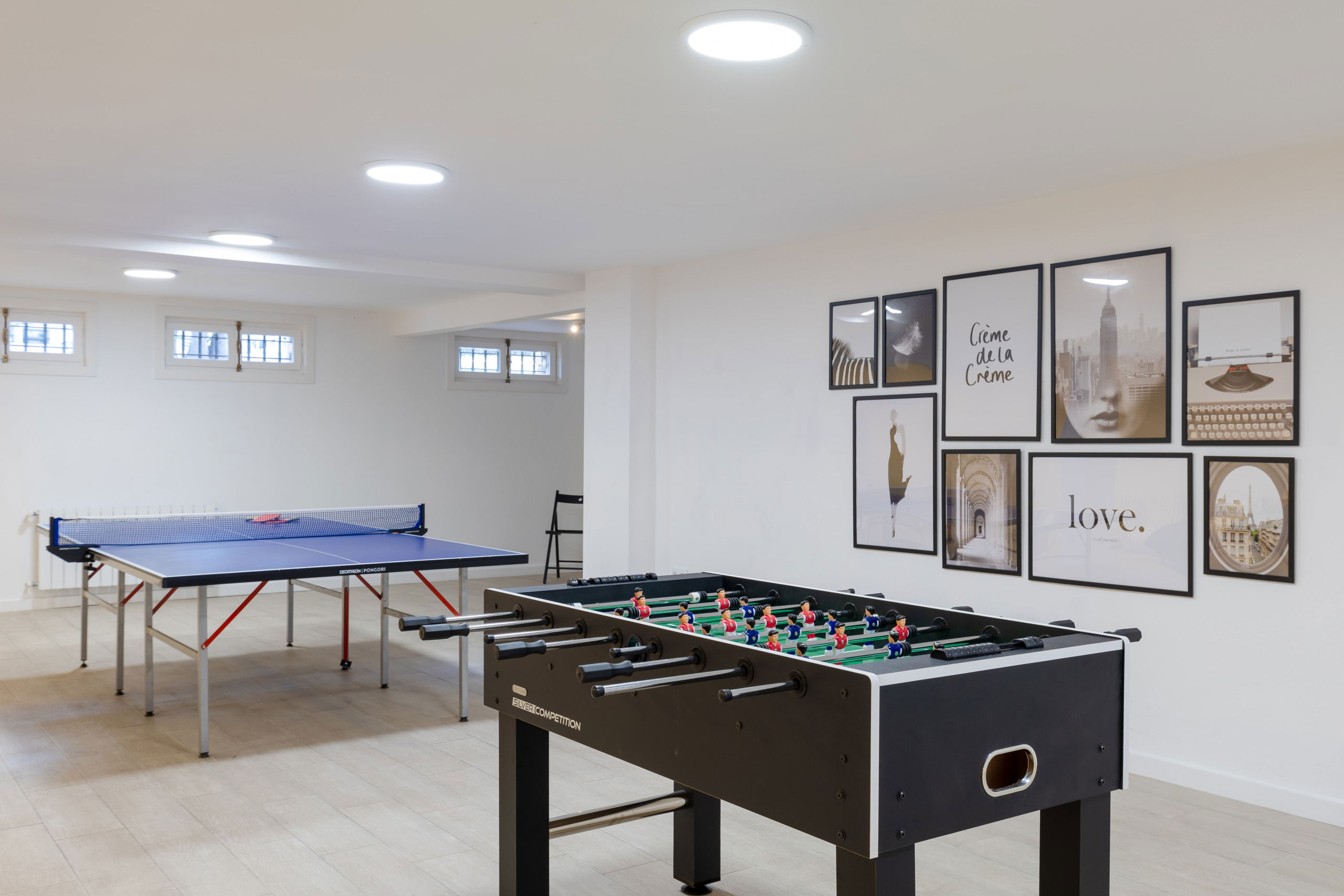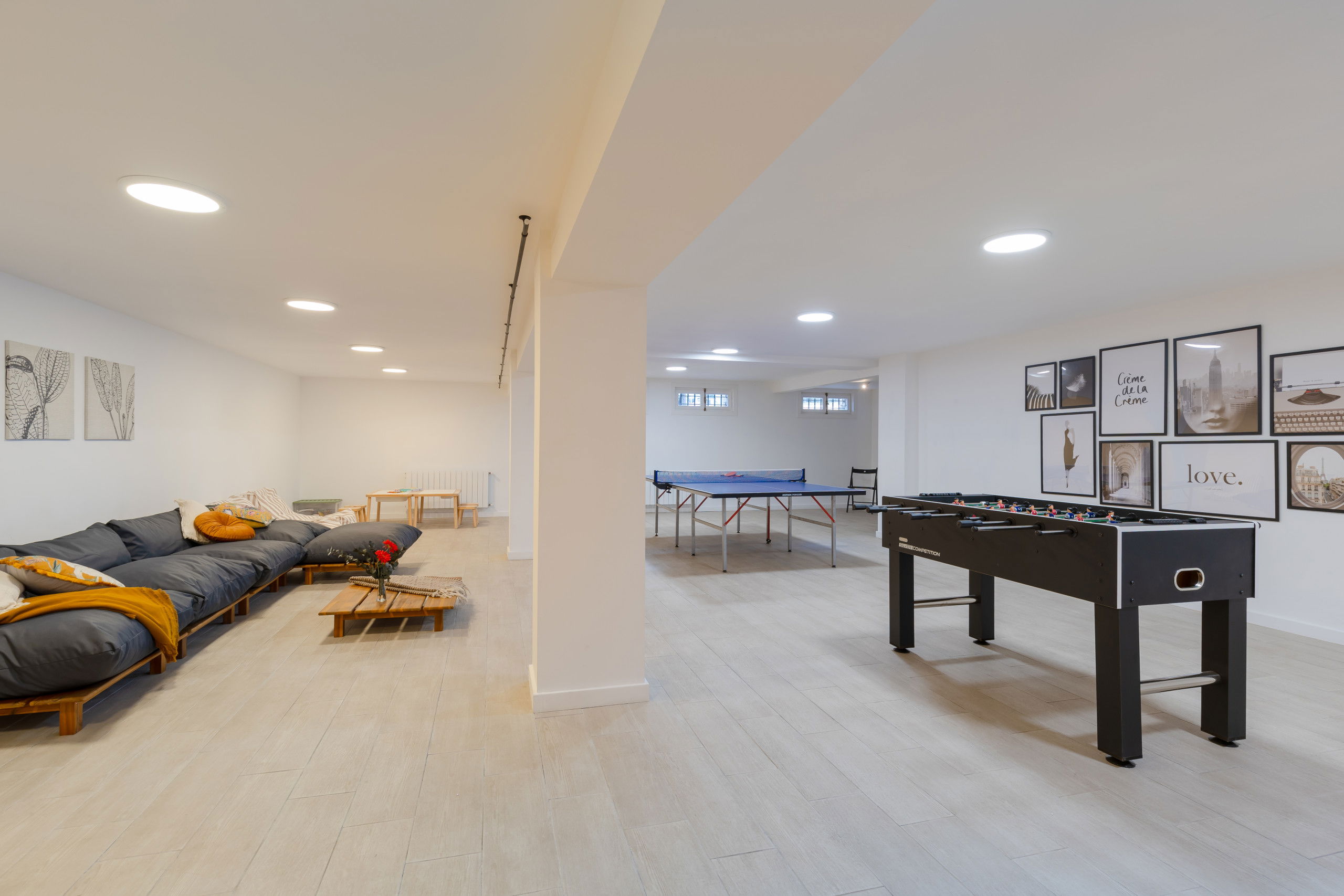 Le véritable grand salon avec un espace intérieur pour 16 personnes, dispose d'une cheminée chaleureuse, les intérieurs comprennent des salles de jeux pour enfants, des jeux de société pour adultes et une table de ping-pong. La propriété offre plusieurs zones extérieures pour se détendre. Une multitude de fenêtres inonde l'espace de lumière naturelle et accompagne une terrasse qui s'ouvre sur la piscine. Le jardin dispose d'une large zone chill out, d'une pelouse, d'un barbecue et d'une zone de repas, le tout avec une vue impressionnante sur la montagne.