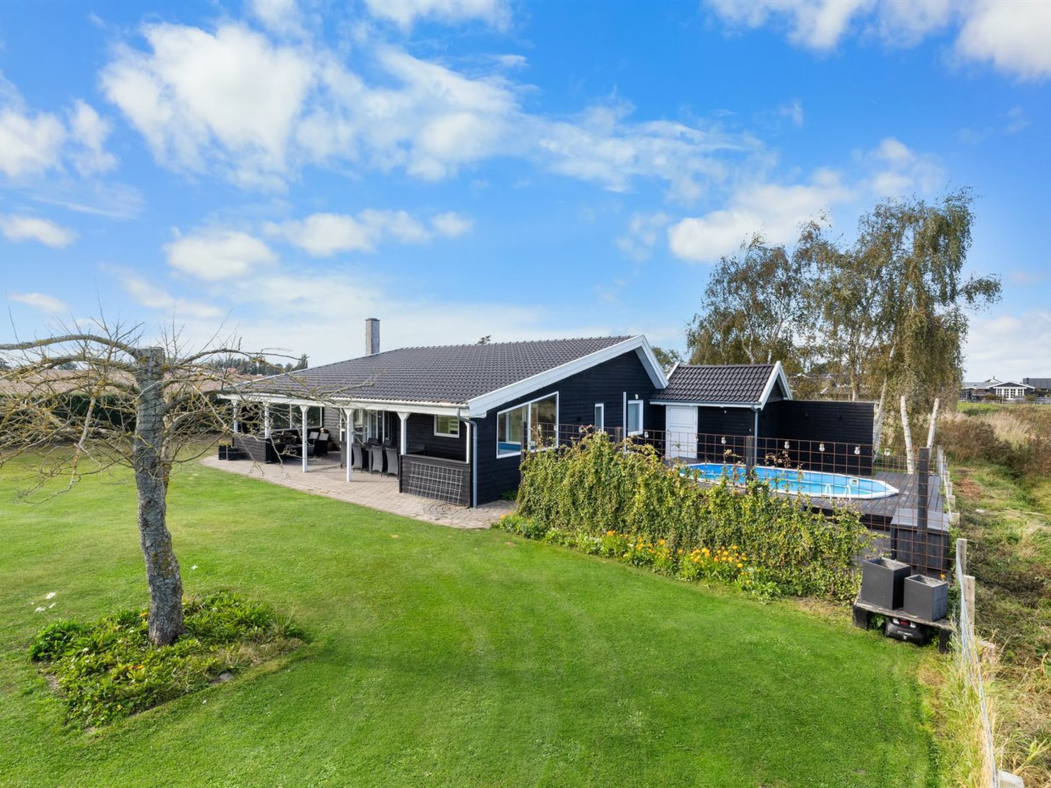 Maison individuelle, année de construction 1998. À 250 m de la mer. En commun: jardin. A usage privé: terrain 675 m2, jardin entretenu (clôturé), piscine (3 x 6 m, 18 m2, profondeur 120 - 120 cm, disponibilité saisonnière: 08.Sep. - 17.Oct.). Barbecue. Infrastructures de la Maison: lave-linge, sèche-linge. Place de parking près de la maison. Borne de recharge électrique. Magasin d'alimentation 2 km. Terrain de golf 5.6 km. Le propriétaire n'accepte pas les groupes de jeunes.