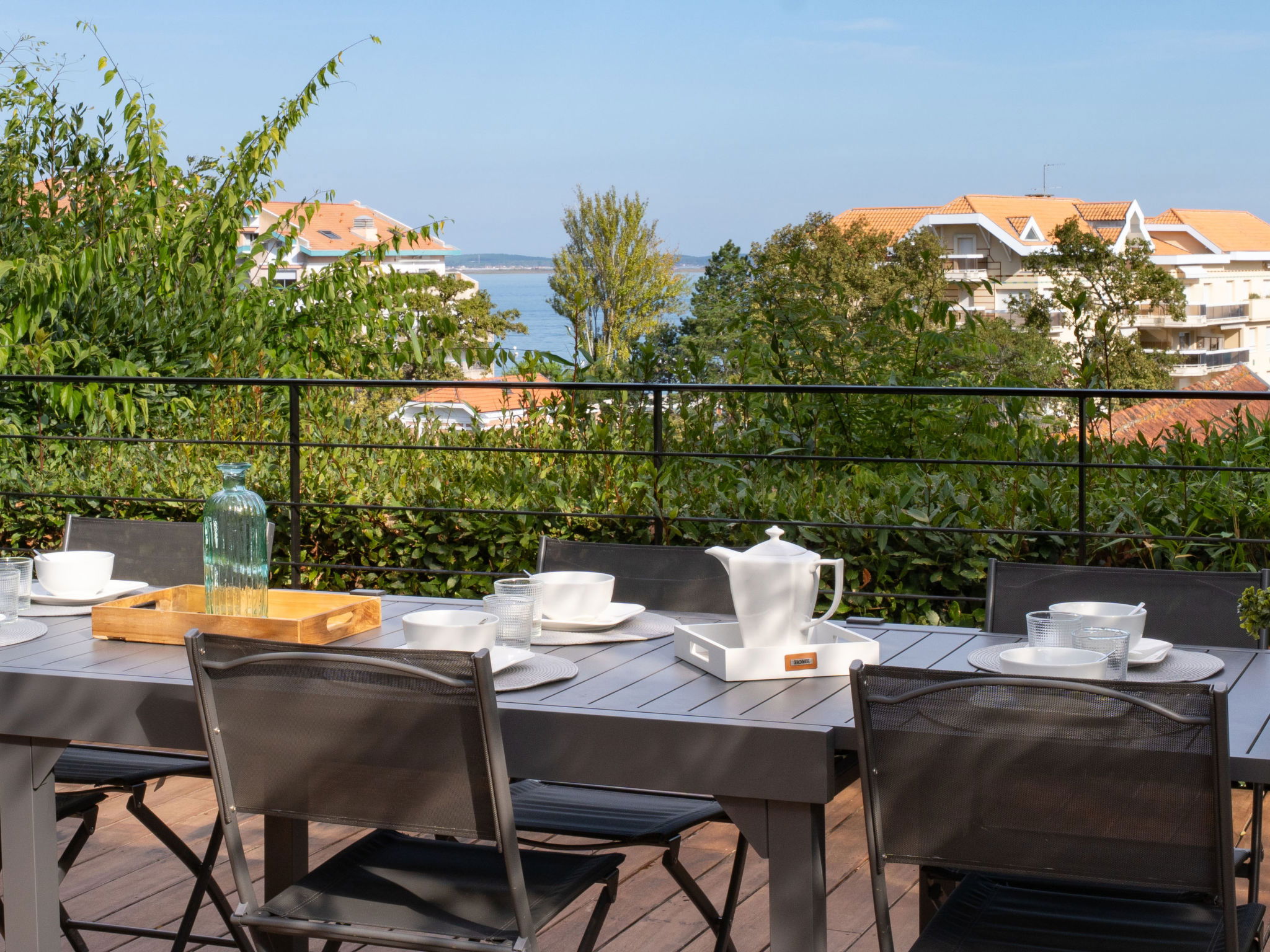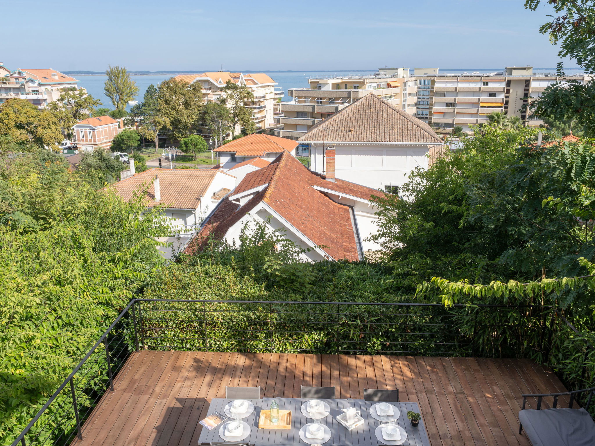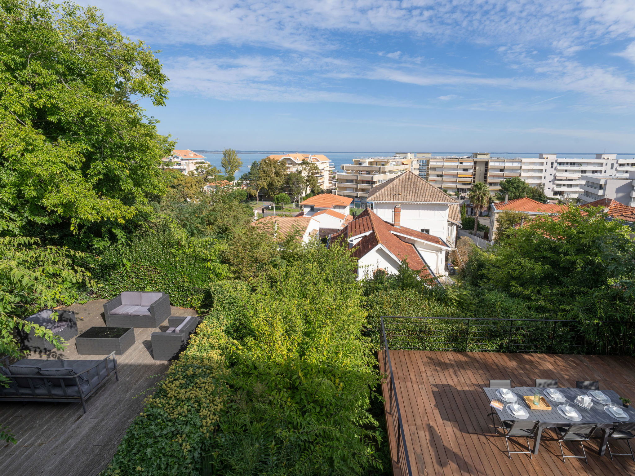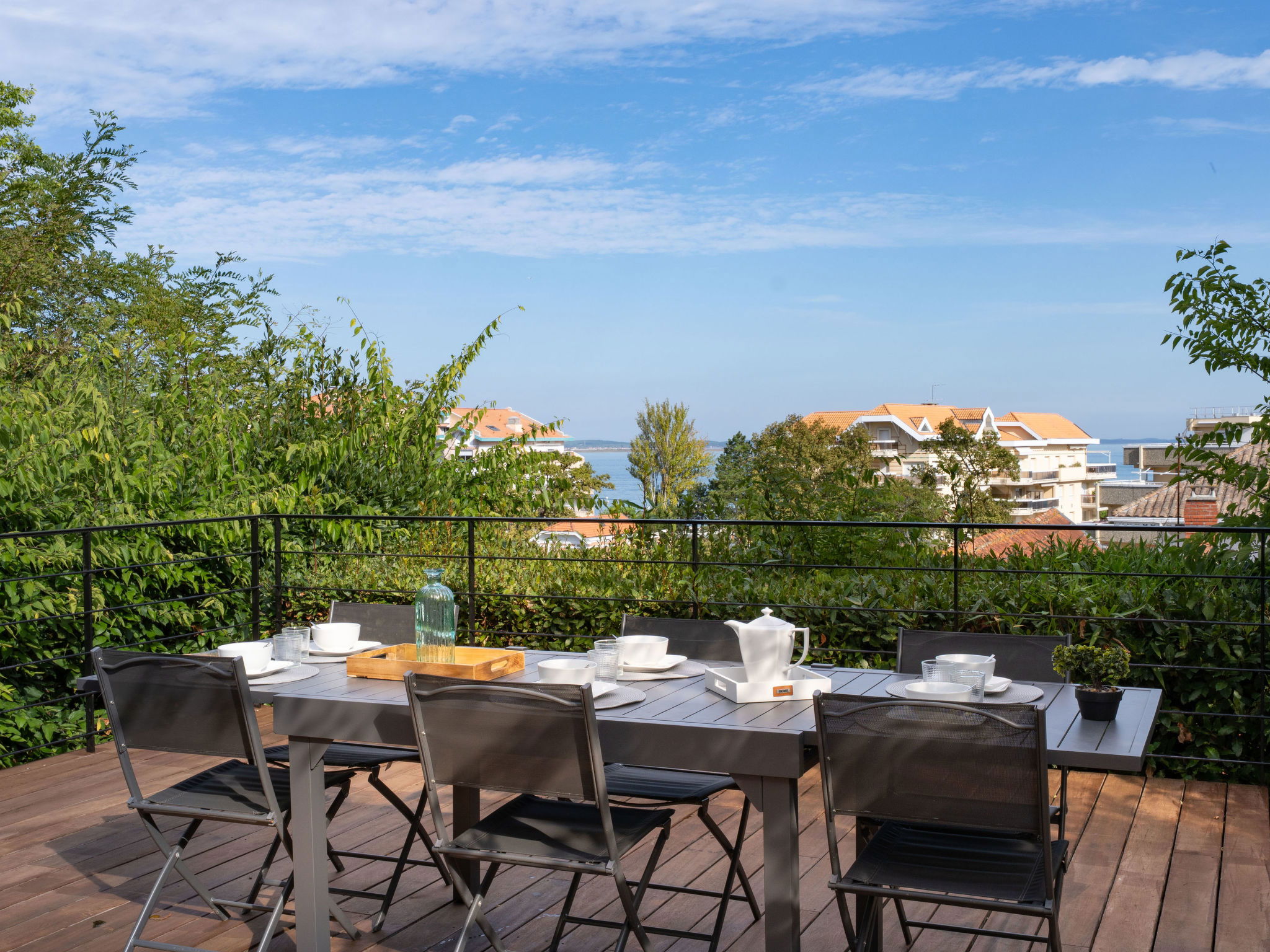 Maison 6 pièces 150 m2 sur 2 niveaux. Aménagement confortable et agréable: séjour avec TV (écran plat). Sortie sur la terrasse. Salle à manger avec TV (écran plat). Cuisine (four, lave-vaisselle, 4 plaques à induction, grille-pain, bouilloire électrique, micro-ondes, congélateur, cafetière électrique, Capsules pour machine à café (Nespresso) (NON INCLUSES)). Bain/WC, WC séparé. Chauffage au gaz. À l'étage supérieur: 1 chambre avec 1 grand-lit (1 x 160 cm, longueur 200 cm). Sortie sur le balcon, orientée nord et orientée est. 1 chambre avec 1 grand-lit (1 x 140 cm, longueur 190 cm). Sortie sur le balcon, orientée nord. 2 petites chambres, chaque chambre avec: 1 lit (80 cm, longueur 190 cm). Bain/WC. Petit balcon 6 m2, situation nord, grande terrasse 100 m2, situation nord et situation est, grande terrasse 50 m2, situation nord et situation est. Meubles de terrasse, barbecue. Très belle vue sur la mer et le Bassin d'Arcachon. A disposition: lave-linge, sèche-linge, fer à repasser, sèche-cheveux. Internet (Connexion WIFI, gratuit). Place de parking (2 Voitures). Veuillez noter: adapté(e) aux familles. Maximum 1 animal/ chien autorisé. Détecteur de fumée. Annonce d'un particulier (art 155, IV du CGI). 33009003173AD