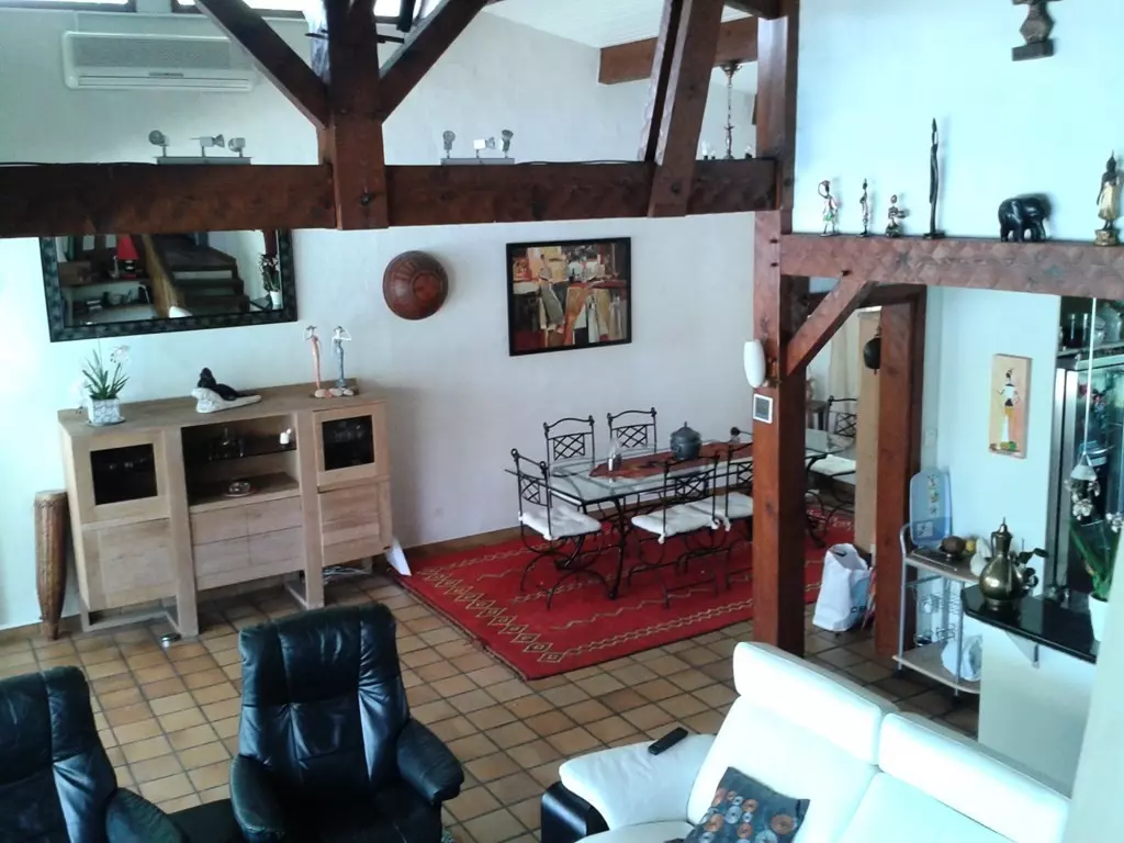 Salon-séjour : table, chaises, canapé, 2 fauteuils, écran plat LCD, buffet, de grandes baies vitrées donnent accès sur la piscine (Lit parapluie, table à langer, chaise haute à disposition)
