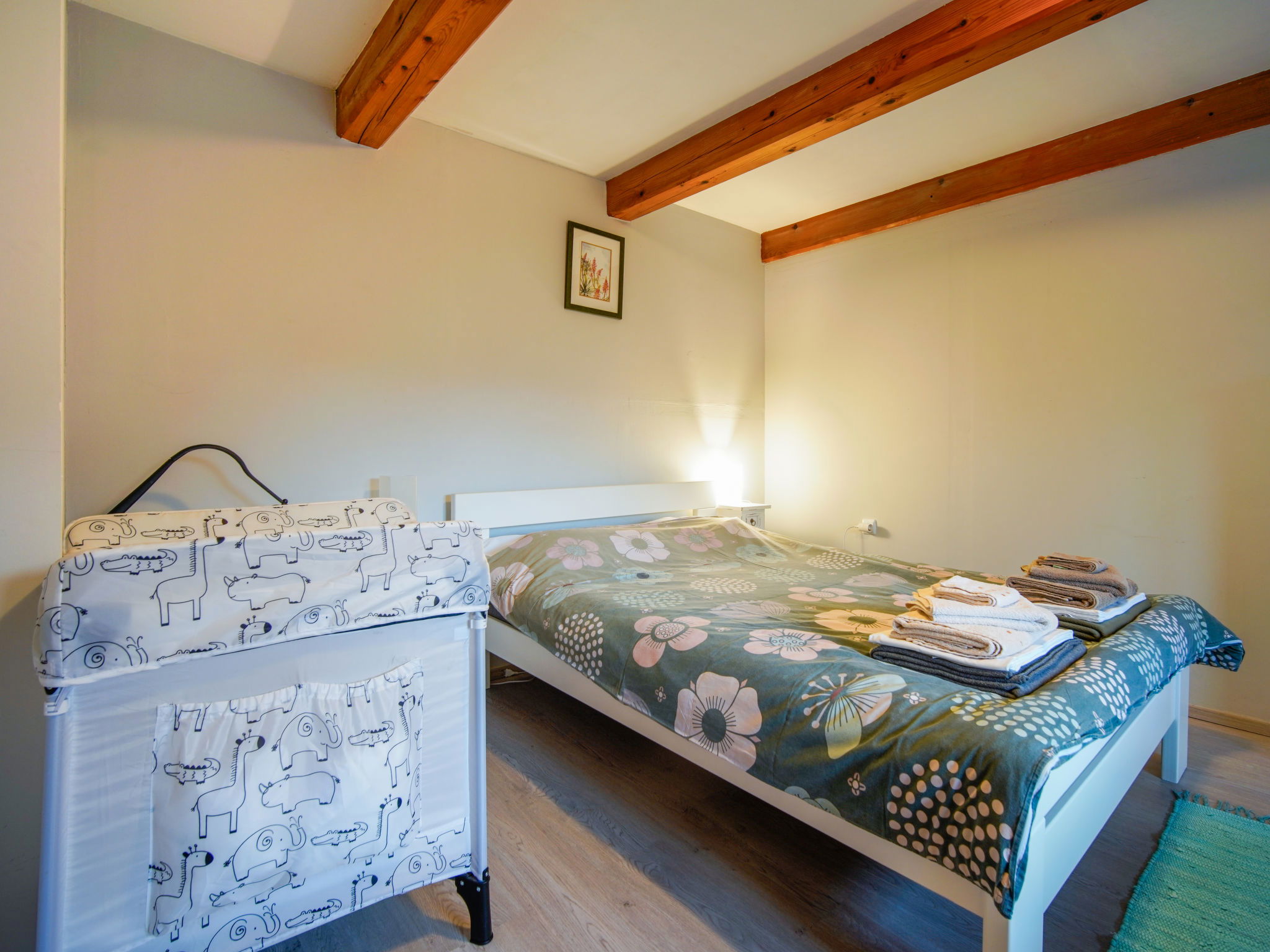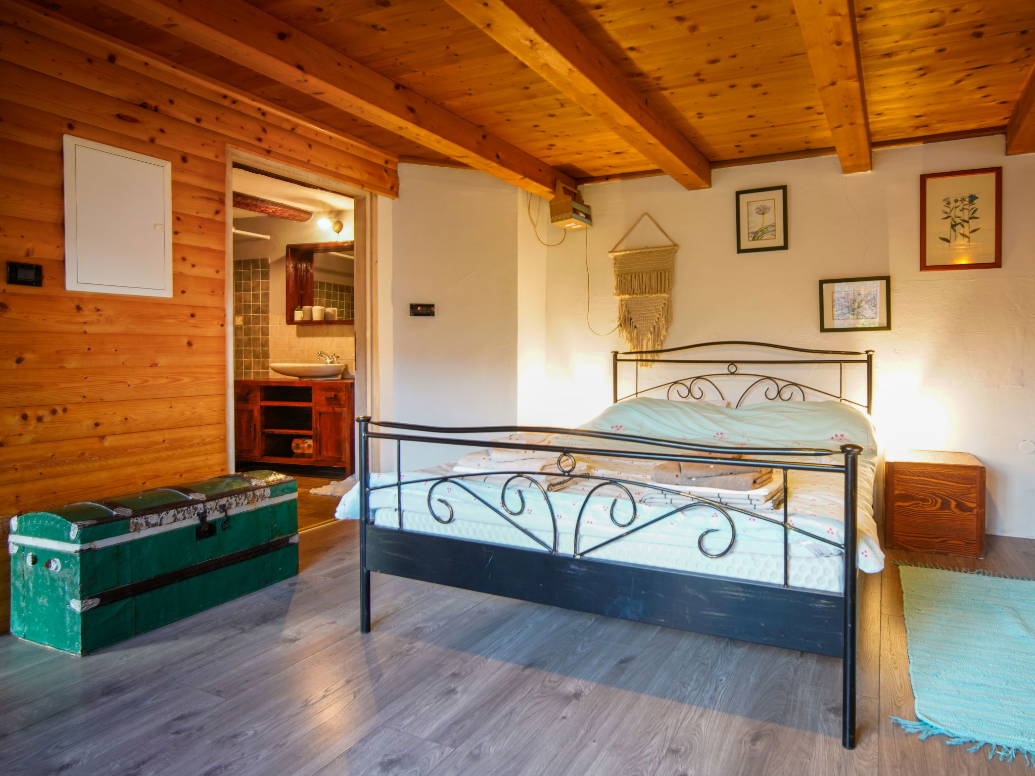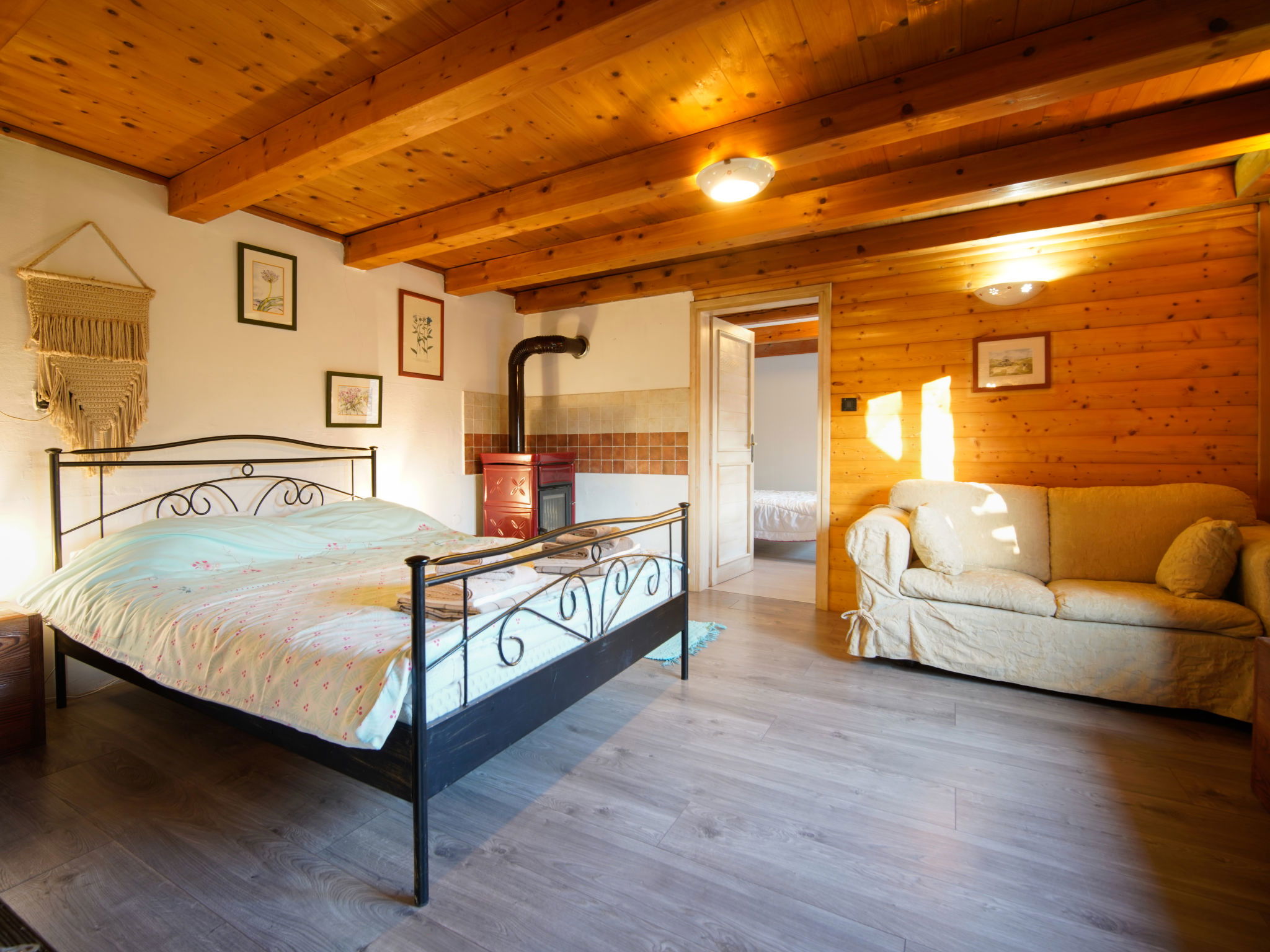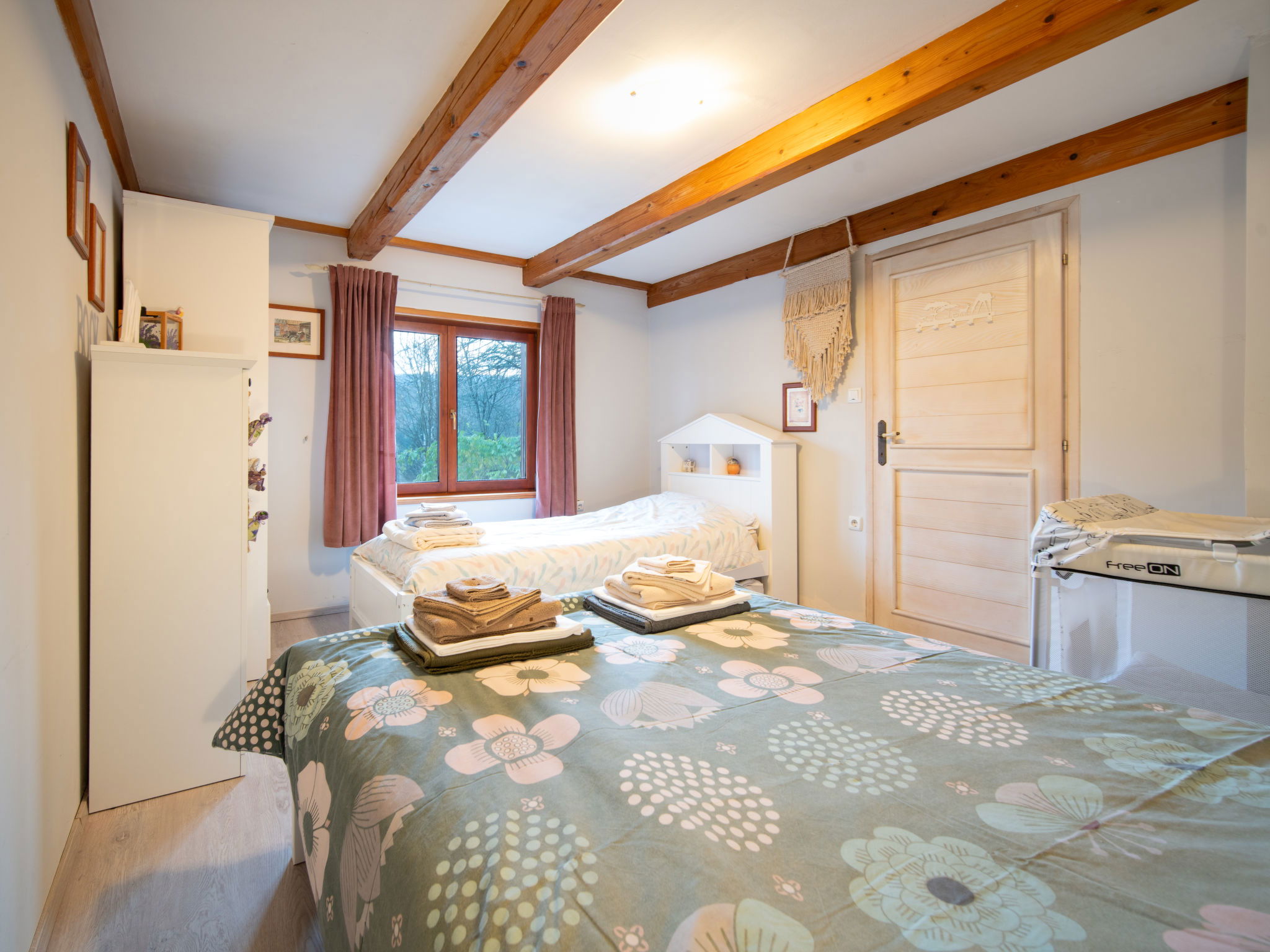 Maison 3 pièces 120 m2. Séjour/salle à manger avec TV (satellite). Chambre avec passage avec 1 grand-lit (160 cm, longueur 200 cm), poêle à bois. 1 chambre avec 1 lit (90 cm, longueur 200 cm), 1 grand-lit (140 cm, longueur 200 cm). Cuisine ouverte (4 plaques de cuisson, four, grille-pain, bouilloire électrique, micro-ondes, congélateur). Bain/WC. Chauffage électrique, chauffage au bois. Terrasse 15 m2. Meubles de terrasse. Vue sur la forêt. A disposition: coffre-fort, fer à repasser, moustiquaire, sèche-cheveux, bois (gratuit). Internet (Connexion WIFI, gratuit). Borne de recharge électrique. Veuillez noter: 2 animaux/ chiens autorisés. Extincteur.