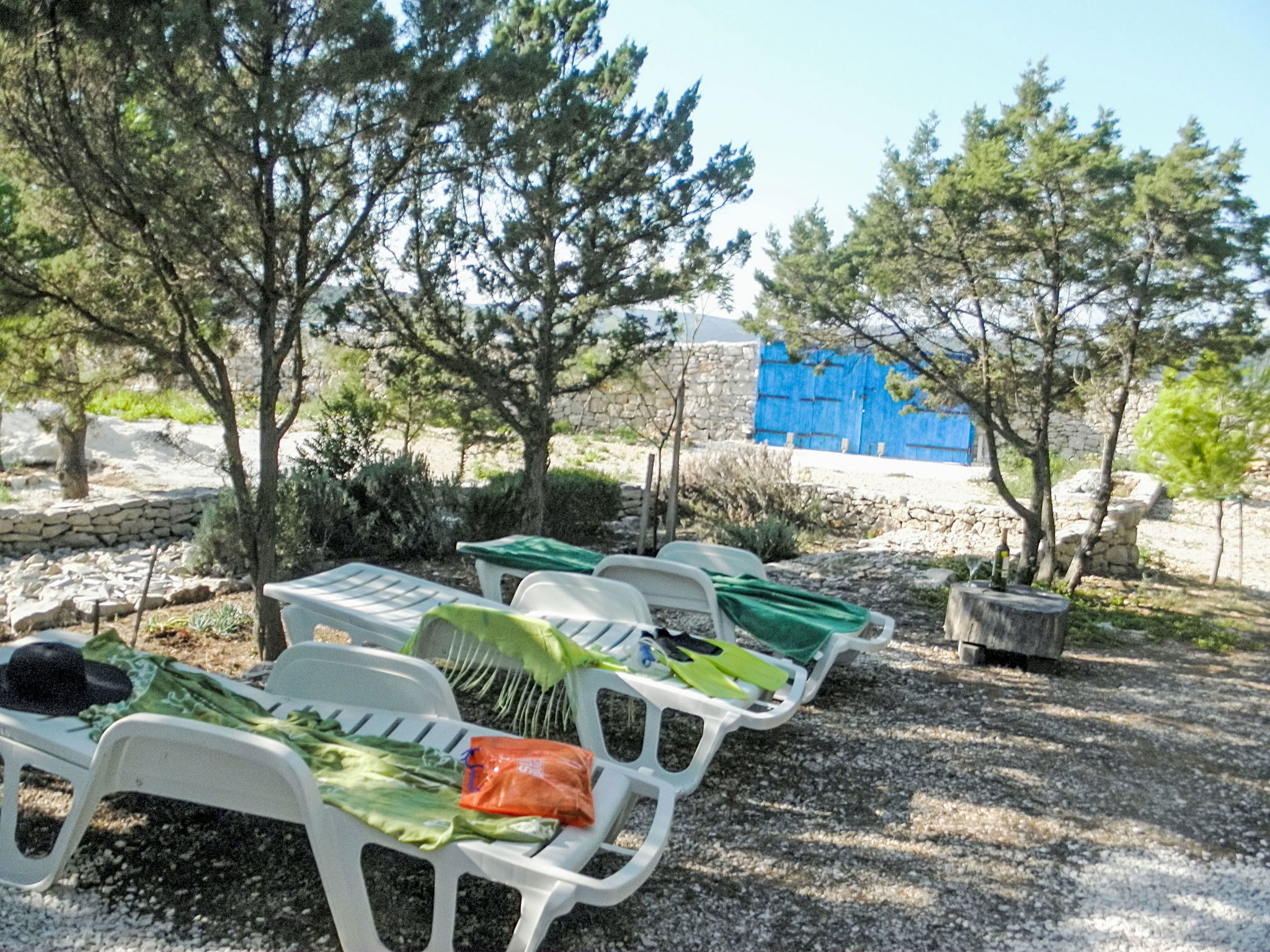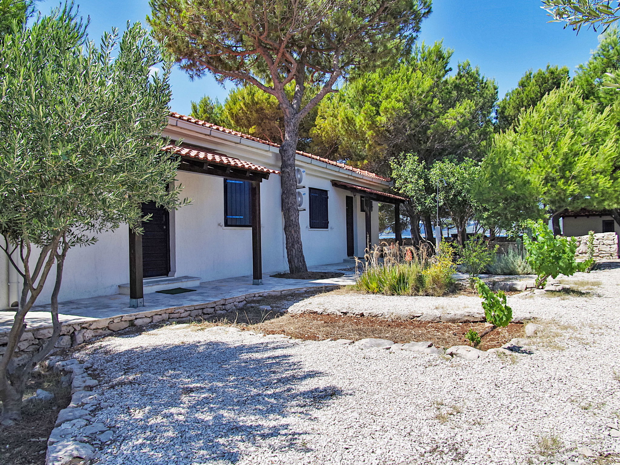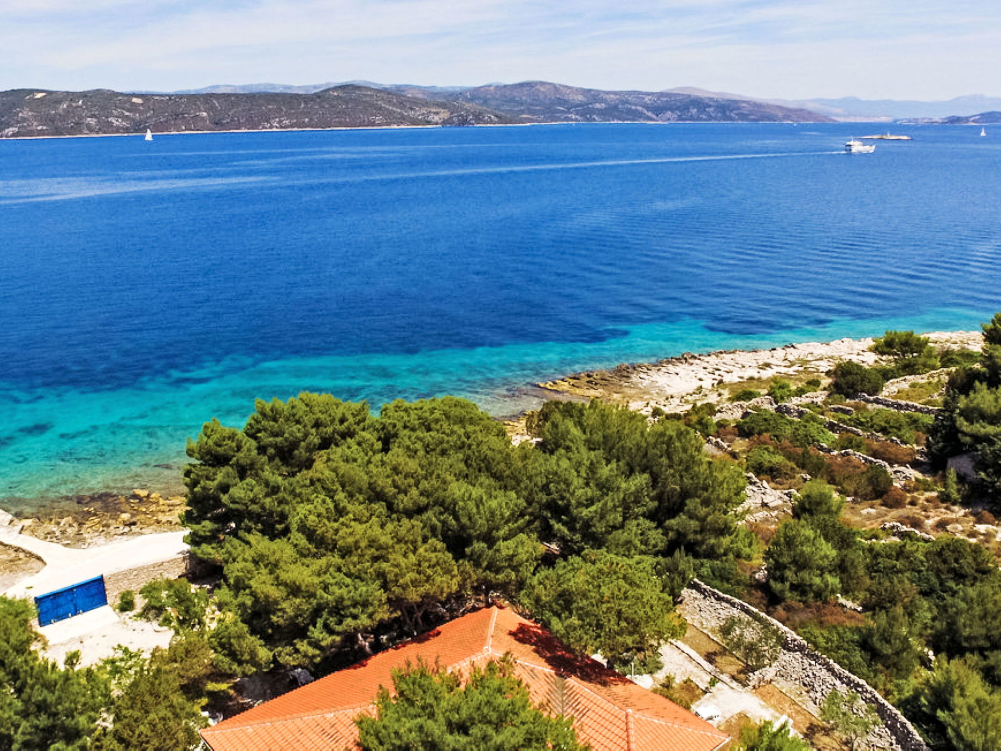 Maison "Blue". À 600 m du centre de Drvenik Mali, situation isolée, tranquille, ensoleillée, à 20 m de la mer, à 20 m de la plage. A usage privé: terrain 2'900 m2 (clôturé). Infrastructures de la Maison: accès internet, lave-linge. Accès en voiture (250 m chemin non goudronné). Place de parking près de la maison sur le terrain. Magasins, restaurant 550 m, arrêt de bus 15 km, ferry 600 m, plage de galets 20 m. Veuillez noter: place d'amarrage privée (en sus) sur demande. Aéroport 21 km de la maison. Pas d'eau courante dans la maison.