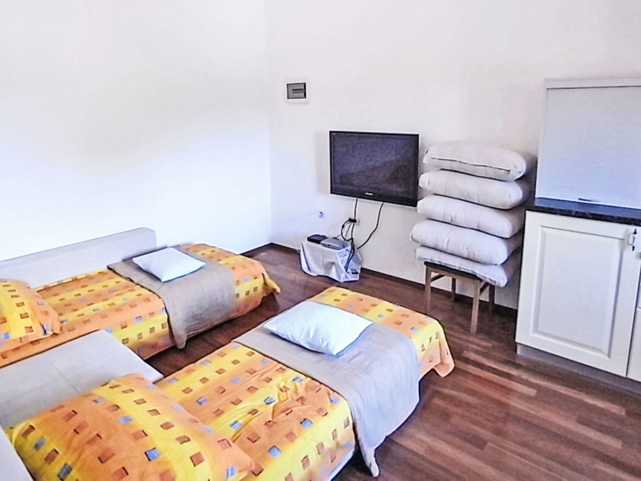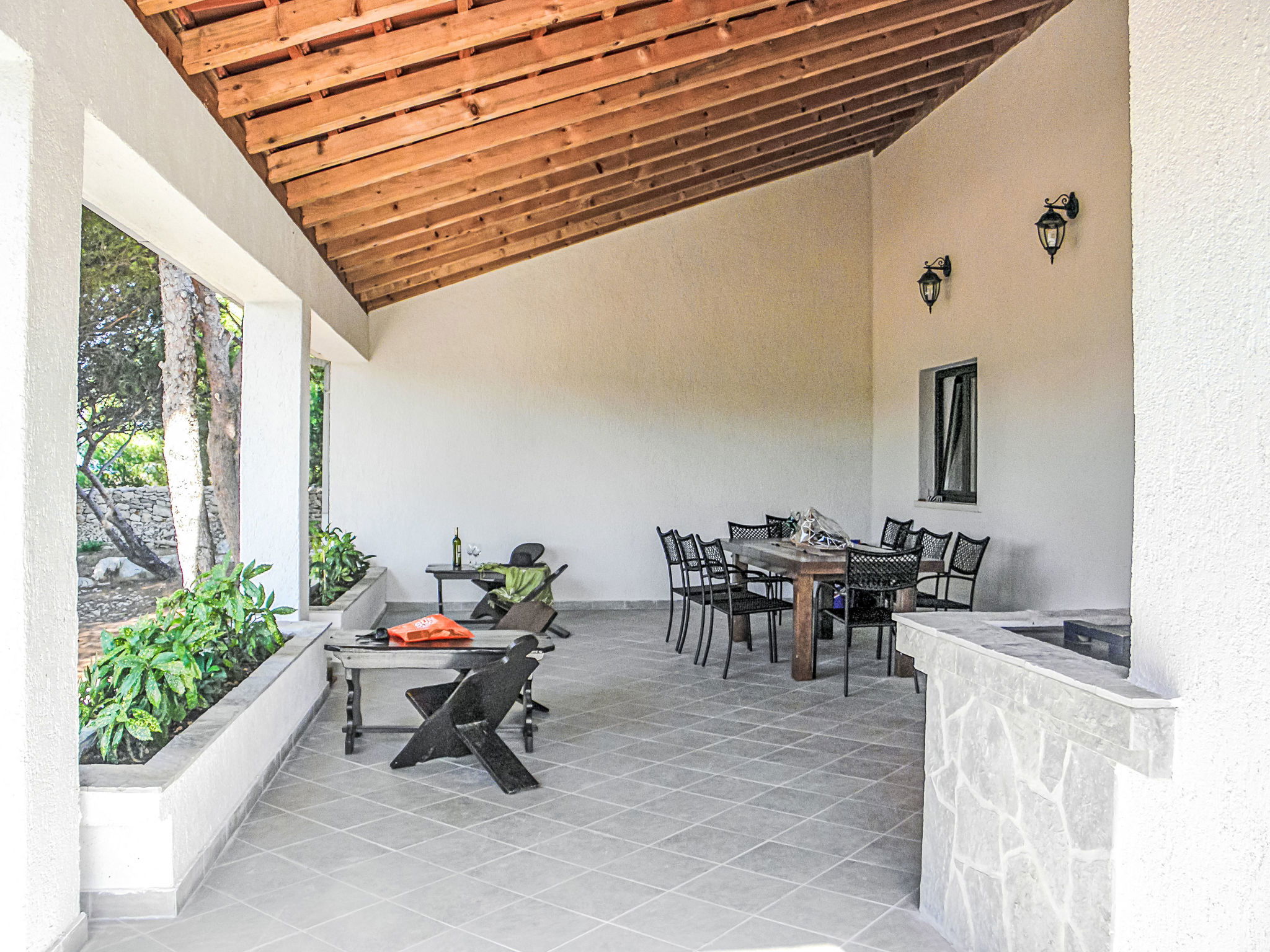 Maison 5 pièces 230 m2. Grand séjour/salle à manger. Sortie sur la terrasse. Séjour/chambre à coucher avec 1 divan-lit double (160 cm, longueur 200 cm), coin-cuisine, douche/WC, TV (satellite), air-conditionné et ventilateur. 1 chambre avec 1 grand-lit (160 cm, longueur 200 cm). Séjour/chambre à coucher avec 1 divan-lit double (160 cm, longueur 200 cm), coin-cuisine, douche/WC, TV (satellite), air-conditionné et ventilateur. 1 chambre avec 1 grand-lit (160 cm, longueur 200 cm). Cuisine ouverte (four, lave-vaisselle, 4 plaques vitrocéramiques, grille-pain, bouilloire électrique, micro-ondes, congélateur, cafetière électrique). Sortie sur la terrasse. WC séparé. Grande terrasse 30 m2, couverte. Meubles de terrasse, barbecue (portable). Superbe vue panoramique sur la mer. A disposition: lit bébé. Internet (Connexion WIFI, gratuit). Maximum 2 animaux/ chiens autorisés. Pas de liaison interne entre les différentes unités.