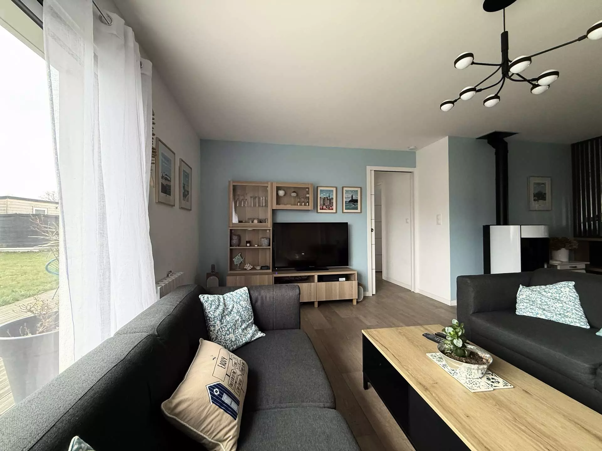 - Espace salon (canapés, télévision), poêle à granulés.