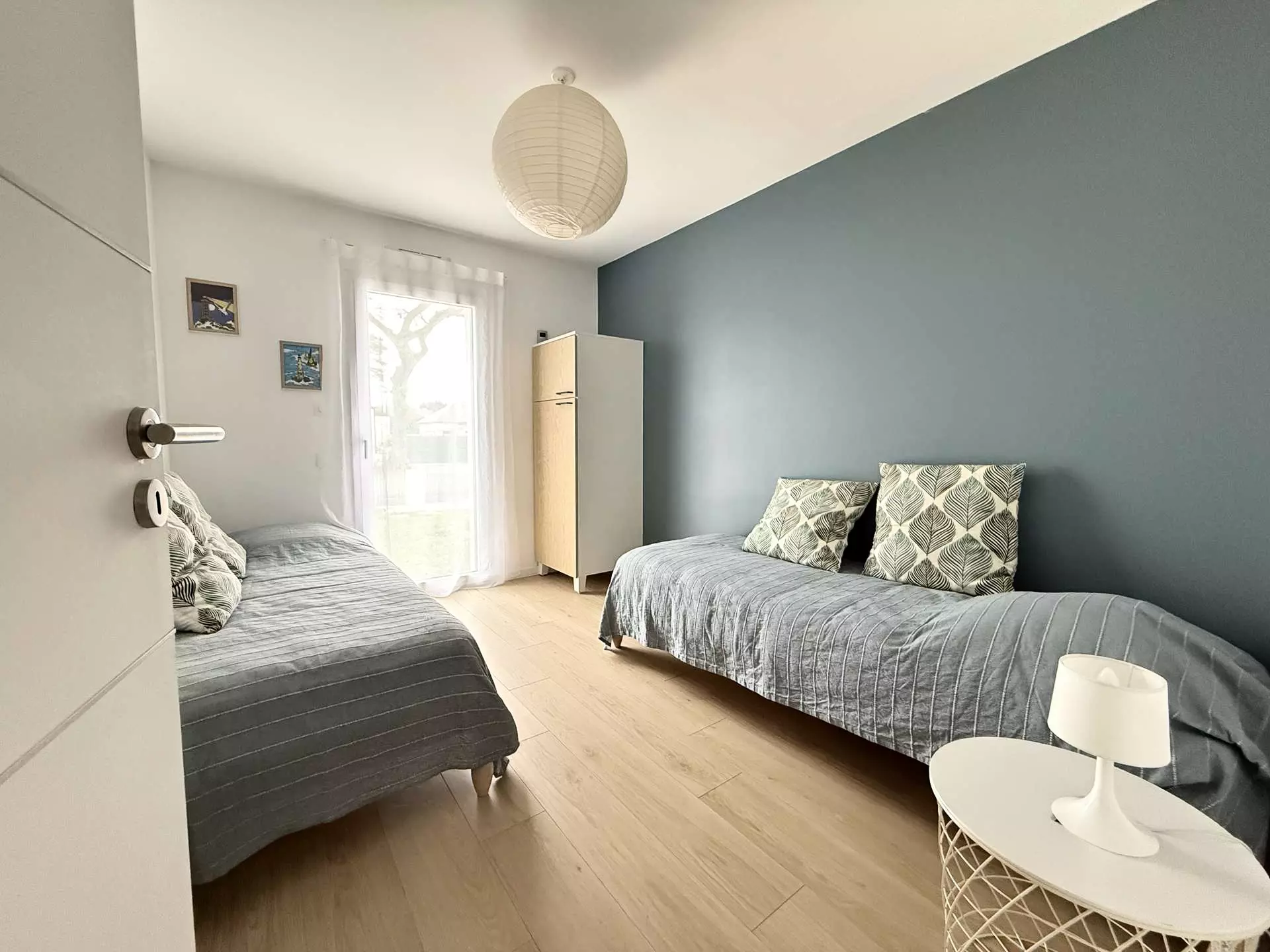 - Chambre 2 : deux lits simples 80×200 cm pouvant être rapprochés, placard.