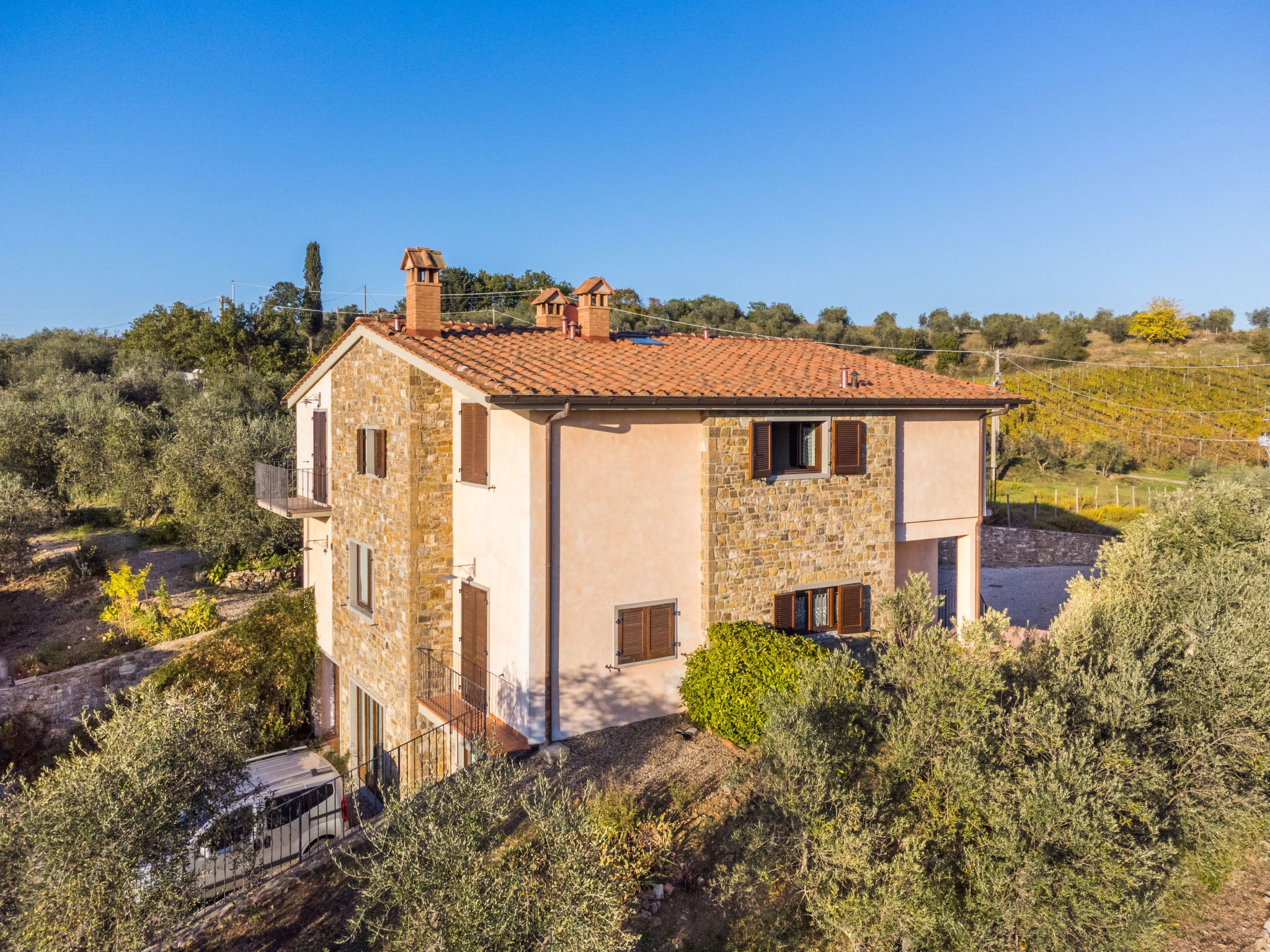 Maison à 3 apts accueillante, rustique "Montechioccioli", environnée par les vignobles. 3 appartements dans la même entité. Dans le hameau de Rietine, à 4 km du centre de Gaiole in Chianti, à 12 km du centre de Radda in Chianti, à 40 km du centre de Siena. En commun: jardin sur plusieurs niveaux, 1'000 m2 avec plantes et arbres, jardin naturel, piscine (12 x 6 m, profondeur 170 cm, disponibilité saisonnière: 02.Mai. - 03.Oct.). Douche/WC dans l'espace piscine, terrasse, barbecue. Infrastructures de la Maison: lave-linge (en commun). Place de parking sur le terrain. Borne de recharge électrique. Magasin d'alimentation 4 km, supermarché 15 km, arrêt de bus 140 m. Groupes de jeunes sur demande seulement. Vente locale de produits de la ferme. Veuillez noter: le propriétaire habite sur le même terrain.