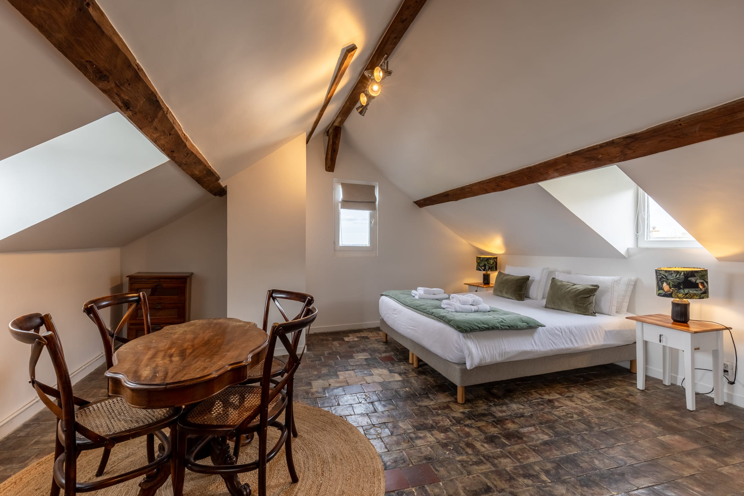 Dernier niveau : un espace ouvert avec plafond cathédrale, deux espaces nuits, l'un avec lit 160/200 cm, le second avec lit simple 90/140 cm, idéal pour 1 enfant, une salle de douche avec wc et un salon.