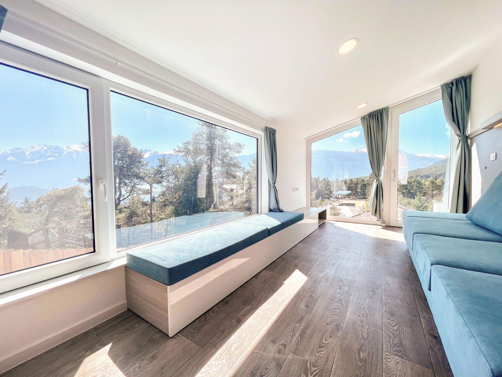 "SKYLIGHT", chalet 3 pièces 60 m2, situation sud-ouest. Aménagement moderne et luxueux: 1 chambre double. Sortie sur la terrasse. 1 chambre avec 2 lits et TV (écran plat). Cuisine/séjour (mini-four, lave-vaisselle, 4 plaques à induction, grille-pain, bouilloire électrique, micro-ondes, cafetière électrique) avec 1 divan-lit, table pour les repas, bar et TV (satellite) (écran plat). Sortie sur la terrasse. Douche/WC. Chauffage, air-conditionné. Sol en parquet. Grande terrasse 15 m2, situation sud et situation ouest. Meubles de terrasse. Superbe vue panoramique sur les montagnes. Veuillez noter: maison non-fumeur. 1 animal/ chien autorisé.