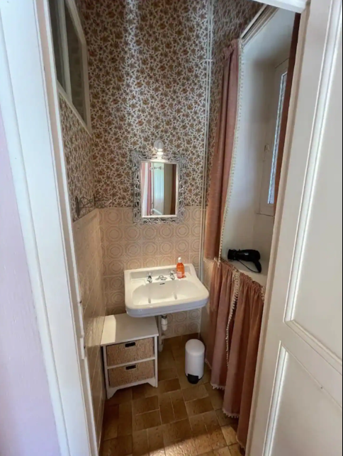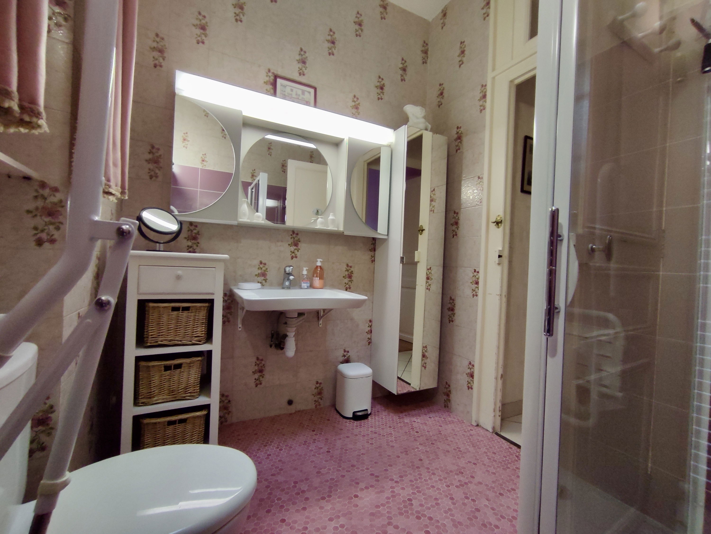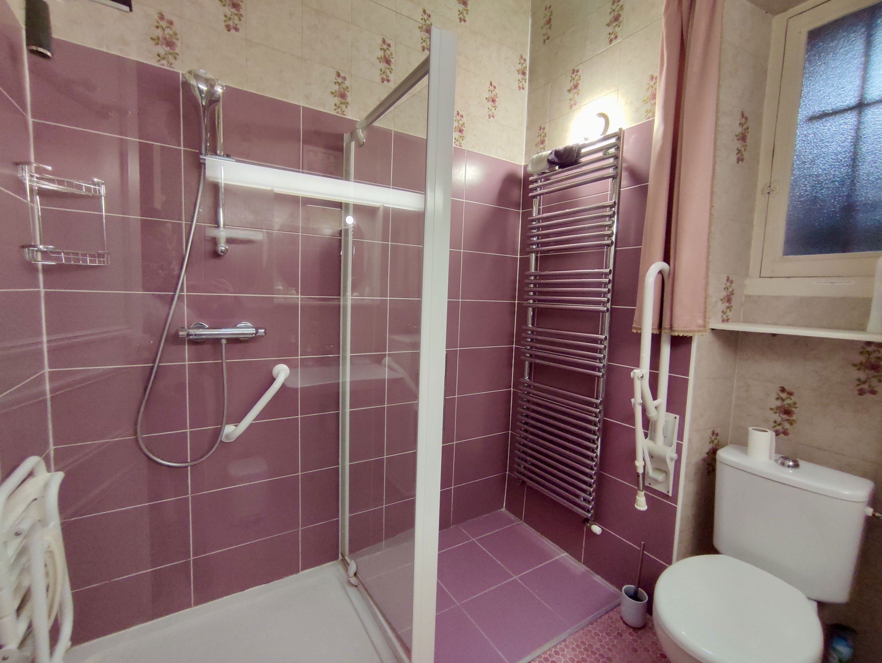 La SDE comprend une grande douche italienne avec poignée et siège, un WC, une vasque, un sèche-serviette et un sèche-cheveux.