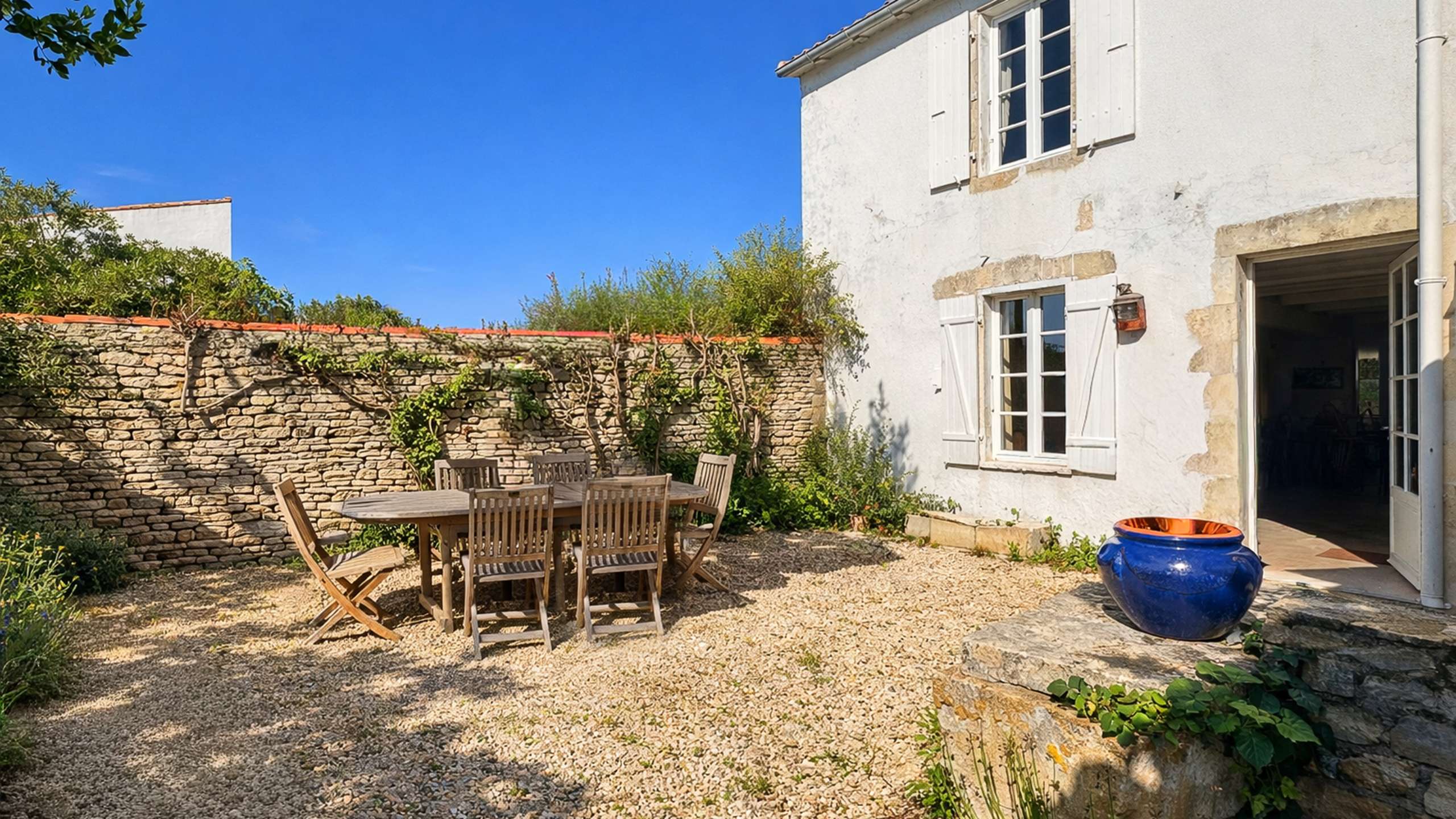 EXTERIEUR: une cour orientée au sud de 50m² avec meubles de jardin, parasol.