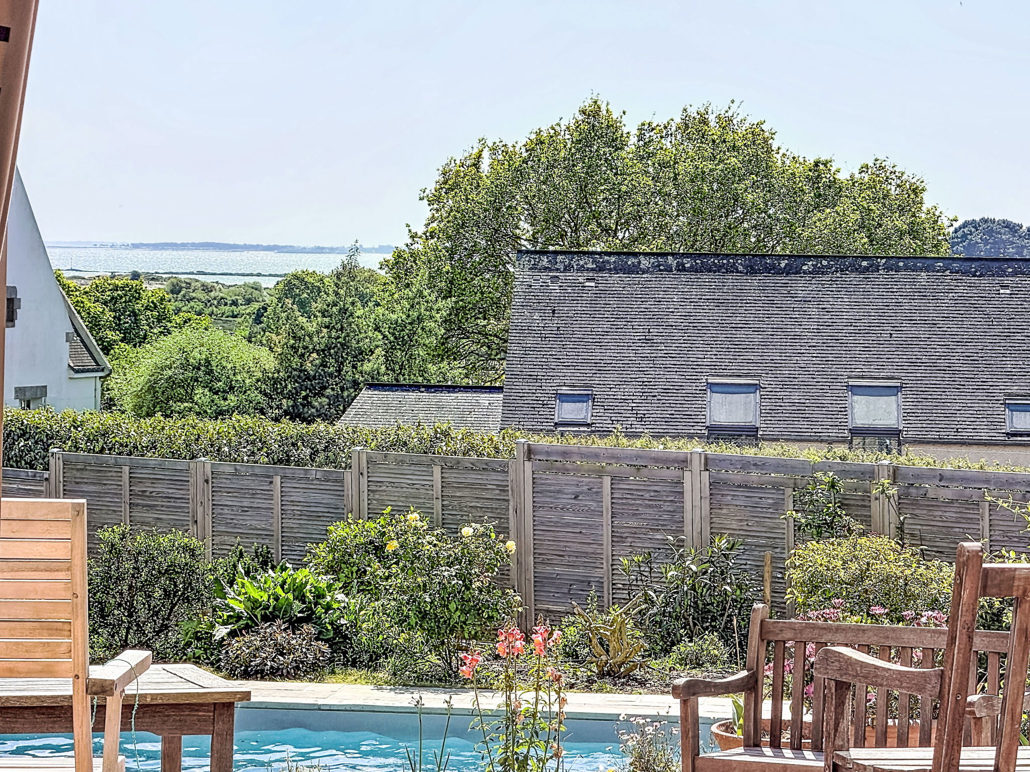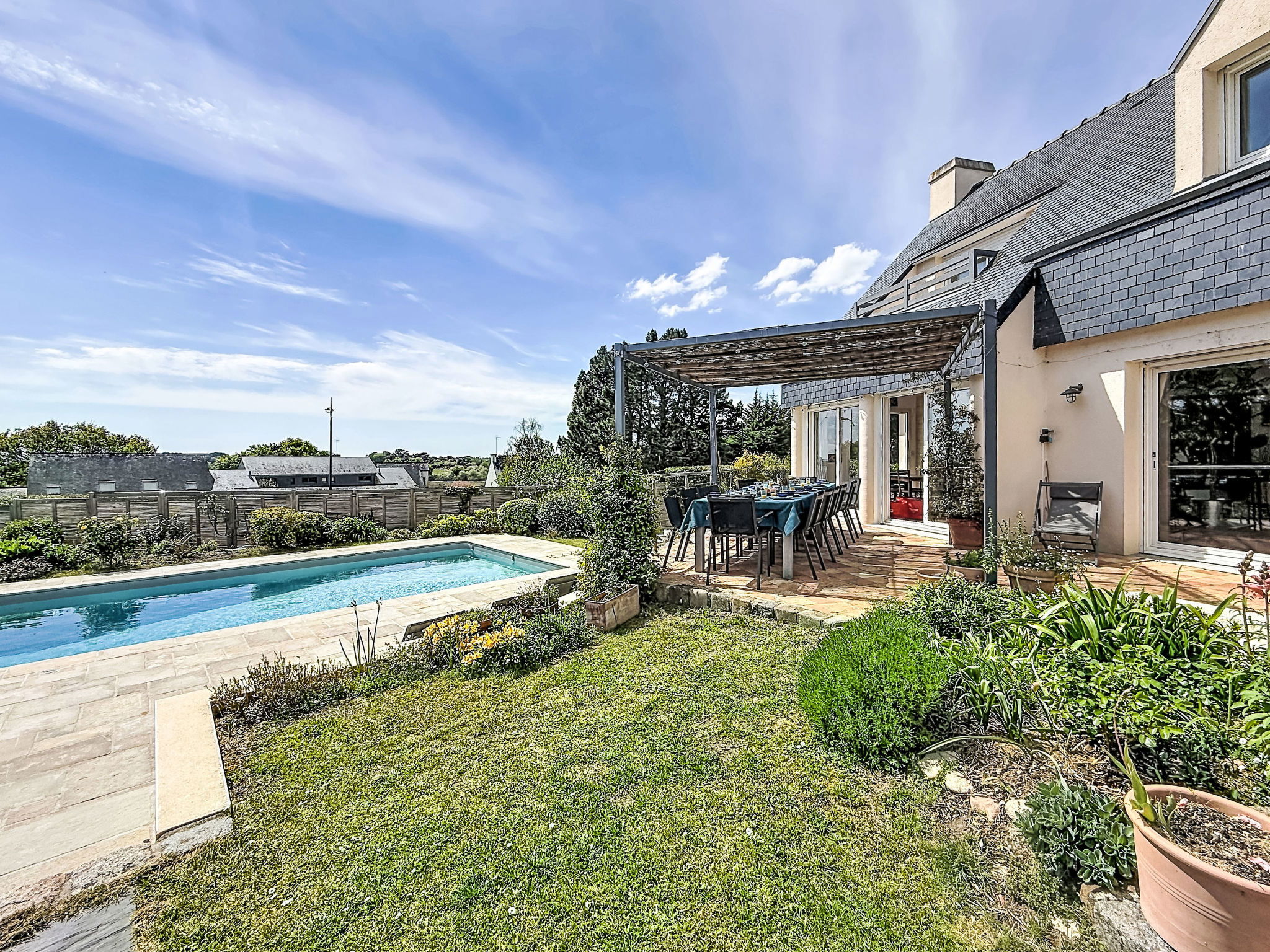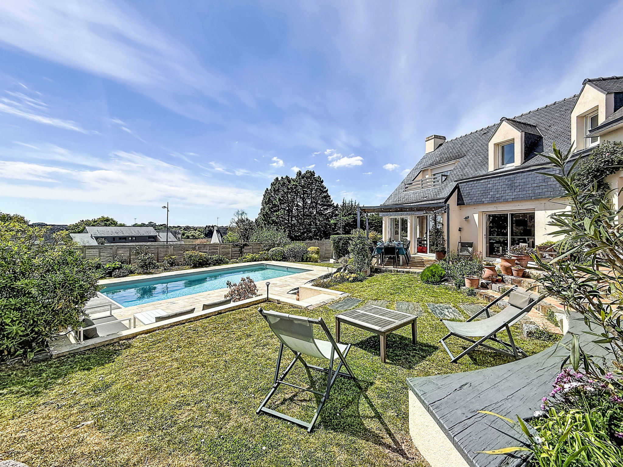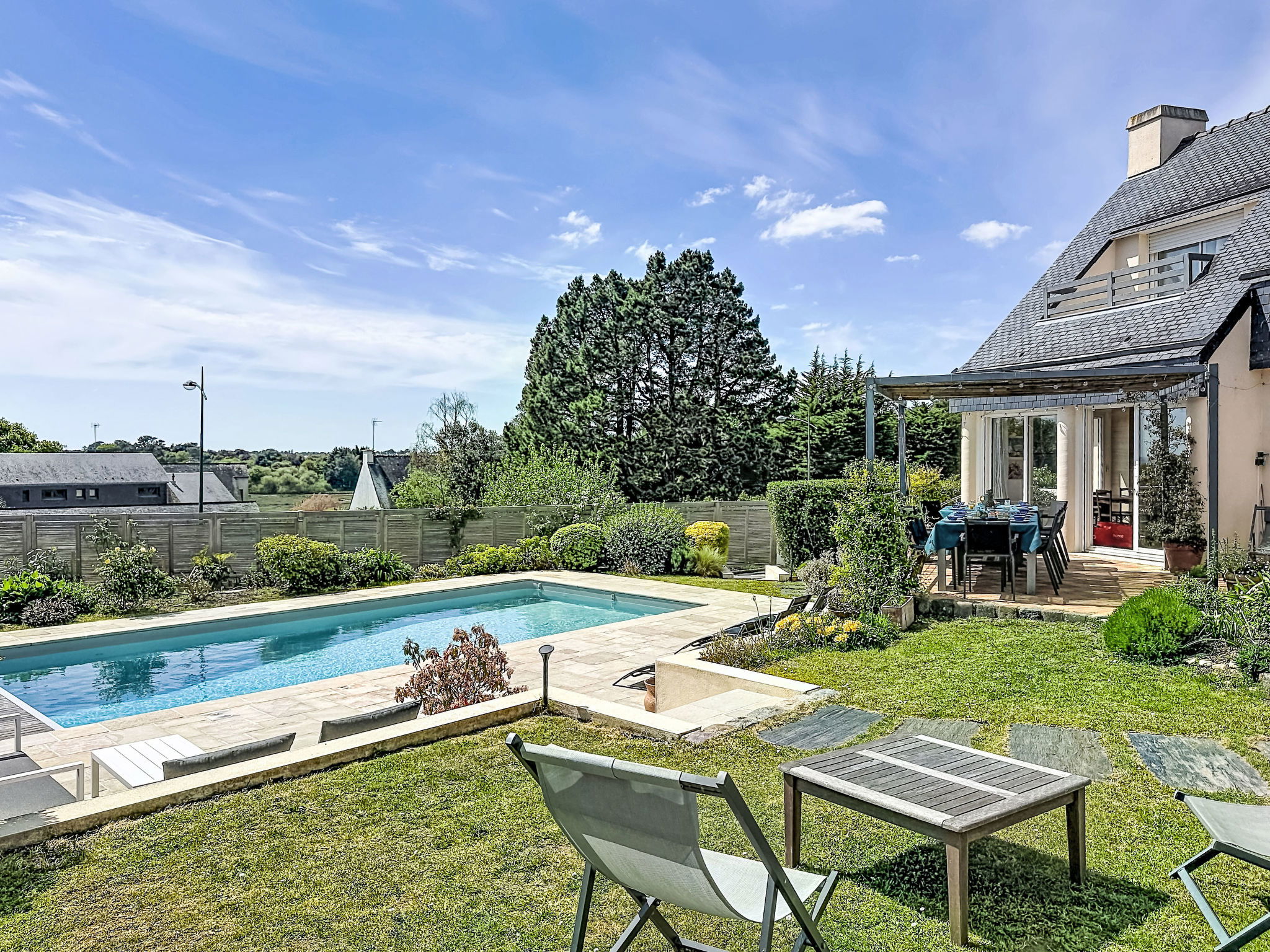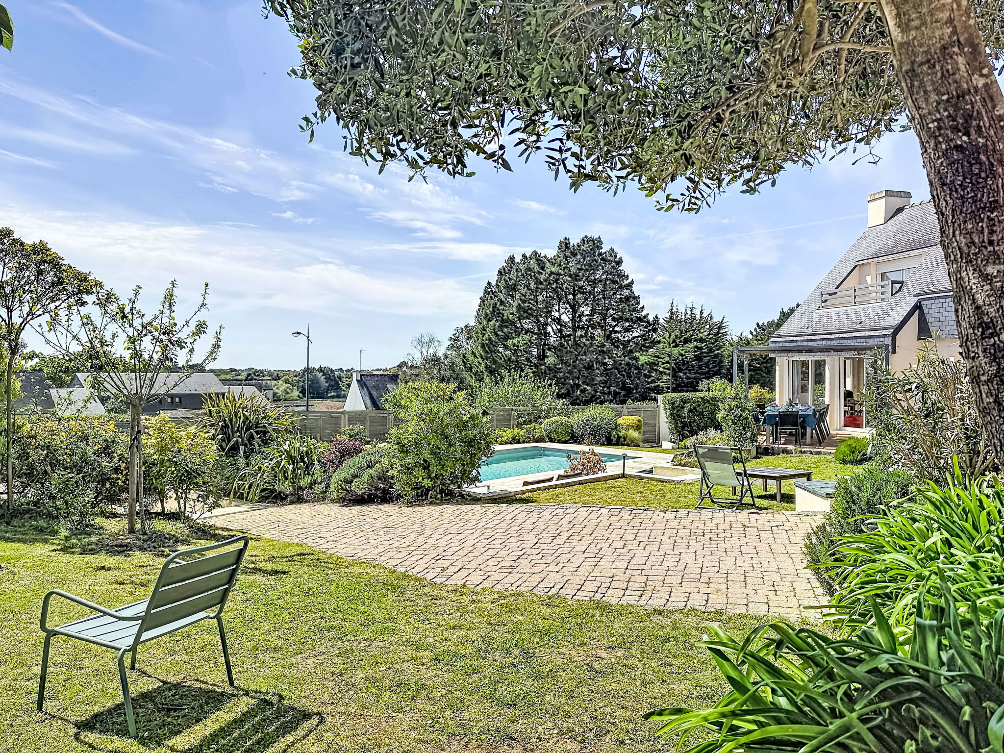 Villa "Villa Trugarez". Dans la localité, à 800 m du centre, à 900 m de la mer, à 2.5 km de la plage. A usage privé: terrain 1'200 m2 (clôturé), jardin entretenu, piscine rectangulaire, chauffée (4 x 9 m, profondeur 150 - 200 cm, disponibilité saisonnière: 01.Mai. - 30.Sep.) avec alarme de sécurité. Place de parking (pour 4 voitures) sur le terrain. Magasins, magasin d'alimentation, supermarché 800 m, restaurant 900 m, boulangerie 1 km, café 900 m, arrêt de bus 800 m, plage de sable "Port Biren" 2.5 km, centre thermal "Thalazur" 5 km. Port plaisance 900 m, terrain de golf (18 trous) 15 km, ecole de surf 9 km, ecole de voile 1.5 km, tennis 3 km. Attractions à proximité: Les alignements de Carnac 5 km, Presqu'île de Quiberon 13 km, Auray & Saint-Goustan 18 km, Vannes 32 km, Lorient 49 km. Région de randonnées: Golfe du Morbihan, Belle-île-en-mer.