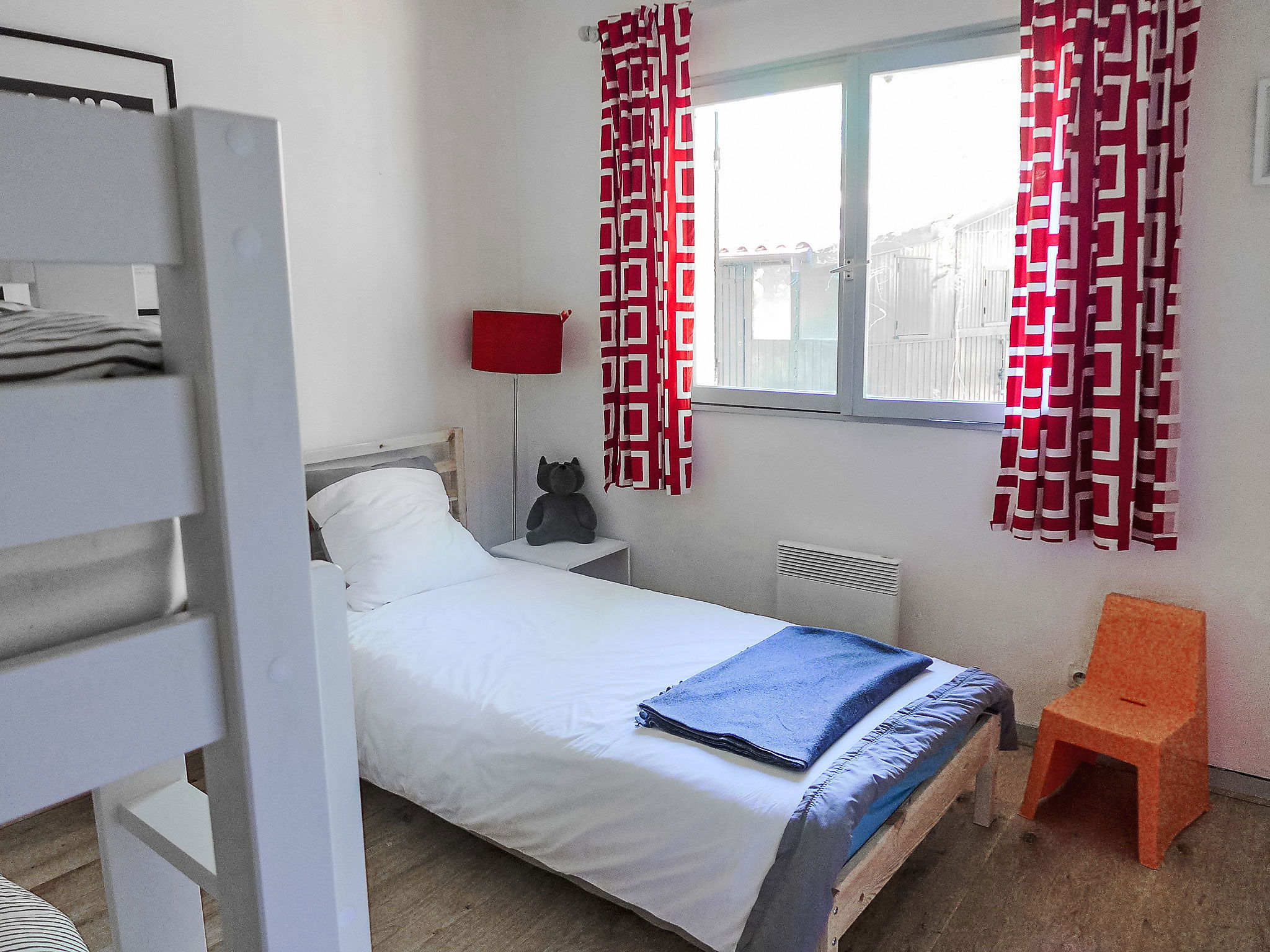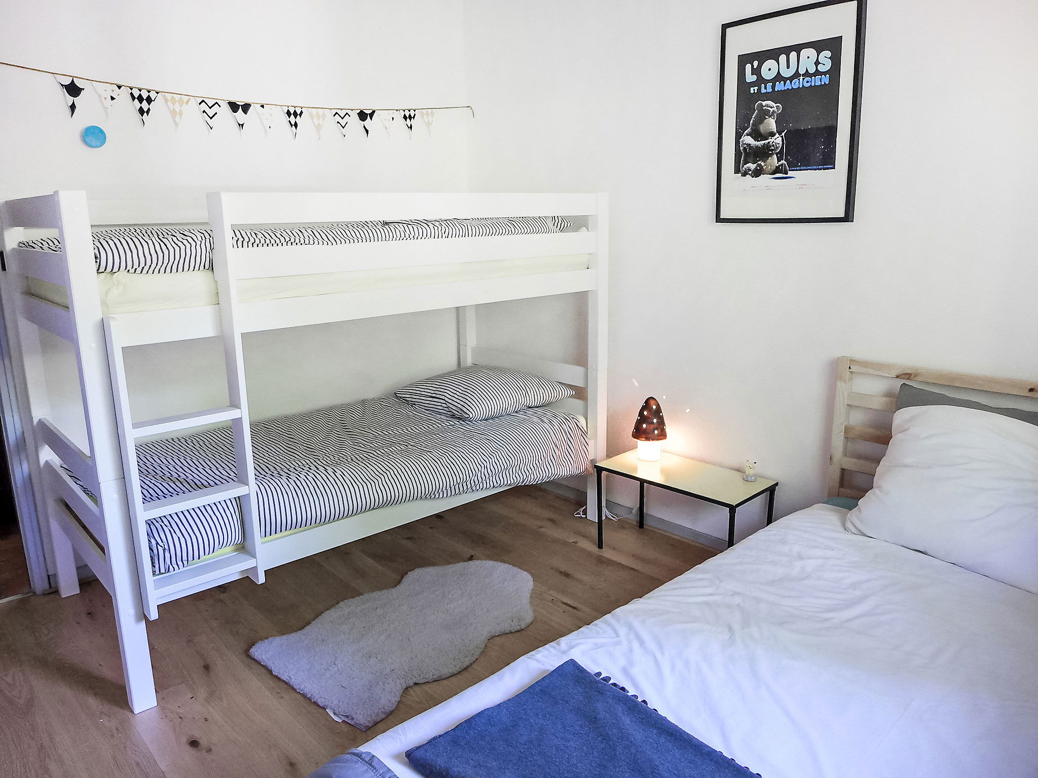 Maison 3 pièces 80 m2. Séjour/salle à manger avec 1 divan-lit (100 cm, longueur 190 cm), cheminée, TV, chaîne stéréo et DVD. Sortie sur la véranda. 1 chambre avec 1 grand-lit (1 x 160 cm, longueur 190 cm). 1 chambre avec 1 lit (90 cm, longueur 190 cm), 1 x 2 lits superposés (90 cm, longueur 190 cm). Cuisine ouverte (4 plaques de cuisson, four, lave-vaisselle, micro-ondes). Douche, WC séparé. Grande terrasse 24 m2, situation sud. Meubles de terrasse, chaises longues (3). A disposition: lave-linge. Internet (Connexion WIFI, en sus). Veuillez noter: logement non-fumeur. Maximum 1 animal/ chien autorisé. Détecteur de fumée.