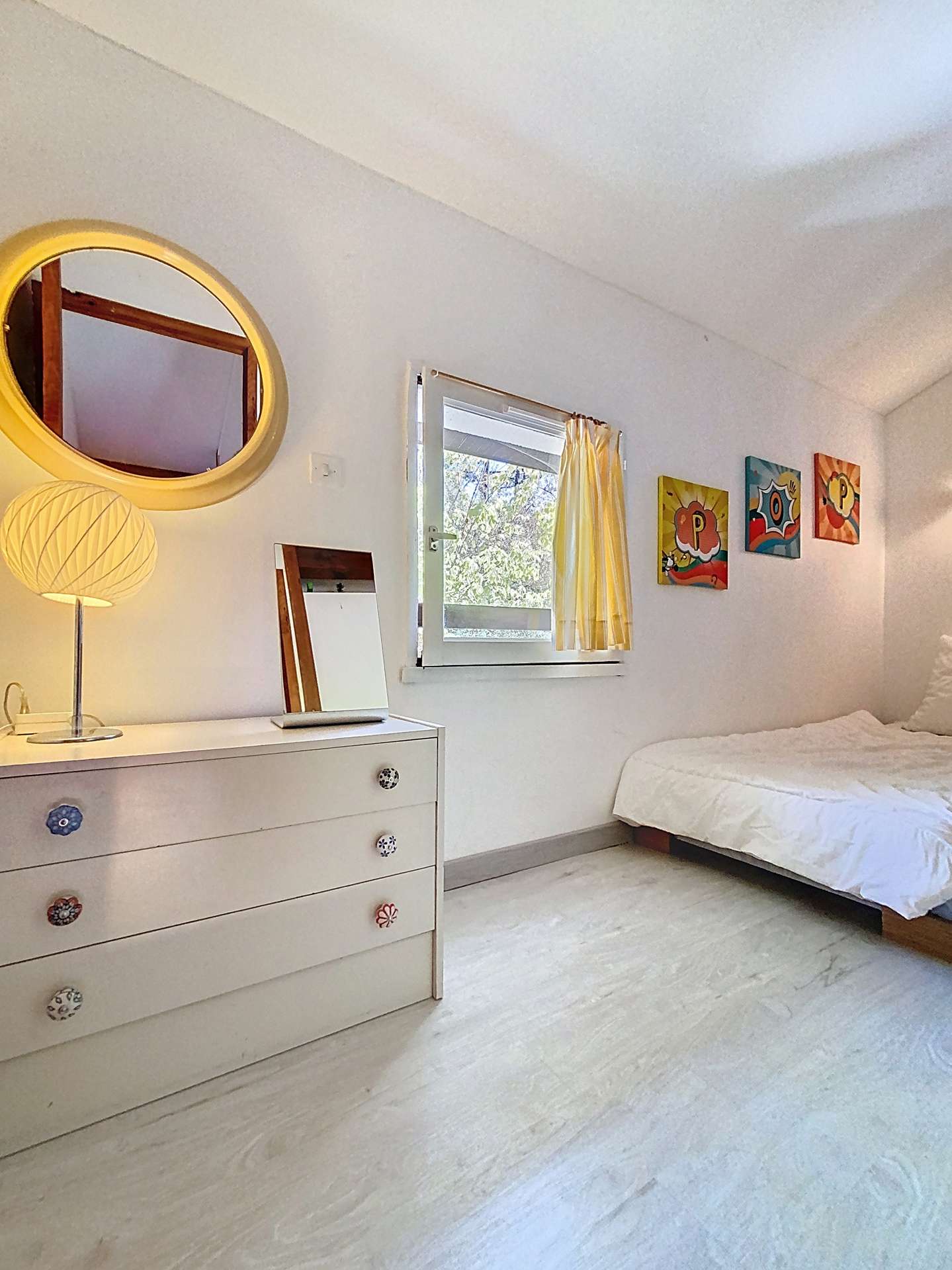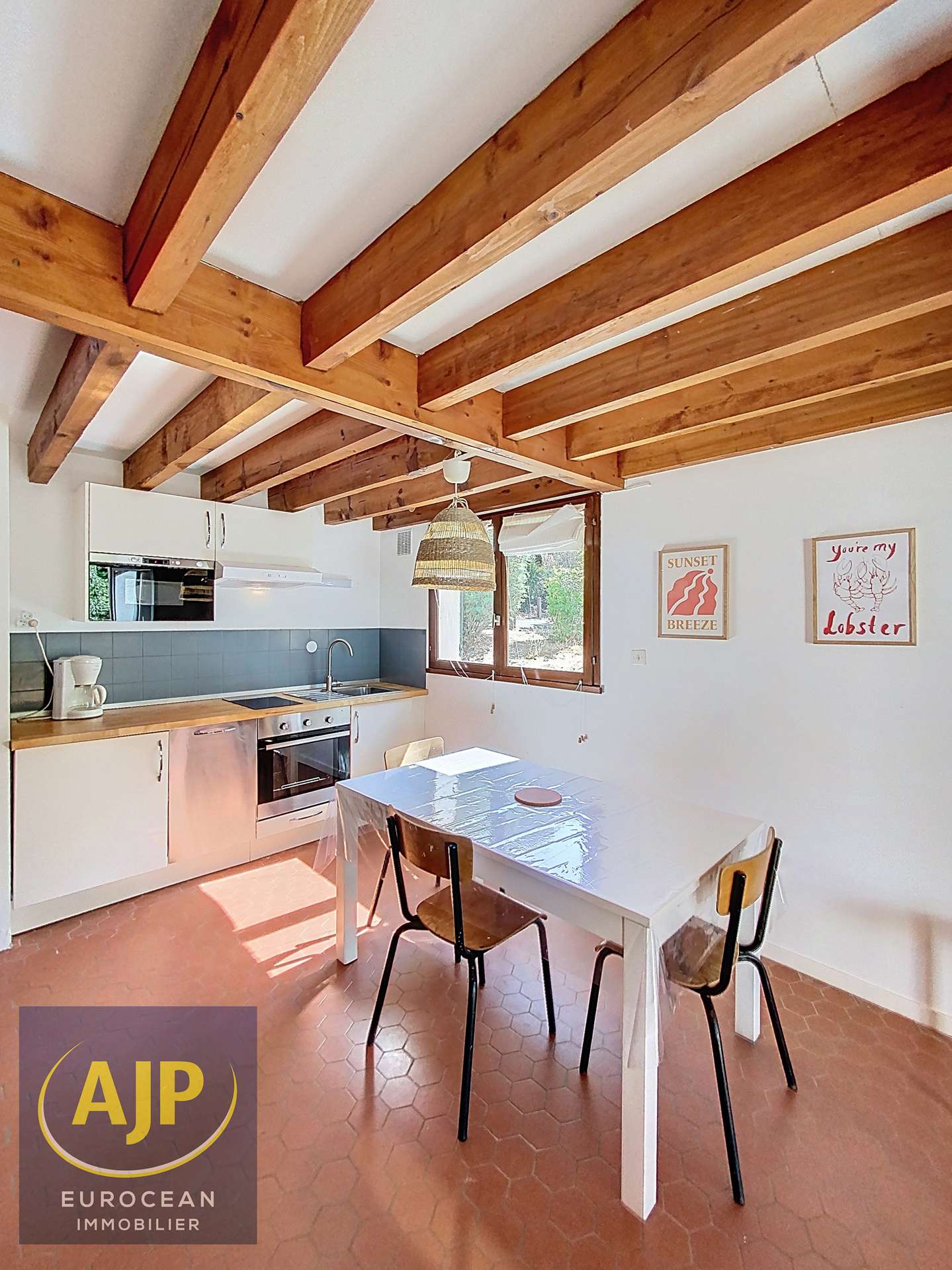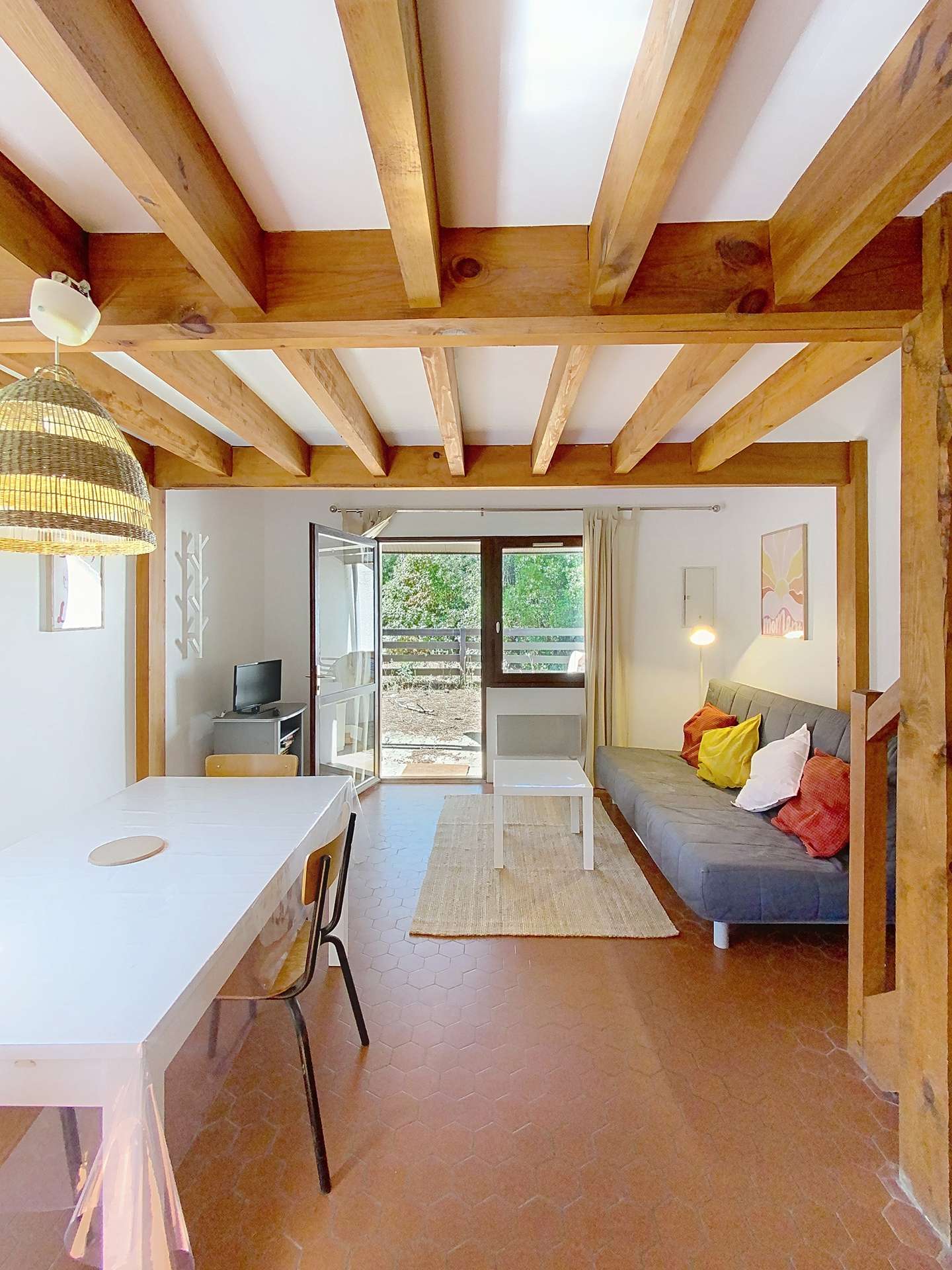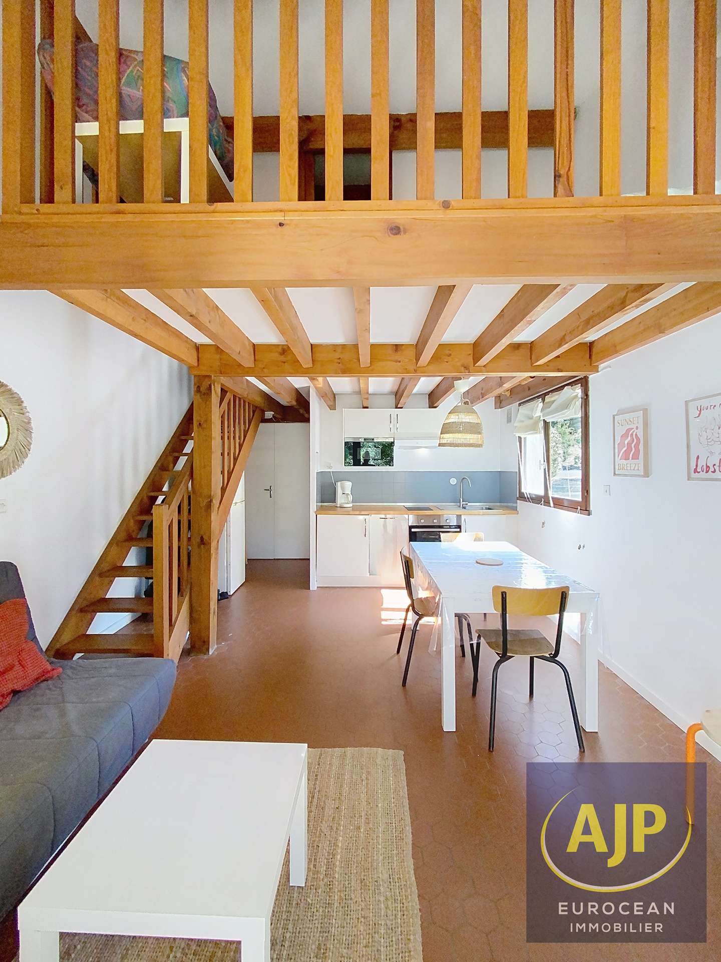 Résidence pietonne "Les As", quartier sud, secteur Pipeyrous, Maisonnette mitoyenne sur un côté, 40m², 2 niveaux pour l'accueil de 4/5 personnes. Le séjour lumineux (canapé convertible - couchage double occasionnel 160 cm) ouvre sur une grande terrasse, sans vis à vis (vue forêt) exposée sud. L'espace cuisine équipée est ouvert sur la pièce principale (lave linge - lave vaisselle). La mezzanine fermée en chambre traversante (lits superposés + 1 lit simple) donne sur un second espace couchage équipé d'un lit double 140 cm. Les sanitaires comprennent une baignoire, lavabo et WC. Kit bébé à disposition comprenant un lit parapluie et une chaise haute. Vous bénéficiez d'une place de parking à l'entrée de la résidence. Votre animal de compagnie est bienvenu au sein de cet hébergement. Rejoignez la plages, les commerces et les écoles de surf à 1,5 km, le golf à 2 km, le lac à 5 km (REF 01376M)