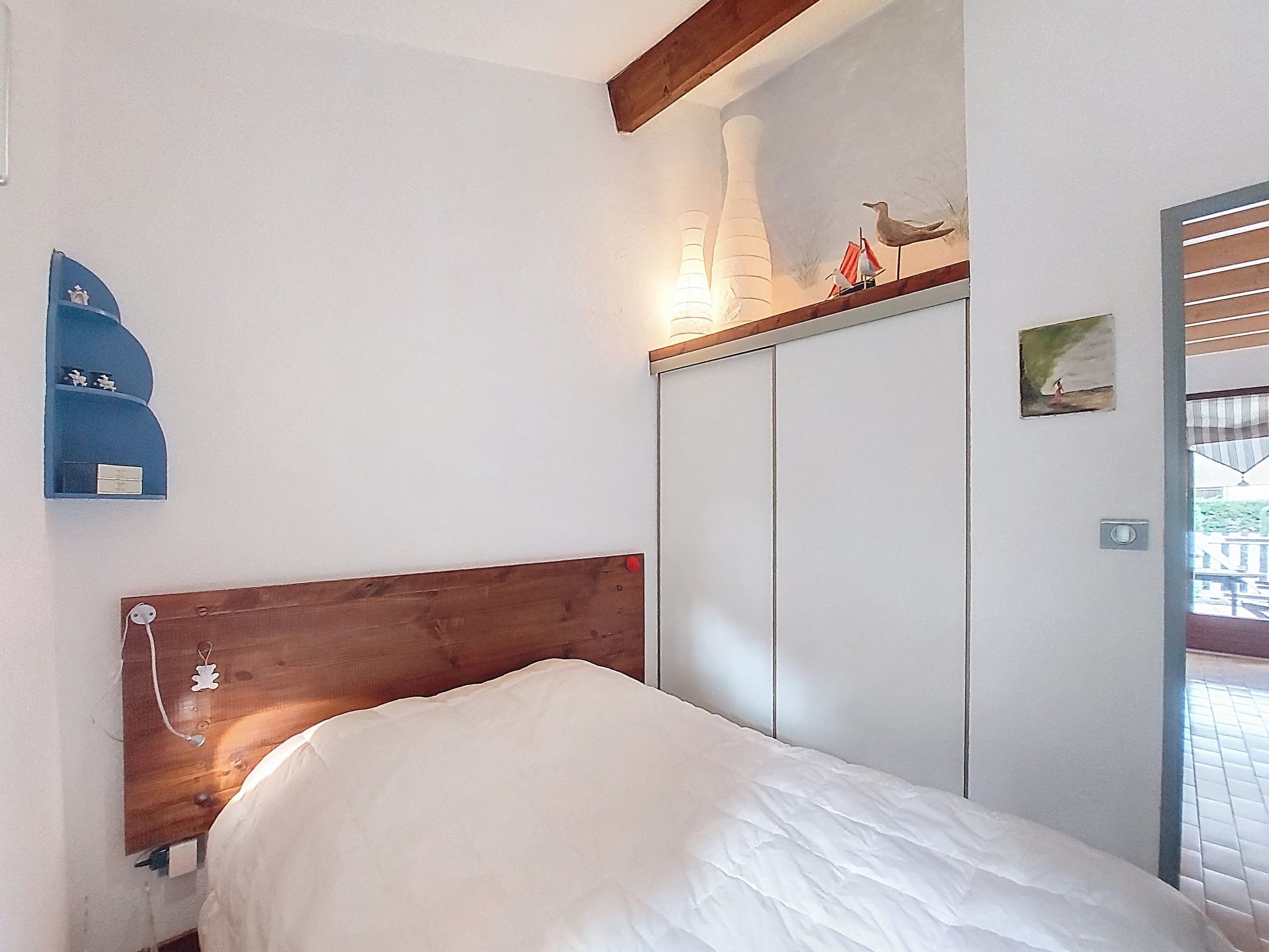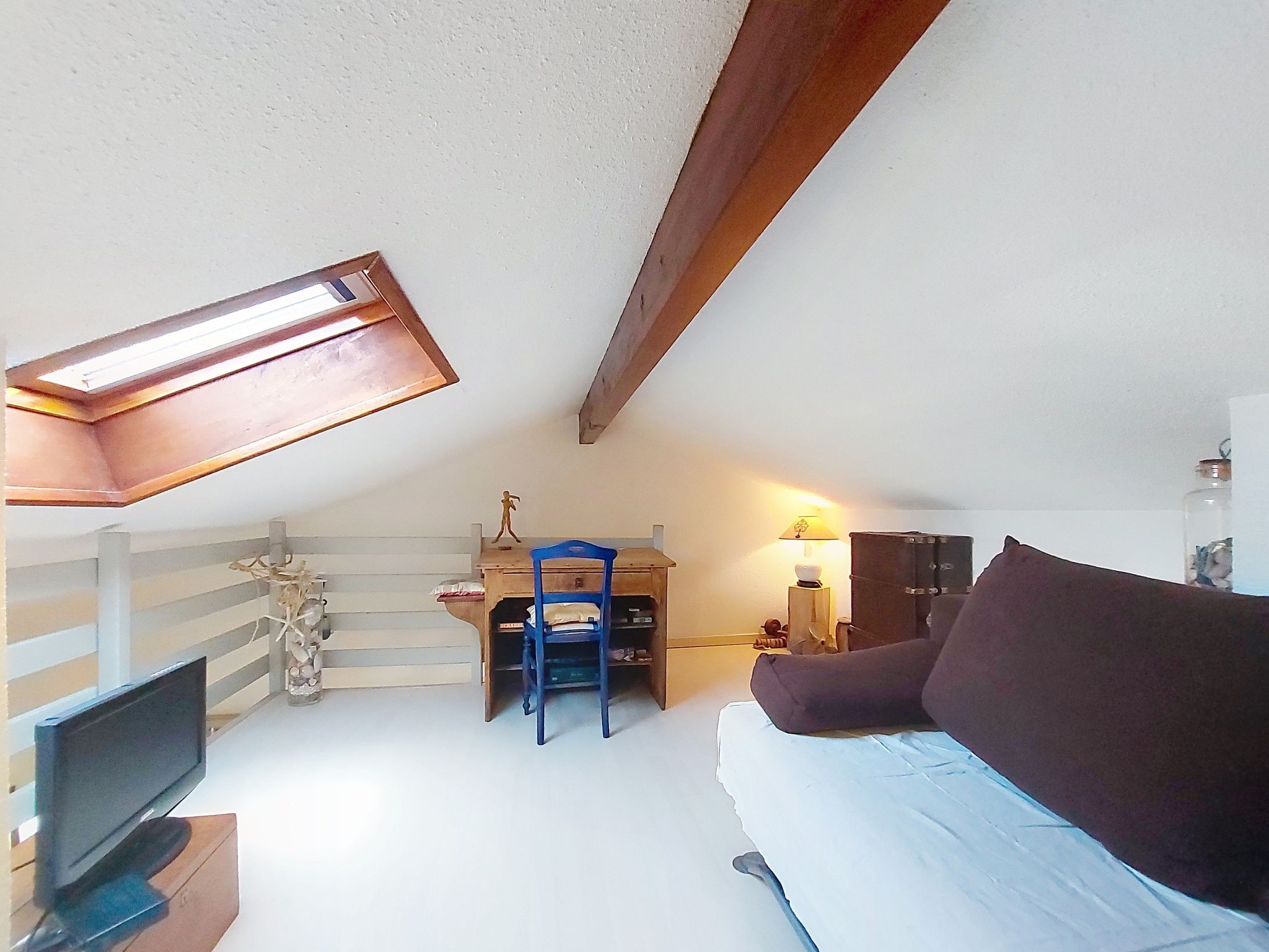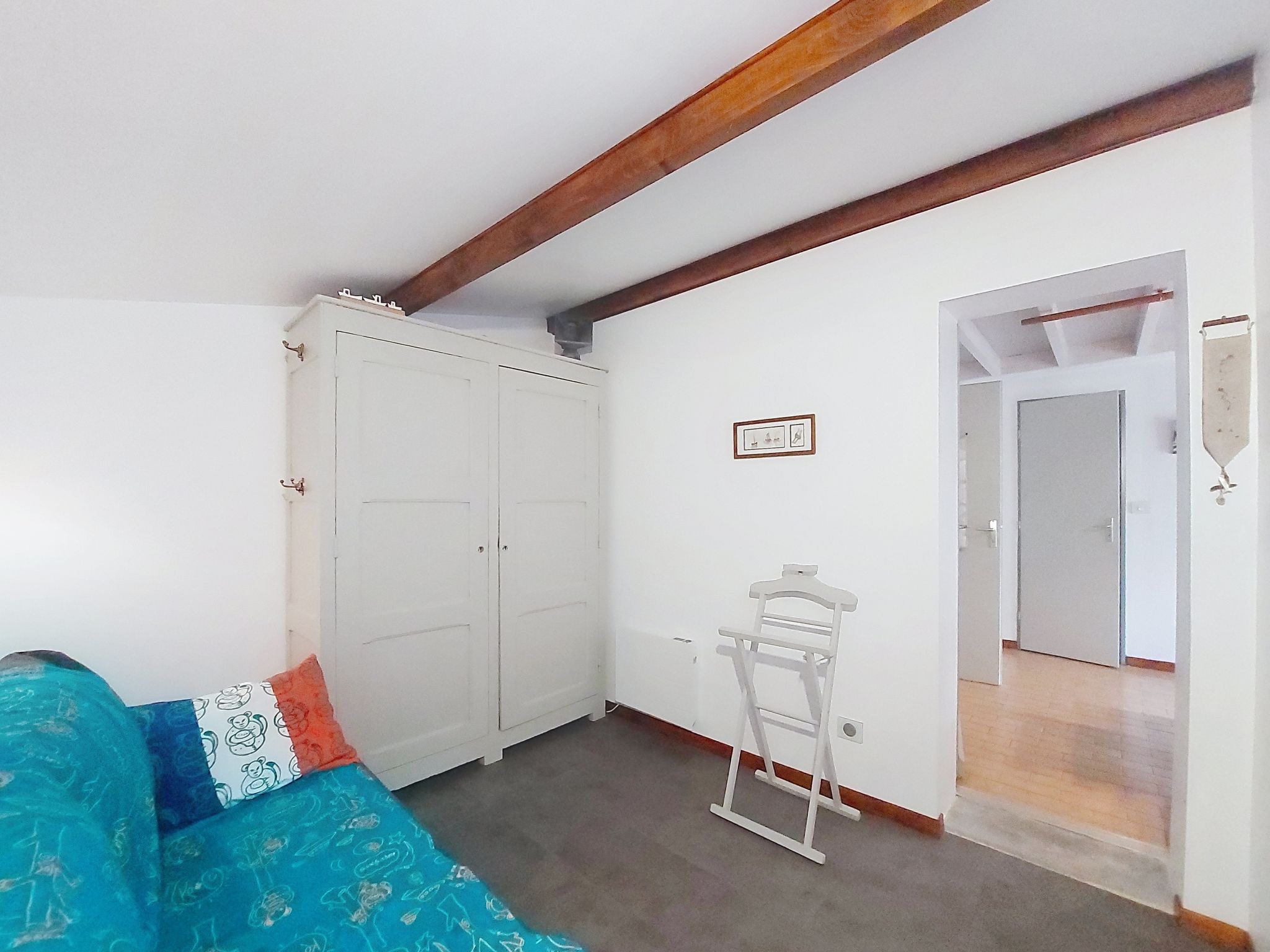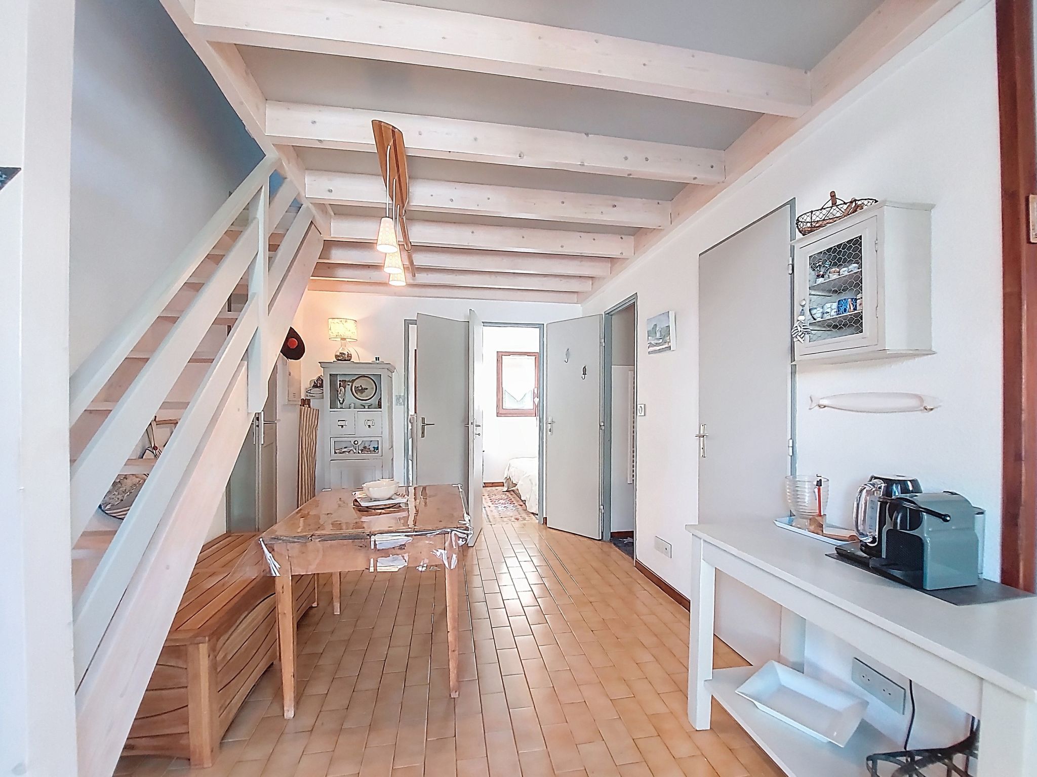 Maison mitoyenne 4 pièces 59 m2 sur 2 niveaux. Séjour/salle à manger. Sortie sur la terrasse. 1 chambre avec 1 grand-lit (1 x 140 cm, longueur 190 cm). 1 petite chambre d'enfants avec 1 x 2 lits superposés (90 cm, longueur 190 cm). Chambre avec passage, sans fenêtre avec 1 divan-lit double (1 x 140 cm, longueur 190 cm). Coin cuisine (2 plaques vitrocéramiques, grille-pain, bouilloire électrique, micro-ondes, cafetière électrique). Salle de bains, WC séparé. Chauffage électrique. À l'étage supérieur: galerie mansardée avec TV (écran plat). Terrasse 15 m2, jardinet 50 m2. Meubles de terrasse, barbecue. A disposition: Internet (Connexion WIFI, en sus). Place de parking No 17. Veuillez noter: logement non-fumeur. 1 animal/ chien de petite taille autorisé. Détecteur de fumée. Annonce d'un particulier (art 155, IV du CGI).