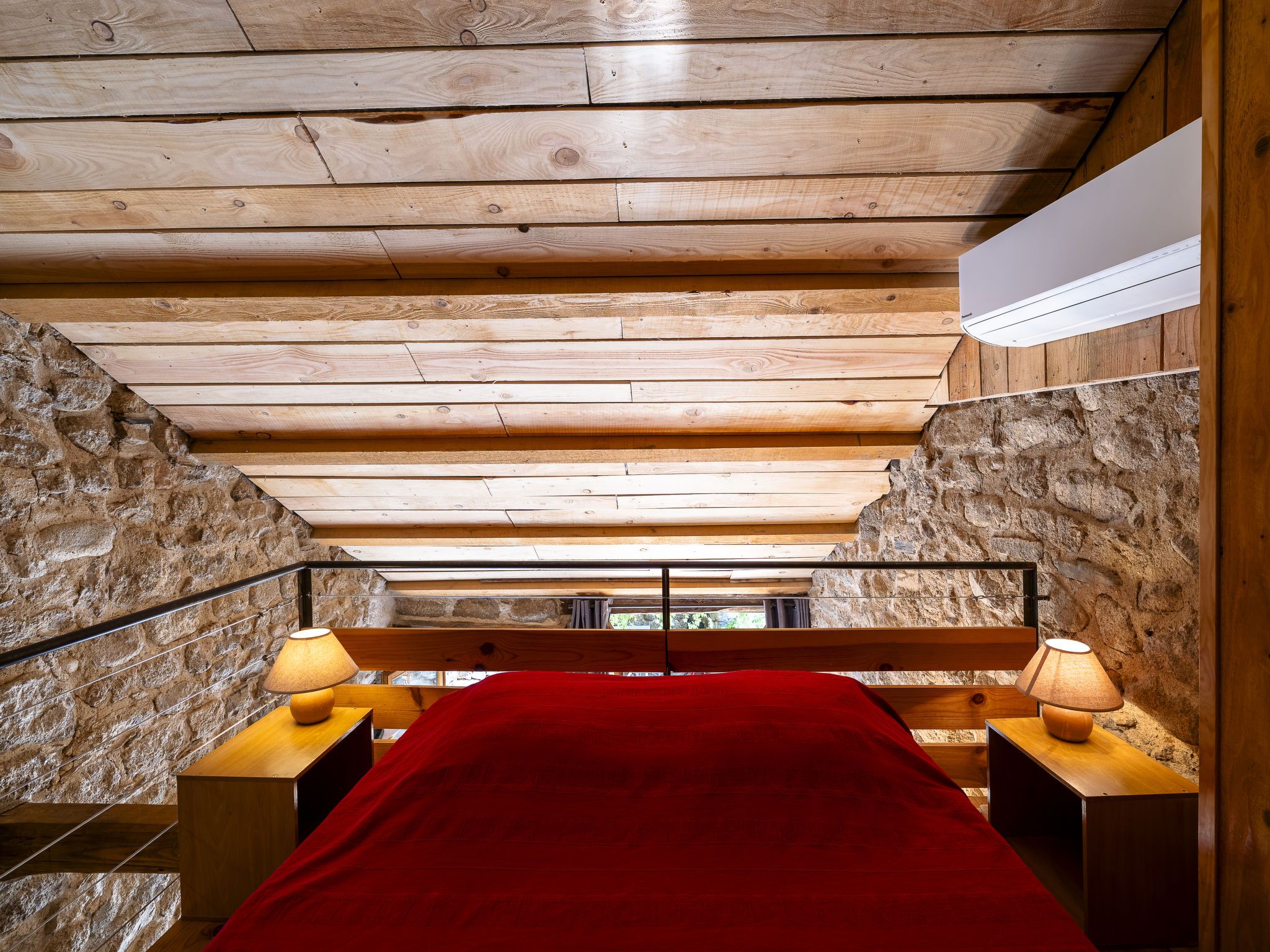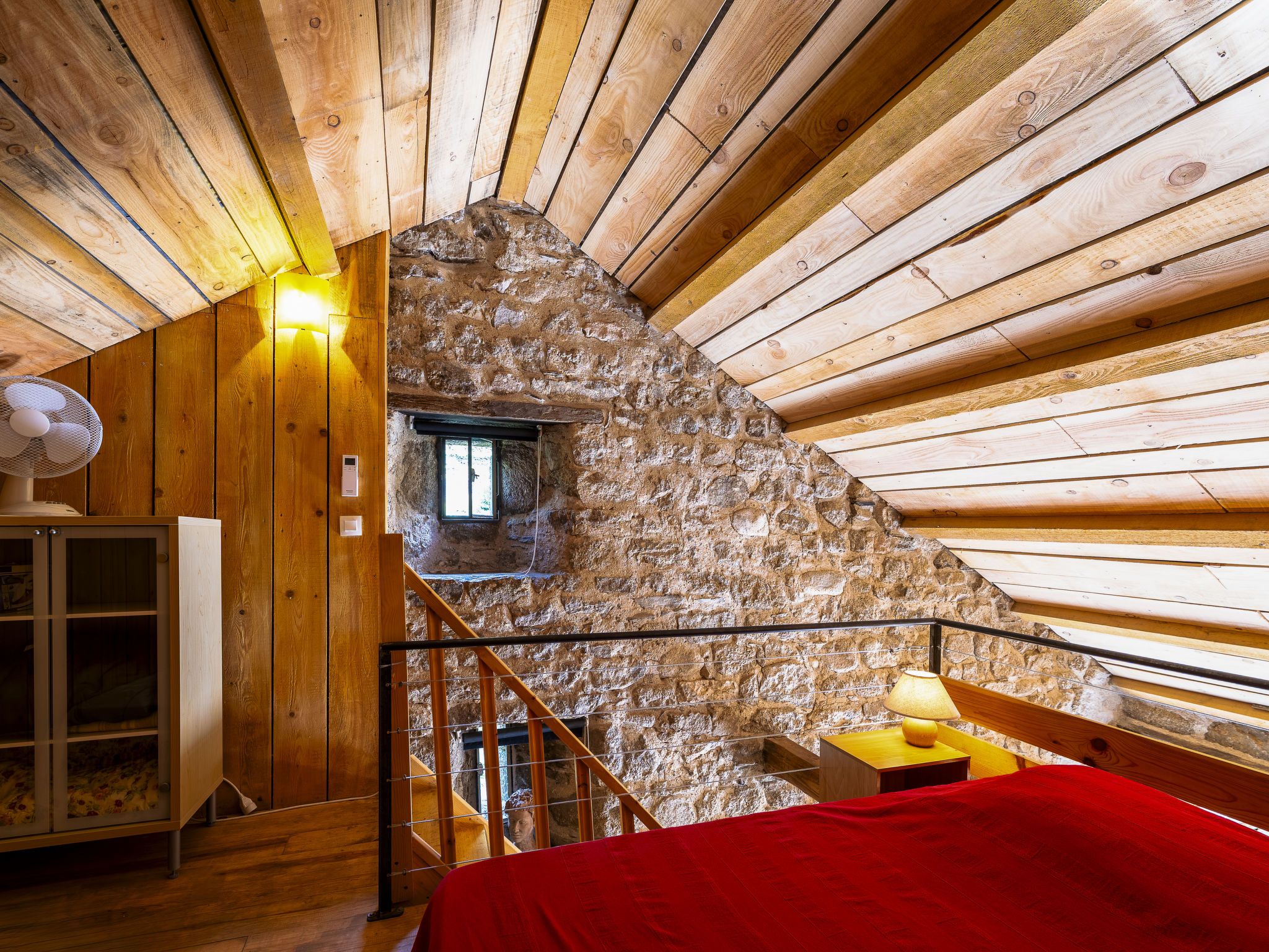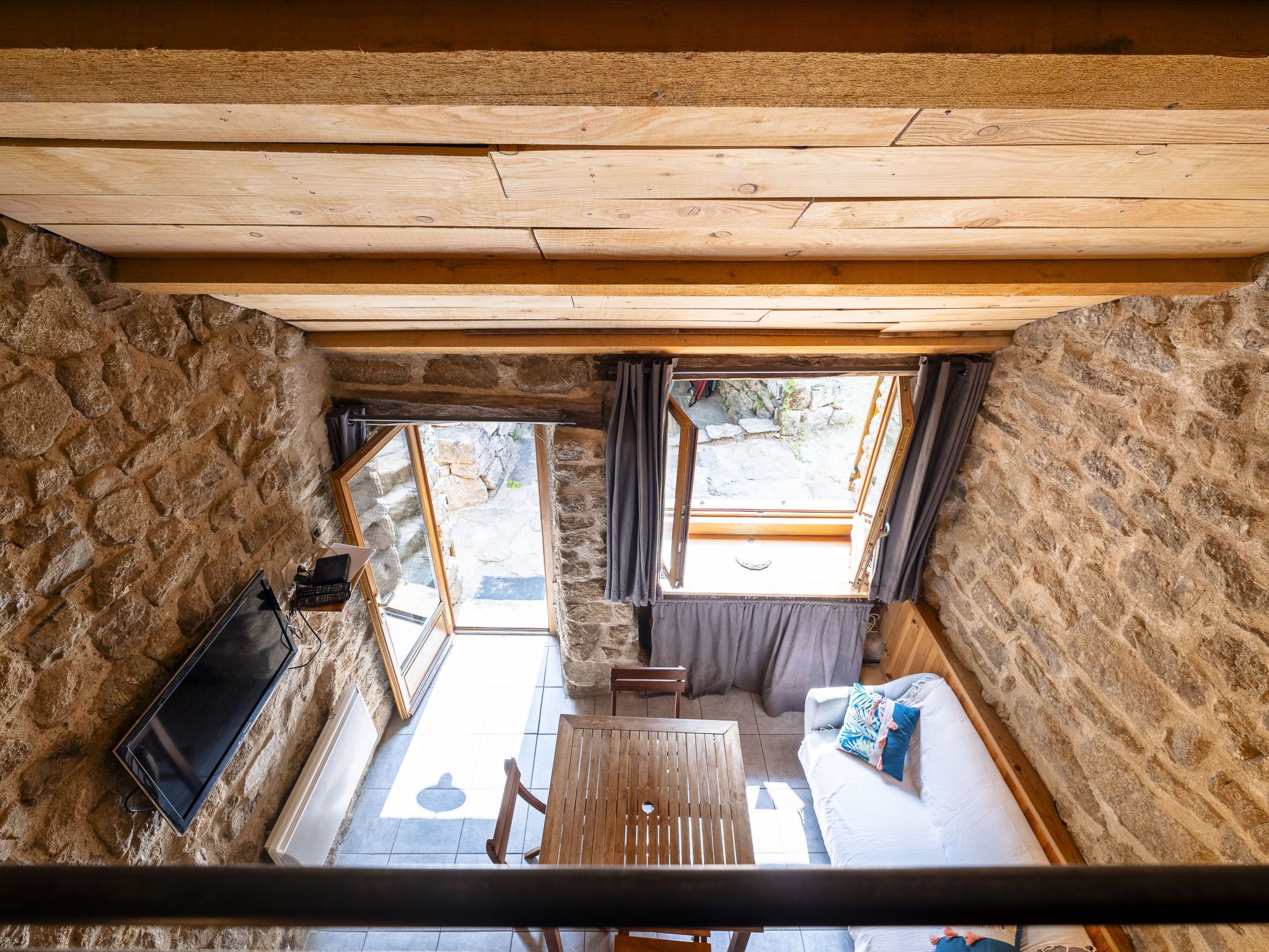 "Chassezac", maison studio 30 m2 sur 2 niveaux. Aménagement fonctionnel et rustique: séjour/salle à manger avec table pour les repas, TV (satellite), air-conditionné et ventilateur. Sortie sur la terrasse. Coin cuisine (1 plaque de cuisson, four, Poêle à gaz, 3 feux, grille-pain, bouilloire électrique, micro-ondes, congélateur, cafetière électrique). Douche/WC. Chauffage électrique. À l'étage supérieur: galerie ouverte avec 1 lit (90 cm, longueur 190 cm), 1 grand-lit (140 cm, longueur 190 cm), air-conditionné. Terrasse. Meubles de terrasse, barbecue (portable). A disposition: lave-linge. Veuillez noter: maison non-fumeur. Maximum 1 animal/ chien autorisé. Détecteur de fumée. Au lieu d'une chambre fermée, des espaces de couchage sont situés dans une zone ouverte (galerie, alcôve...). Annonce d'un particulier (art 155, IV du CGI). FR4659.702.1