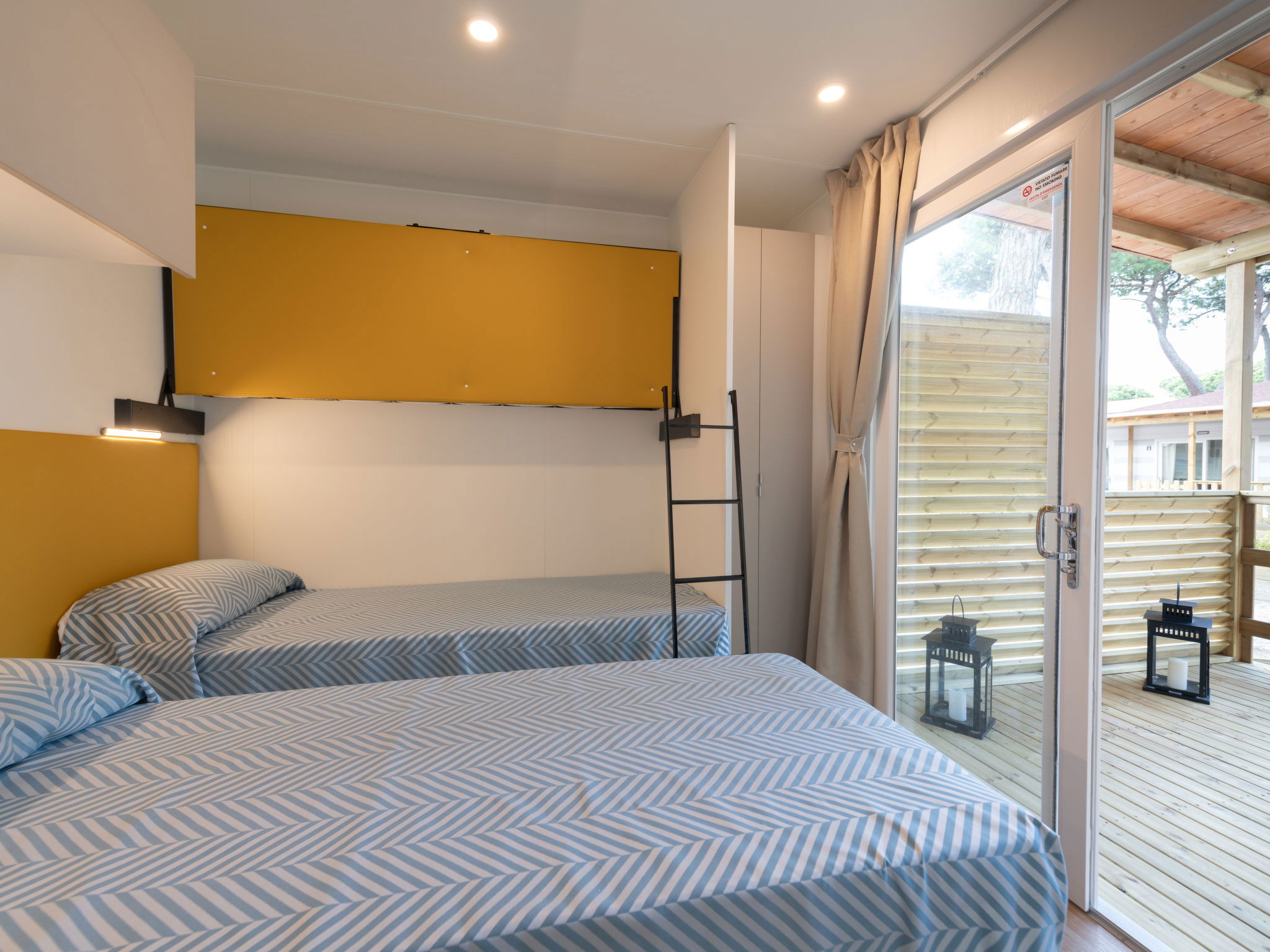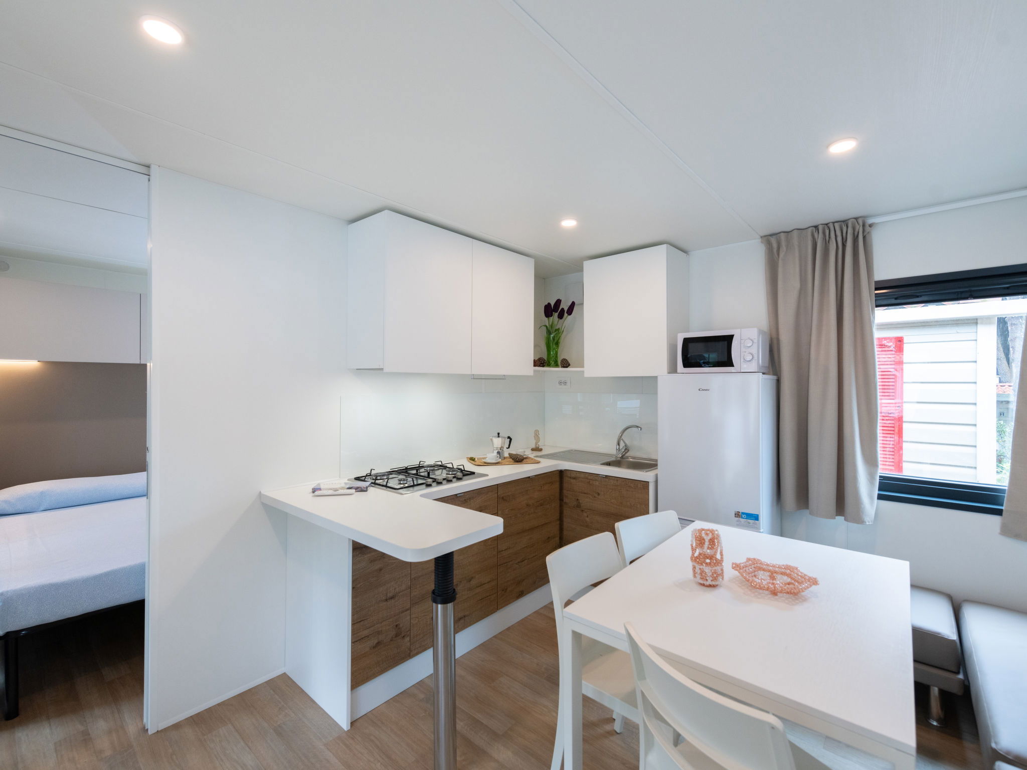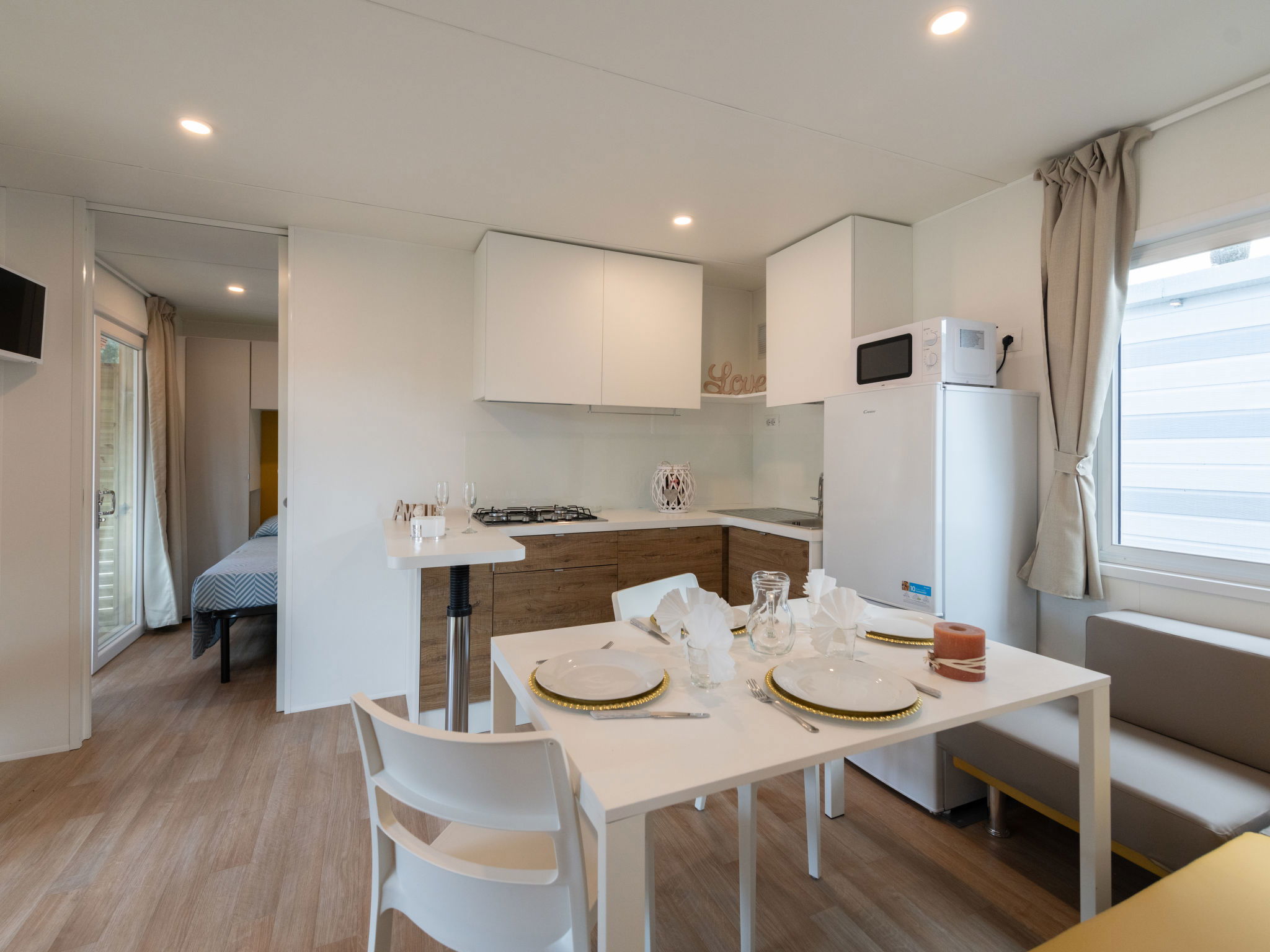 "Ambra", 3 pièces mobil home 34 m2. Logement idéal pour 4 adultes + 1 enfant. Aménagement moderne: séjour/salle à manger avec TV (satellite), air-conditionné et chauffage à air chaud. Sortie sur la véranda. 1 chambre double avec douche/bidet/WC. Sortie sur la véranda. 1 chambre avec 2 lits et 1 x 1 lits superposés, douche/WC. Sortie sur la véranda. Cuisine ouverte (4 feux, micro-ondes). Douche/bidet/WC. Air-conditionné, chauffage à air chaud. Terrasse couverte. Meubles de terrasse. Place de parking (1 Voiture). Maximum 1 animal/ chien autorisé. IT038006B17TCUP7WY